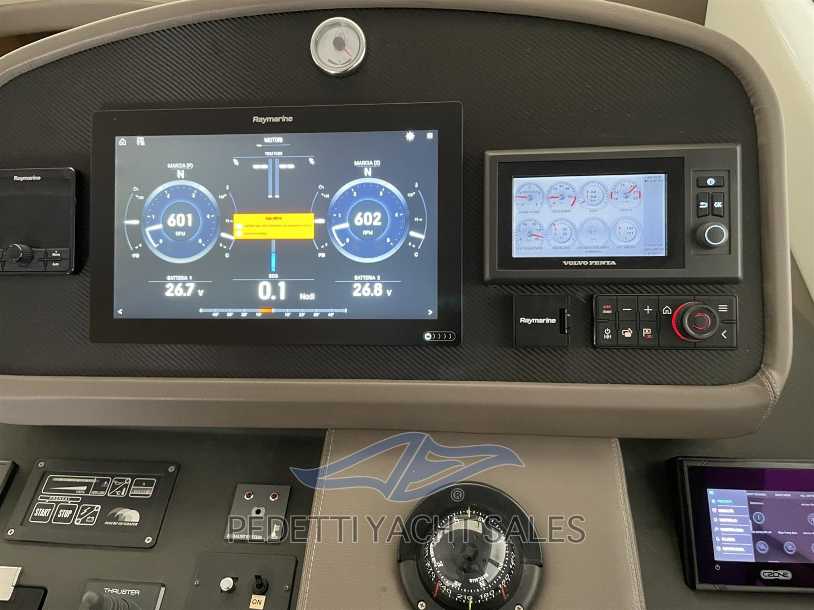 Alarme moteur, Alarme de pompe de cale, Ancre (30 Kg), Eau sous pression, 6 Batteries, Douche de cockpit, Flaps électriques, Extincteur(s) fixe(s), Indicateurs de flaps, Éclairage de courtoisie (a led), Passerelle (Besenzoni PI 489), 4 Pompe de cale automatique, Cockpit en teck, Prise de quai, Guindeau électrique (1500 watt), Echelle de bain, table de cockpit, Corne, 2 Winch électrique arrière (a poppa).
