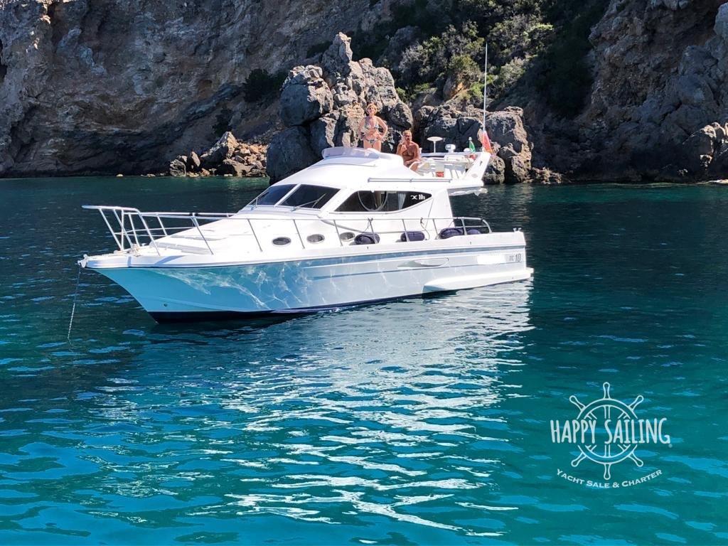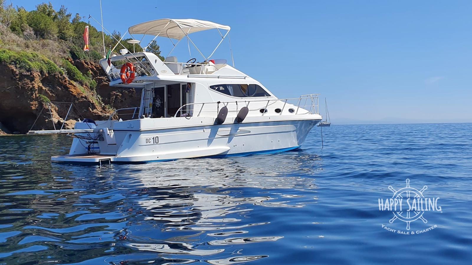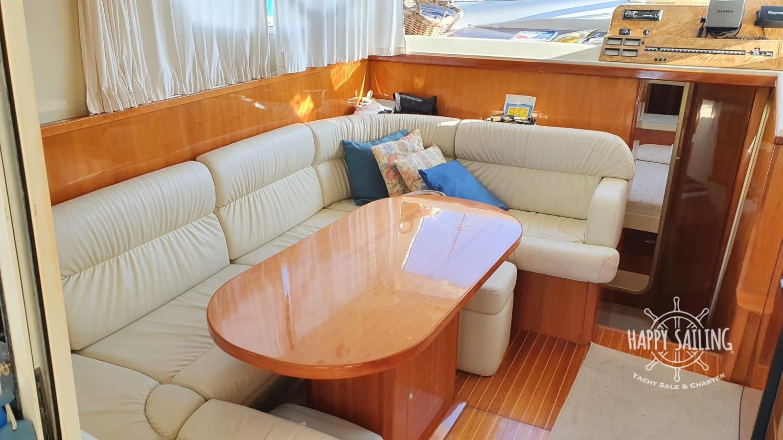 Alarme moteur, Alarme de pompe de cale, Eau sous pression, Chargeur de batterie (Elettrico), Douche de cockpit, Double barre à roue, Flaps hydrauliques, Passerelle (idraulica), Plateforme arrière (in teak), Pompe de cale manuelle, Porte latérale, Cockpit en teck, Prise de quai, Guindeau électrique, Echelle de bain.