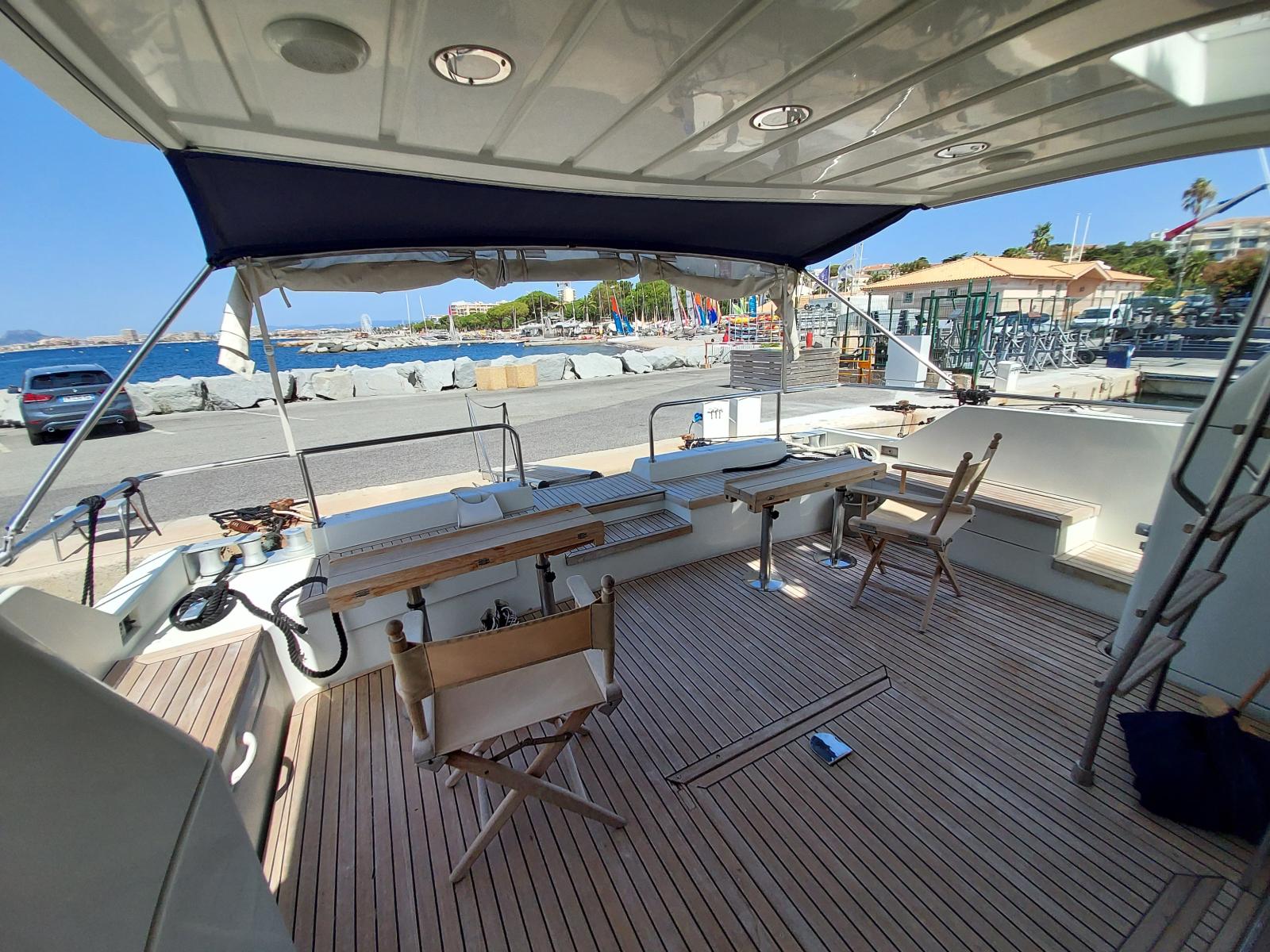 Flybridge spacieux avec table et bain de soleil.