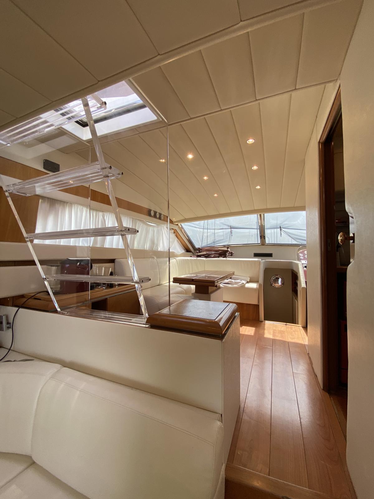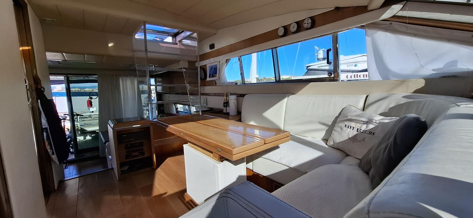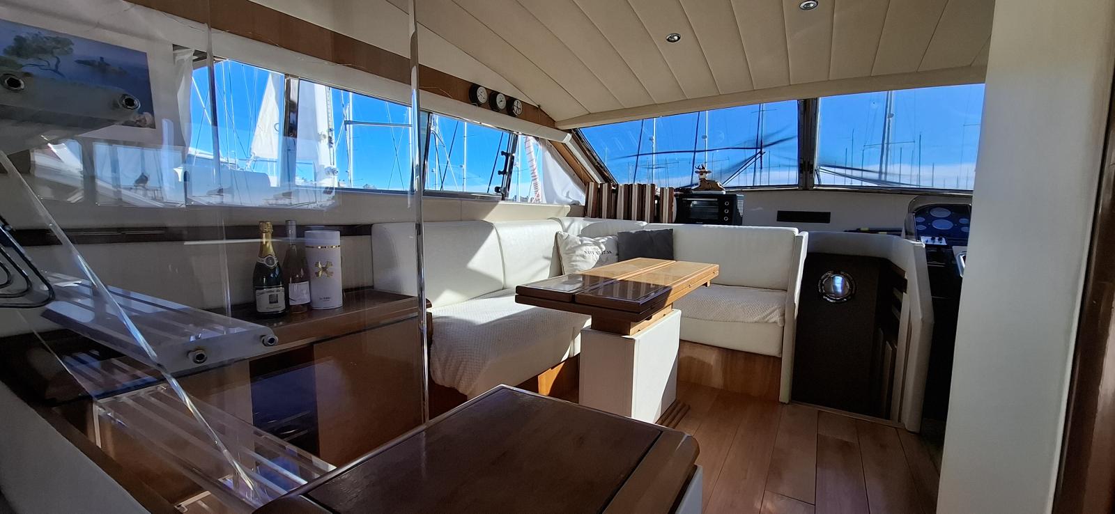 Le Flybridge vous séduira avec son poste de pilotage secondaire, ses sièges confortables et son espace pour la détente ou les repas en plein air. À l’intérieur, vous trouverez un salon lumineux avec une vue panoramique, une cuisine équipée et des cabines luxueuses pouvant accueillir jusqu’à [nombre de personnes/cabines].