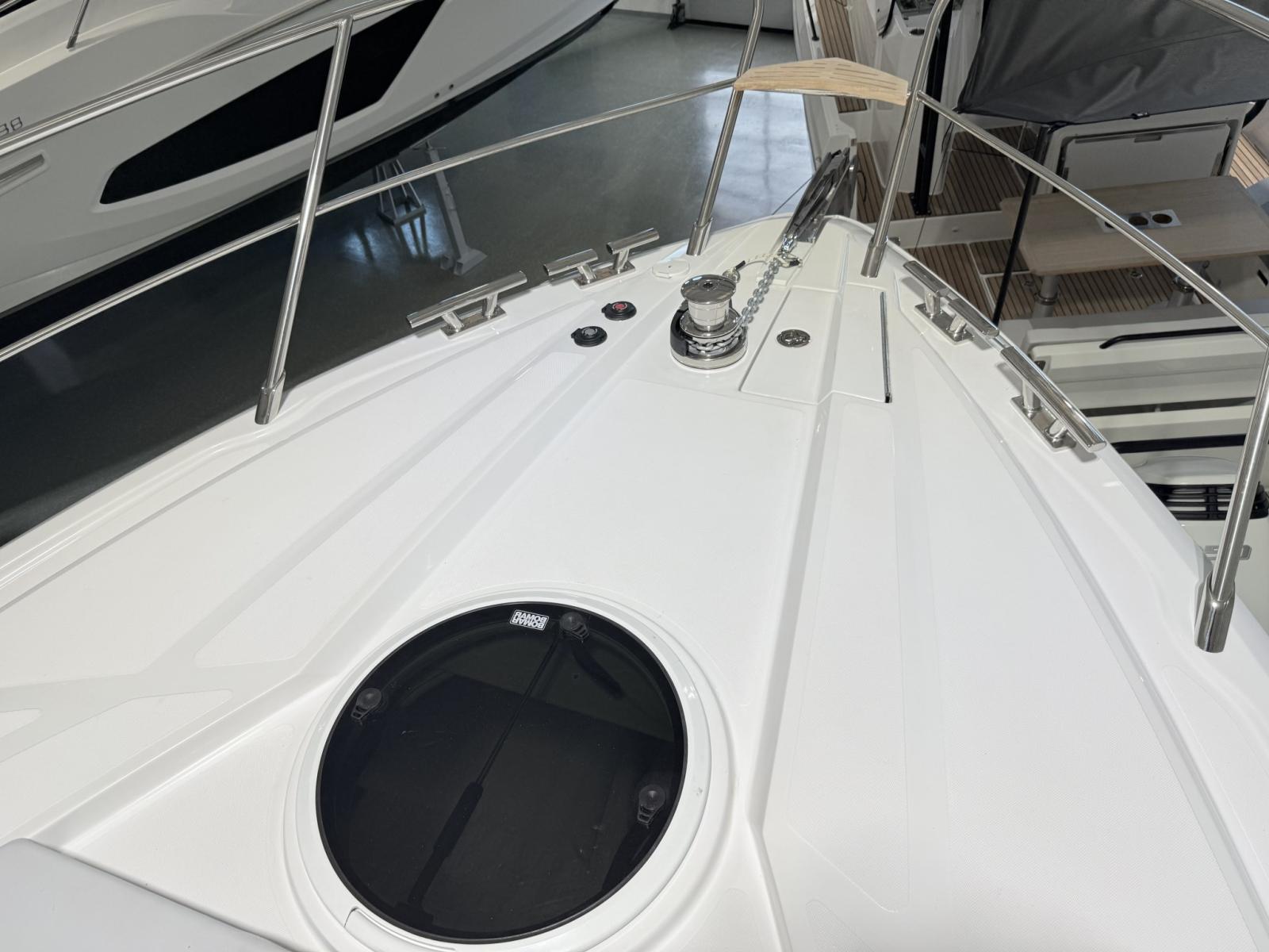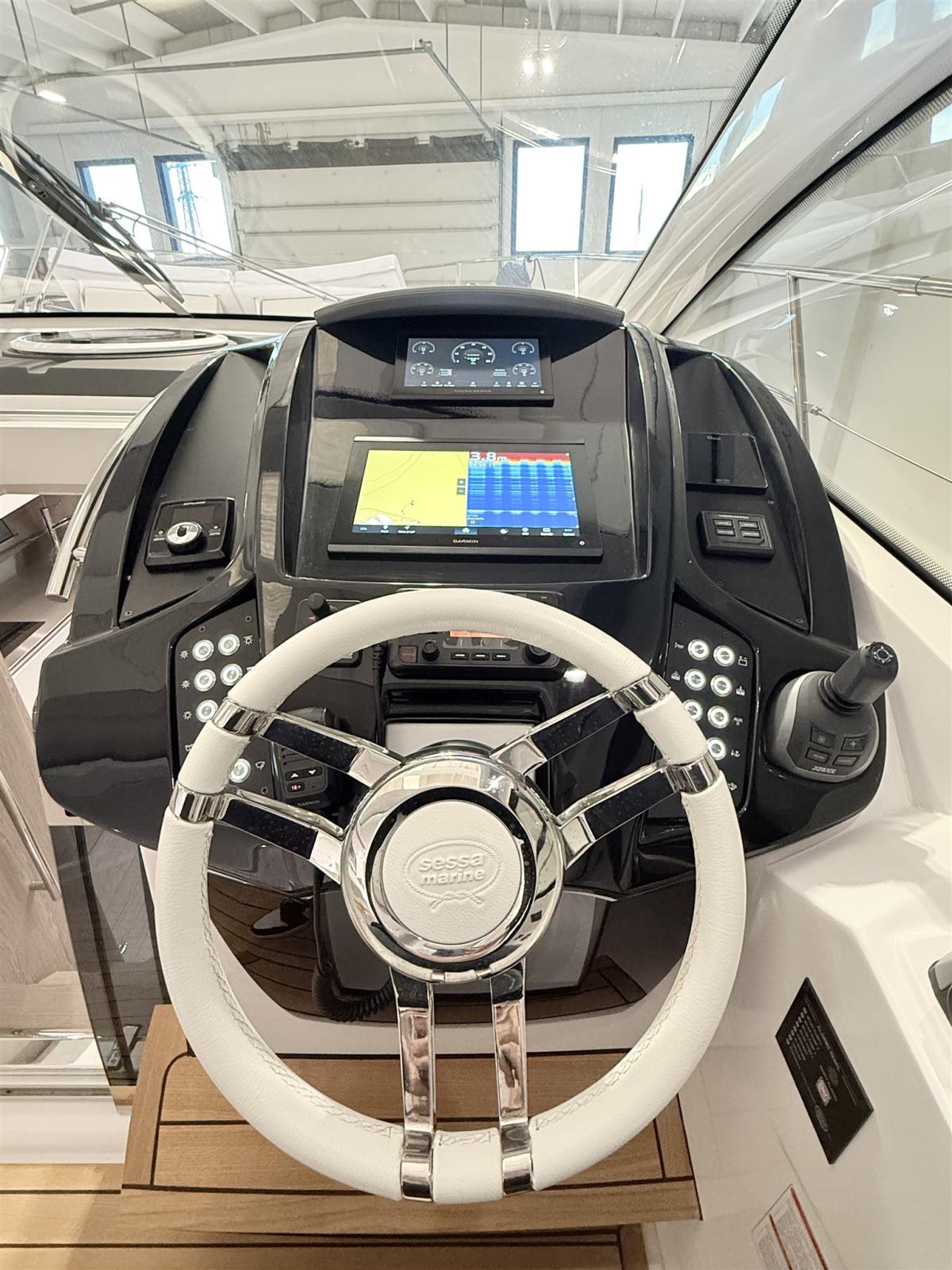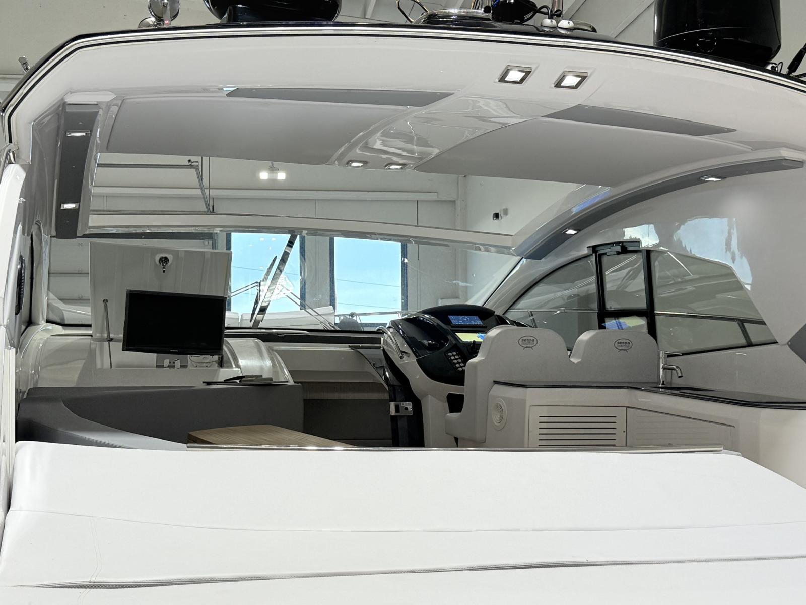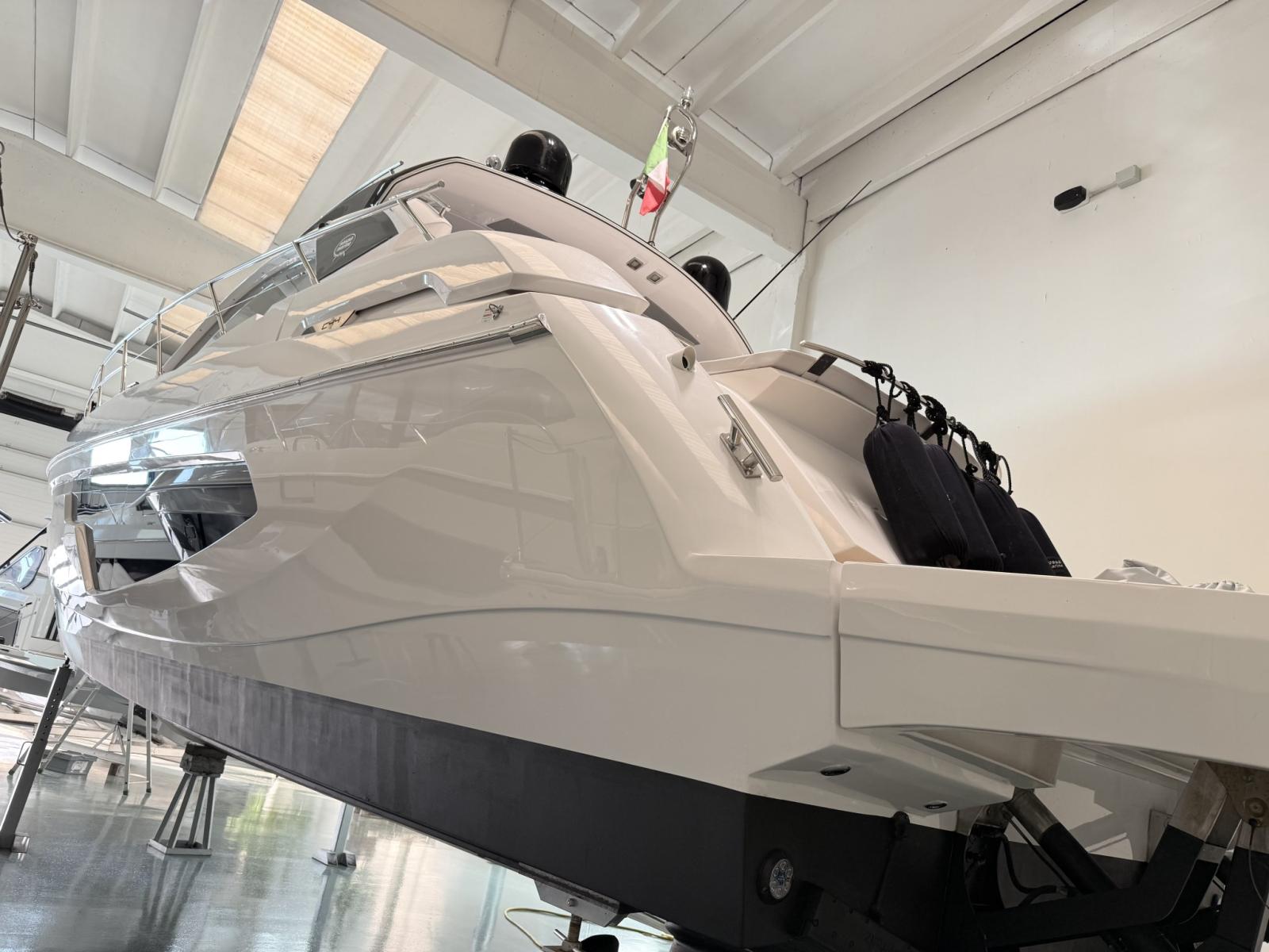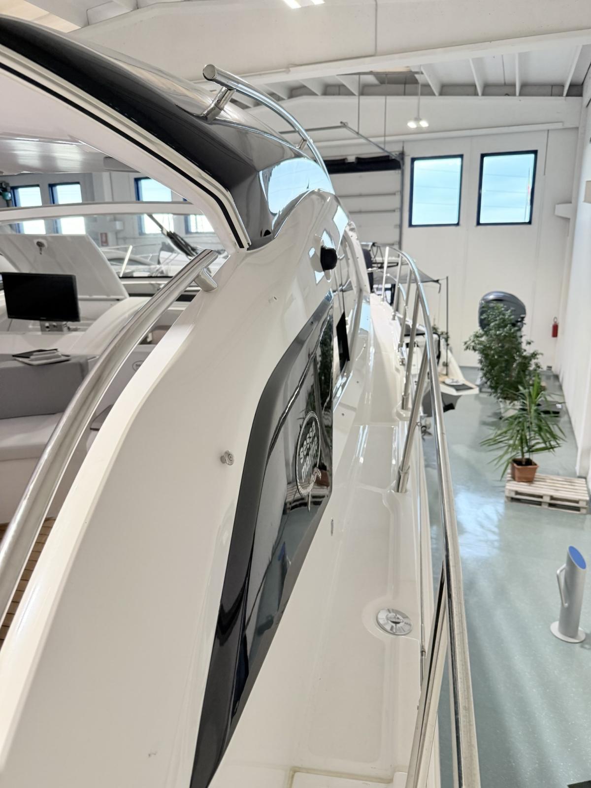 Alarme moteur, Alarme de pompe de cale, Ouverture du compartiment moteur électrique, Eau sous pression, Douche de cockpit, Flaps électriques, Garage à annexe, Hard top, Extincteur(s) fixe(s), Indicateurs de flaps, Lavabo dans le cockpit, Éclairage de courtoisie, Passerelle, Plateforme arrière, Pompe de cale automatique, Cockpit en teck, Prise de quai, Guindeau électrique, Echelle de bain, table de cockpit, Annexe, Corne.