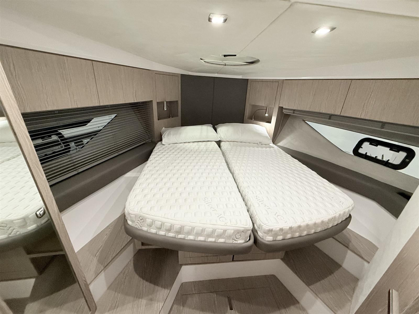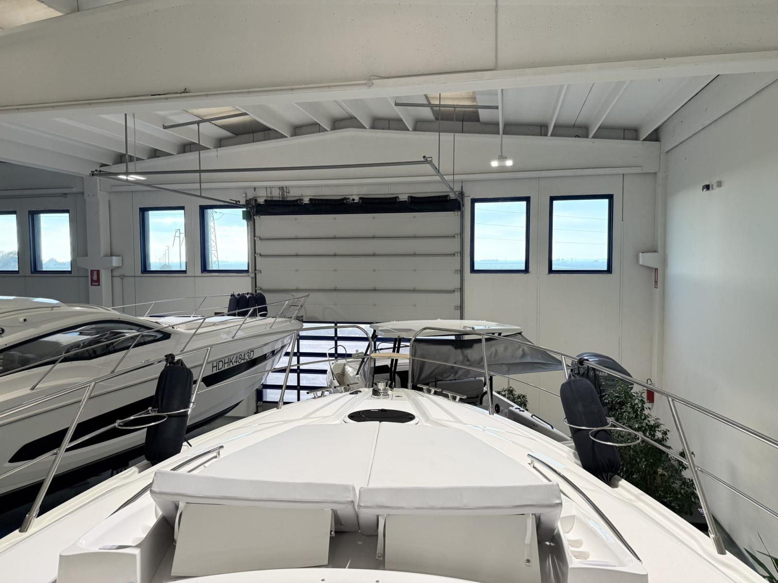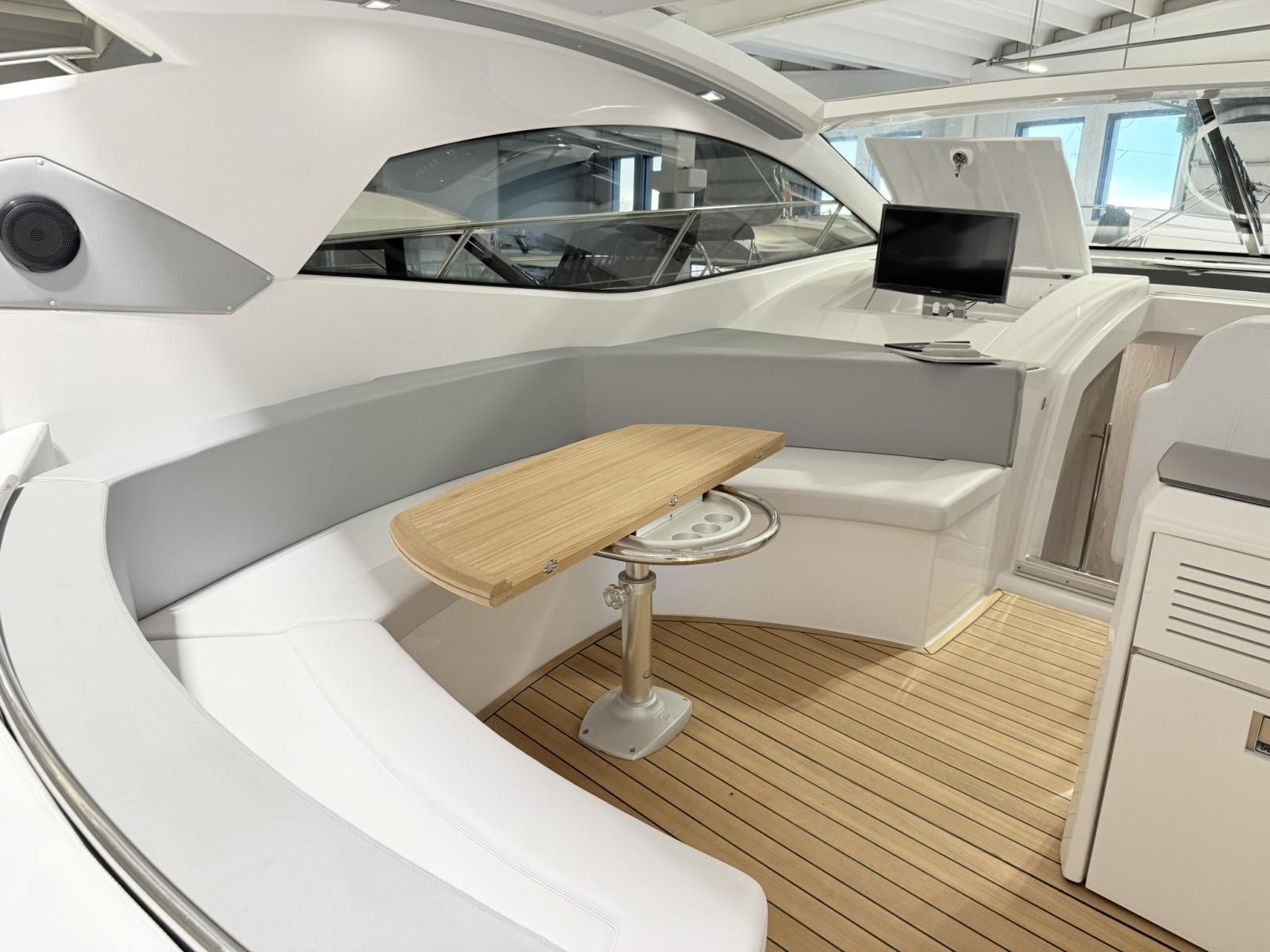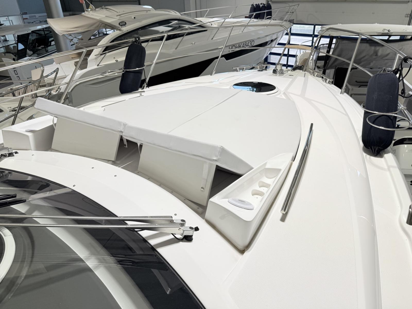 Alarme moteur, Alarme de pompe de cale, Ouverture du compartiment moteur électrique, Eau sous pression, Douche de cockpit, Flaps électriques, Garage à annexe, Hard top, Extincteur(s) fixe(s), Indicateurs de flaps, Lavabo dans le cockpit, Éclairage de courtoisie, Passerelle, Plateforme arrière, Pompe de cale automatique, Cockpit en teck, Prise de quai, Guindeau électrique, Echelle de bain, table de cockpit, Annexe, Corne.