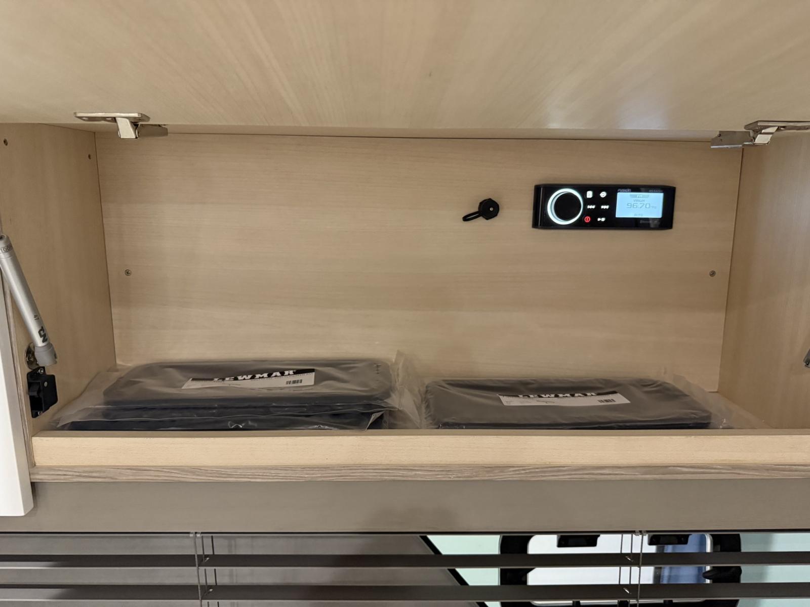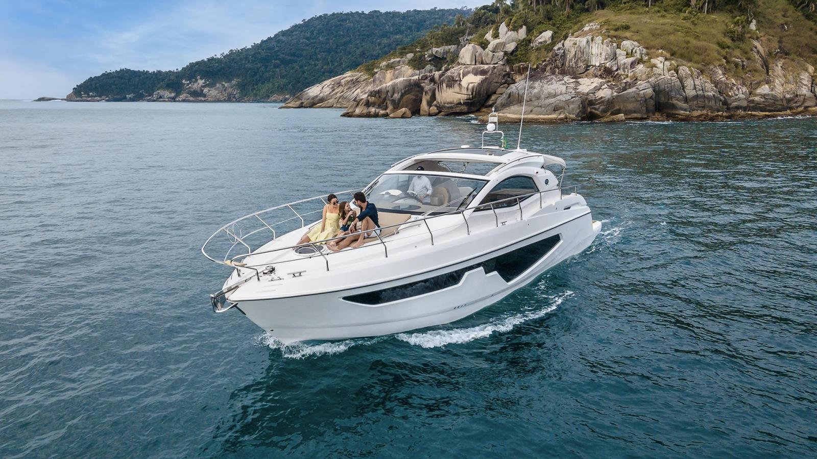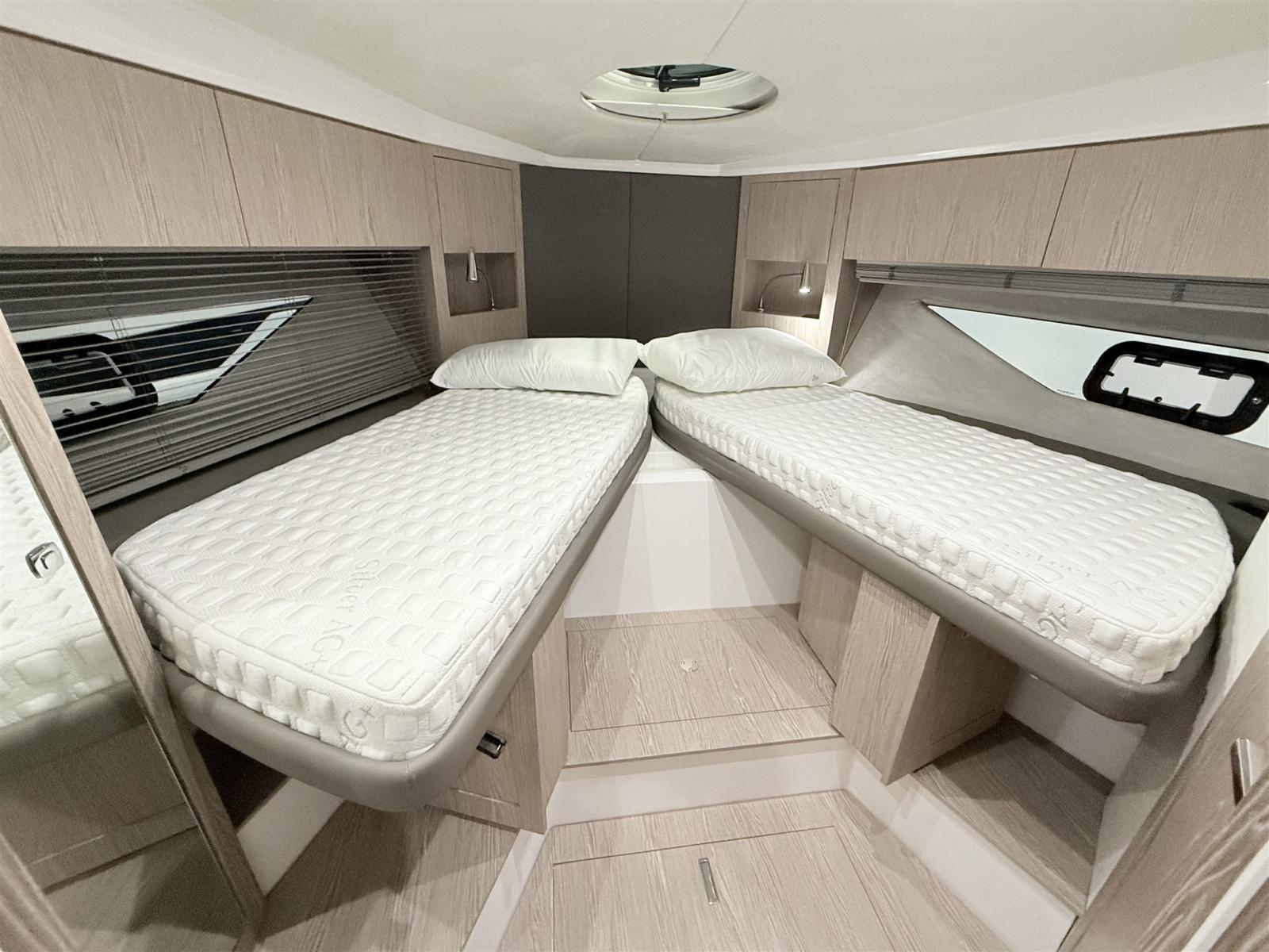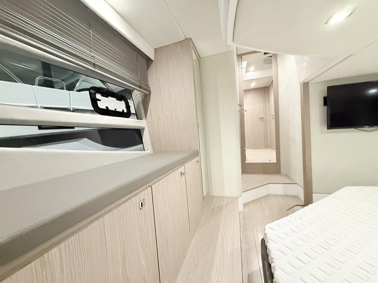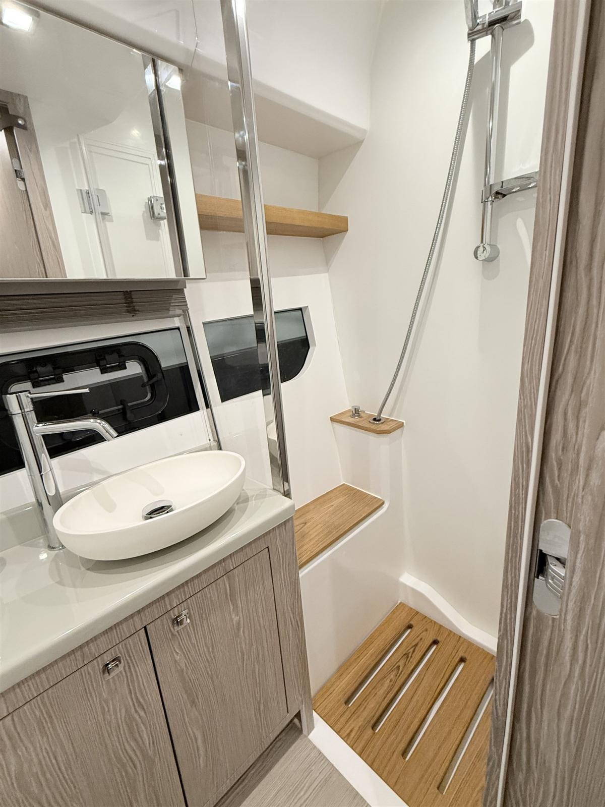 Alarme moteur, Alarme de pompe de cale, Ouverture du compartiment moteur électrique, Eau sous pression, Douche de cockpit, Flaps électriques, Garage à annexe, Hard top, Extincteur(s) fixe(s), Indicateurs de flaps, Lavabo dans le cockpit, Éclairage de courtoisie, Passerelle, Plateforme arrière, Pompe de cale automatique, Cockpit en teck, Prise de quai, Guindeau électrique, Echelle de bain, table de cockpit, Annexe, Corne.