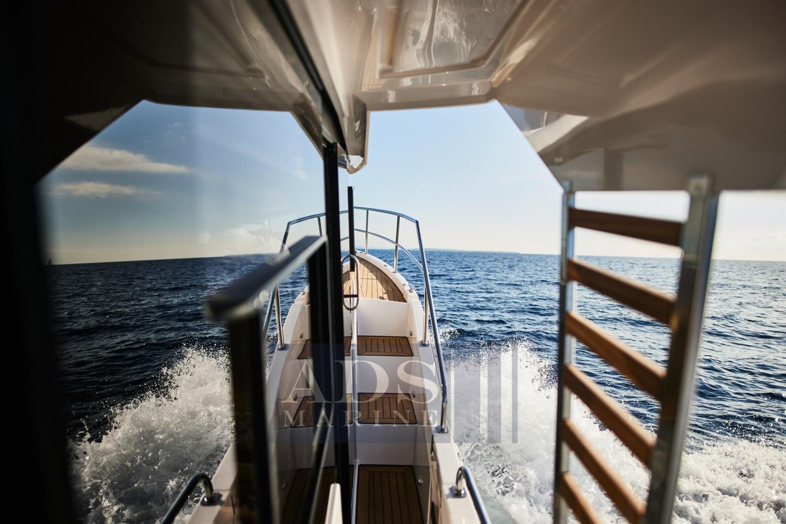- Toit blanc intégré au-dessus du cockpit, du salon et de la timonerie avec des marches intégrées menant au pont ensoleillé