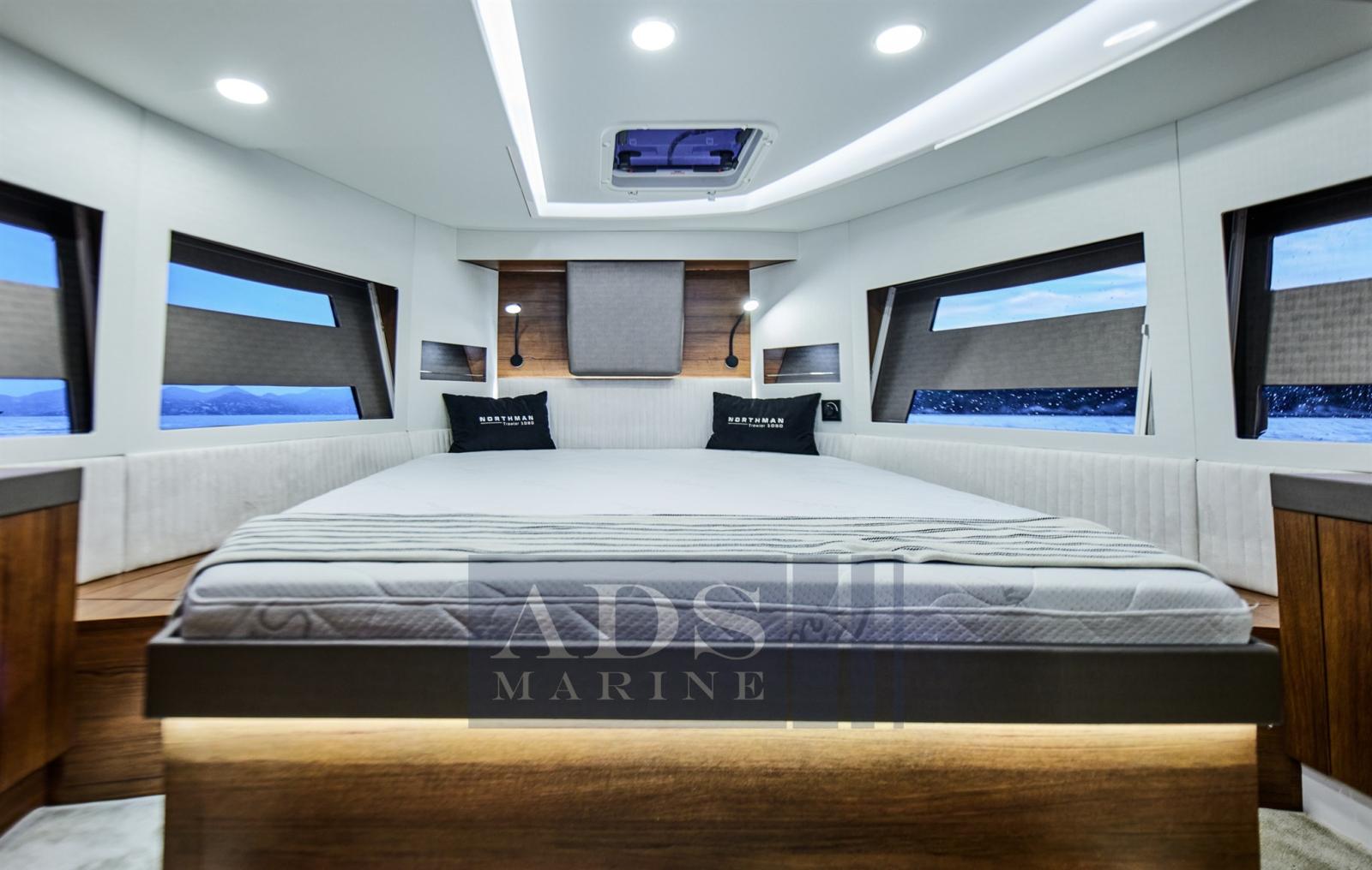 -Cabine de propriétaire de navire à l’avant avec lit king size, deux fenêtres fixes avec stores, petite armoire à tribord, éclairage au plafond avec gradateur