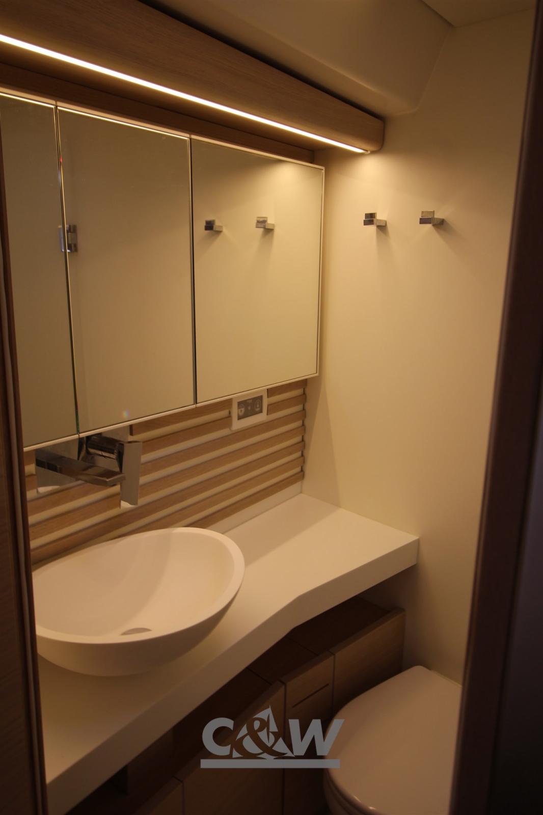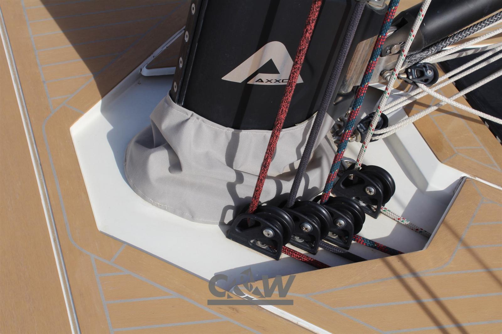 Passavant en teck, Douche de cockpit (acqua calda e fredda), Passerelle (pieghevole Carboway), Connexion eau sous pression à quai, Guindeau électrique, Echelle de bain, table de cockpit, Pont en teck, 6 Winch (Harken Radian).