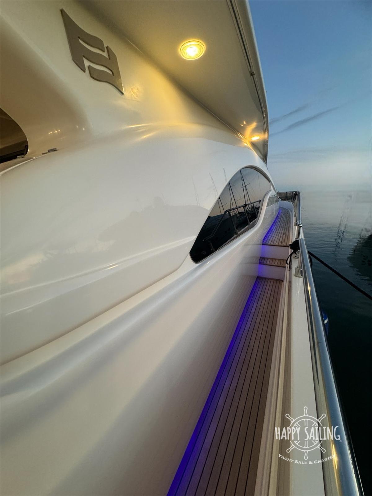 Eau sous pression (elettrico), Douche de cockpit, Flaps électriques, Grue de flybridge, Extincteur(s) fixe(s), Éclairage de courtoisie, Passerelle, Plateforme arrière, Guindeau électrique, table de cockpit, Annexe.