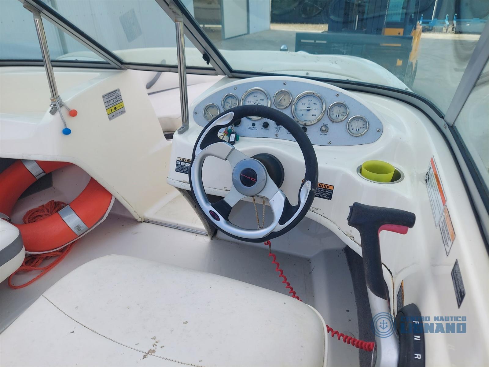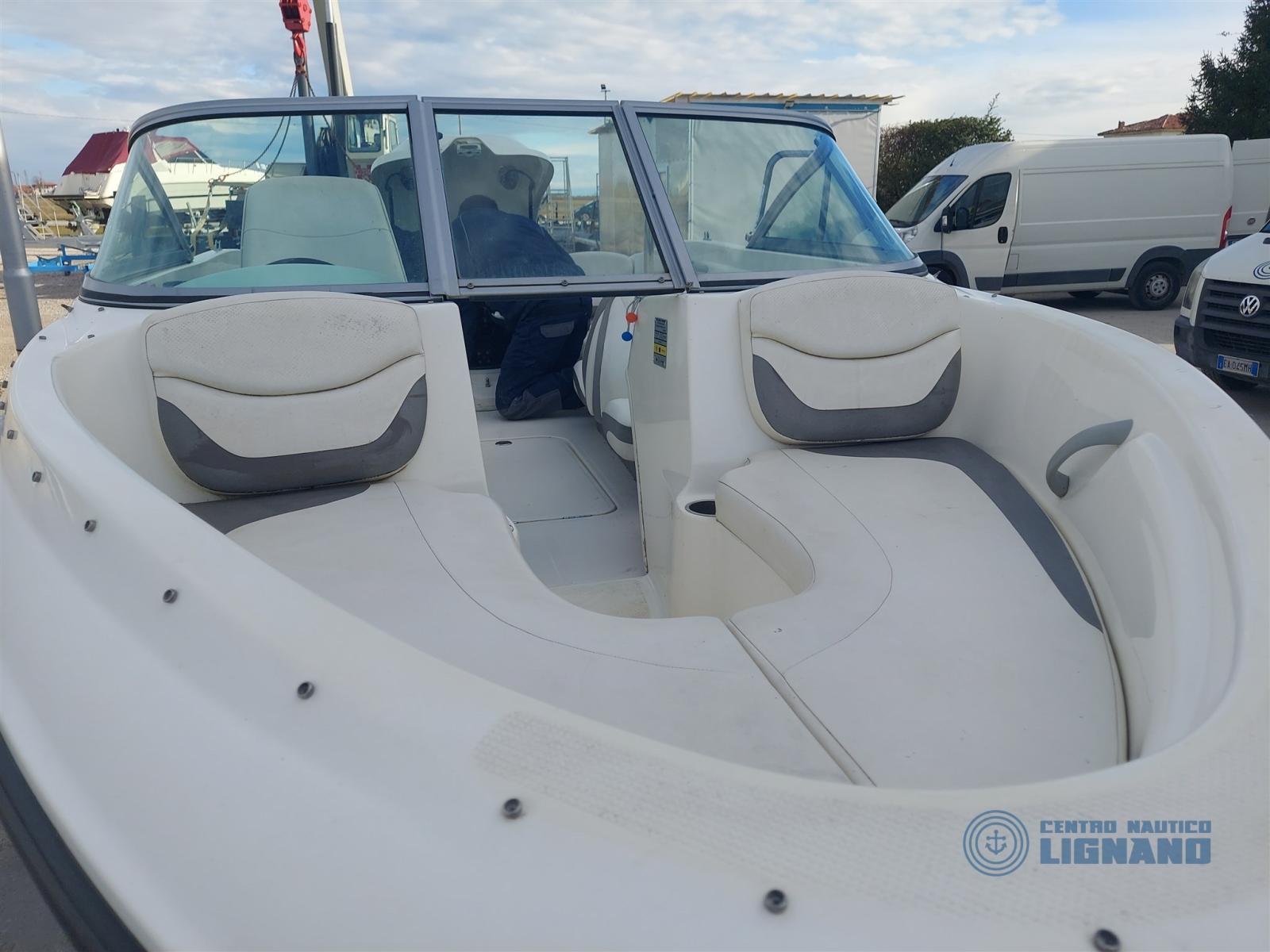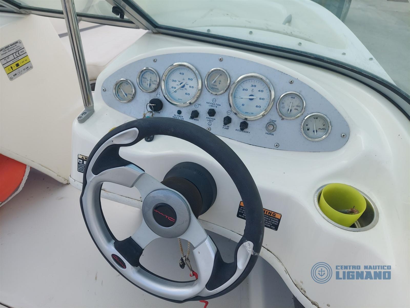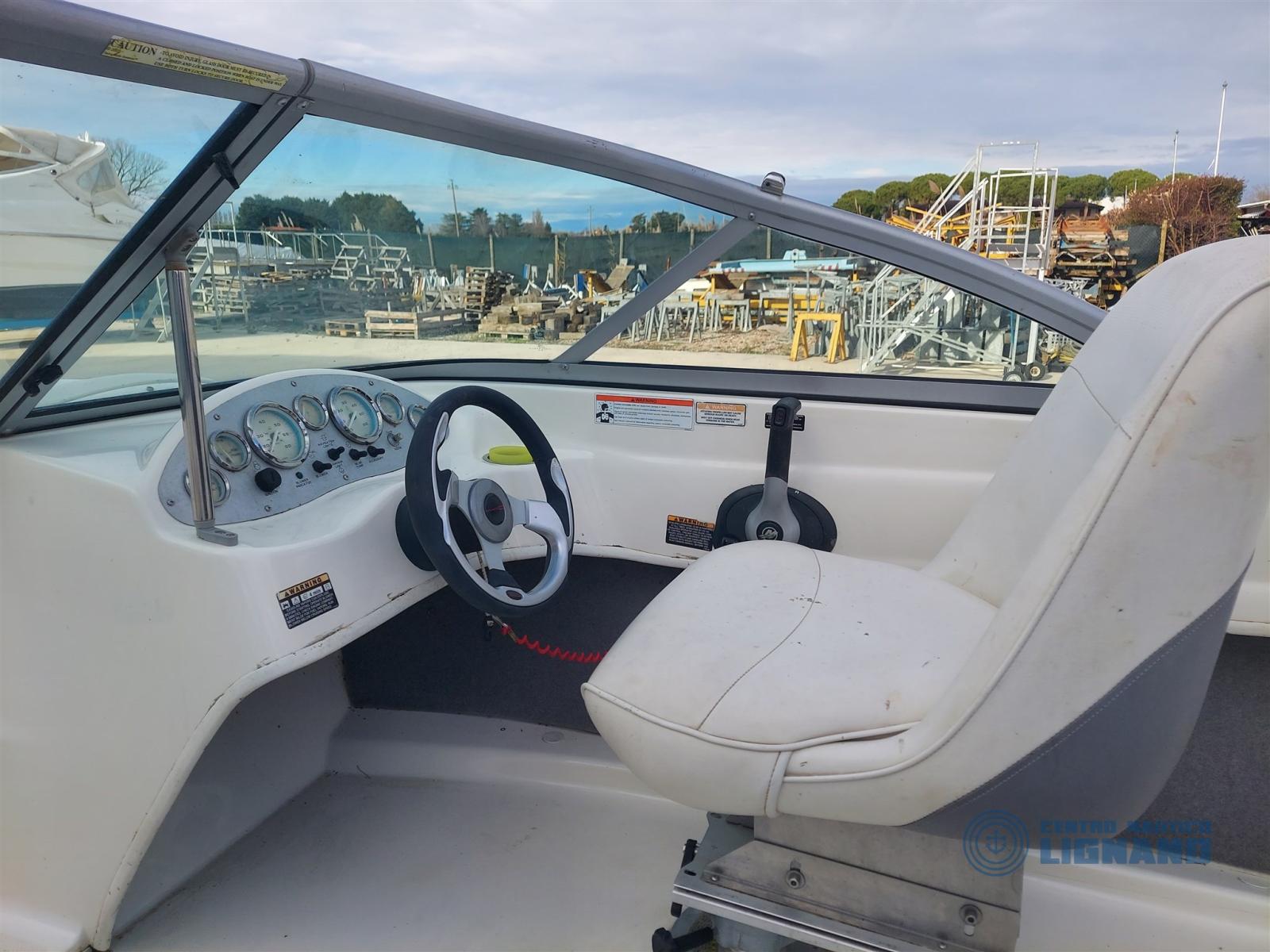 Bateau Bayliner 175 GT de 2009, visible au chantier Centro Nautico Lignano, moteur sterndrive Mercruiser MCM 3.0L 135Hp, coussins extérieurs blancs en bon état, sièges conducteur réglables, bimin en acier avec auvent, housses de fin de vie à refaire, bon état général, peu d’heures, non détectable, seul propriétaire. Bateau en consignation de l’agence Centro Nautico Lignano.
