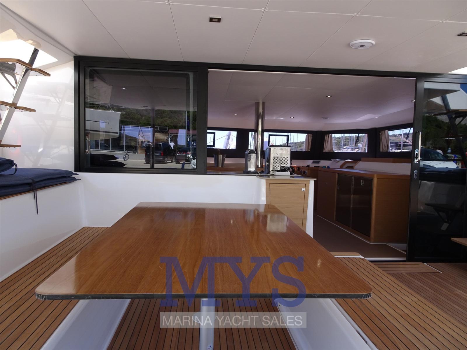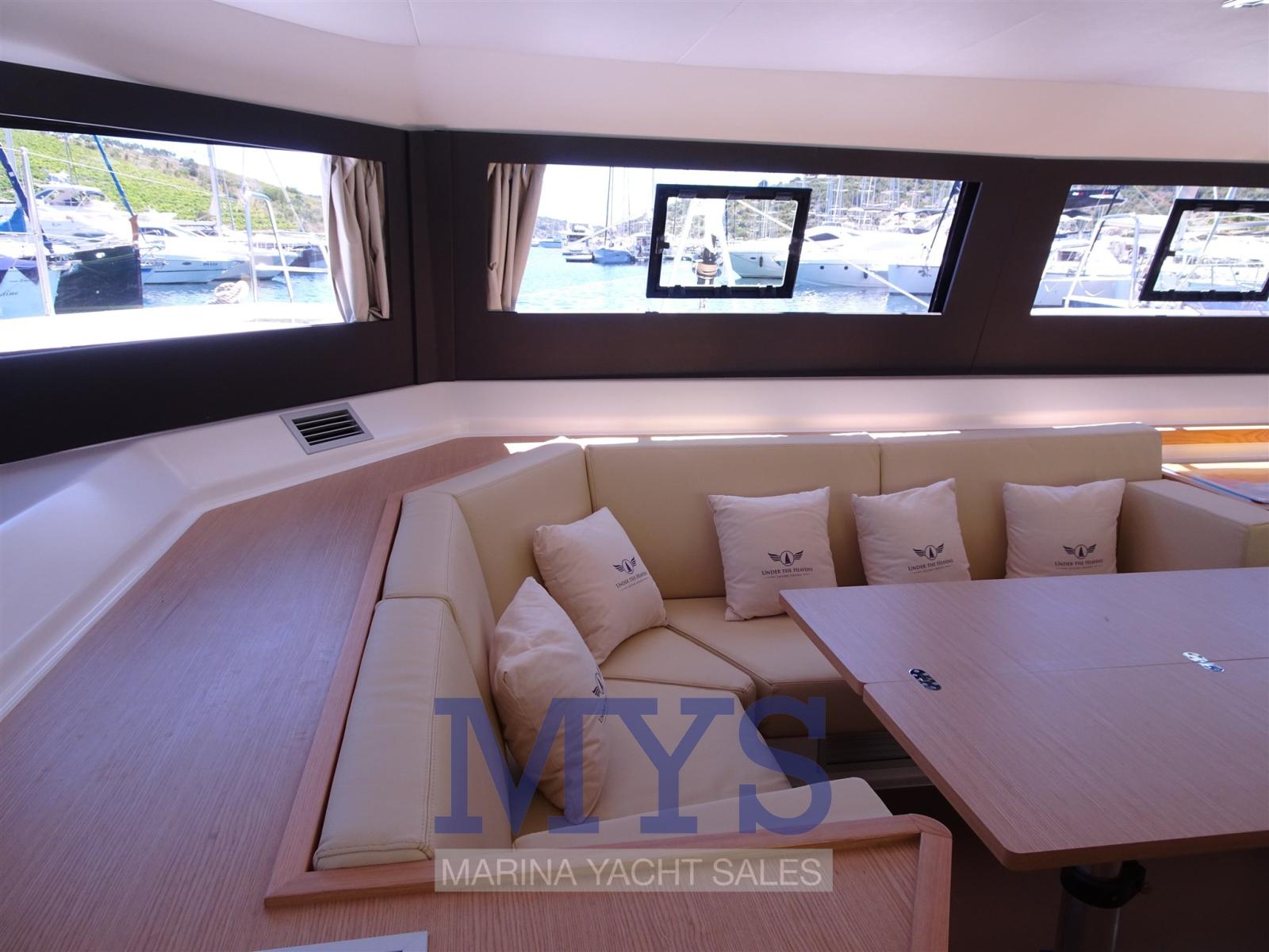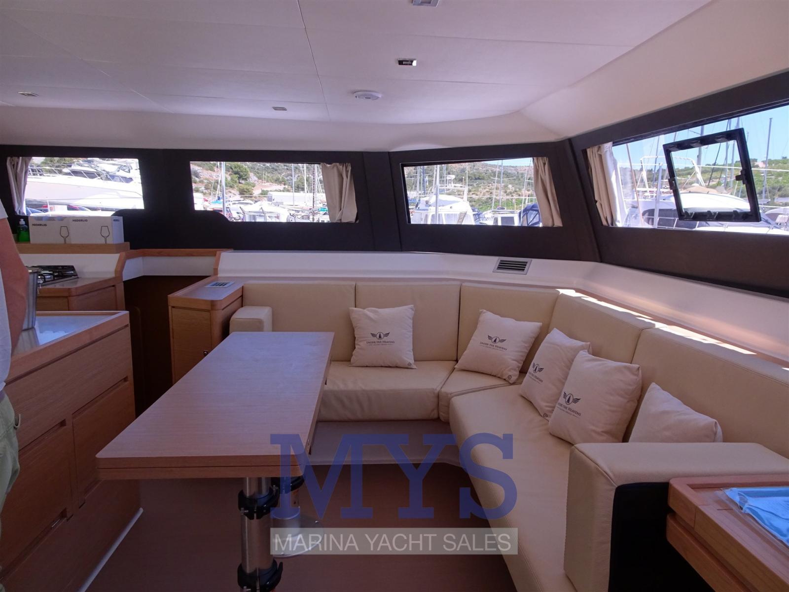 Il y a une grande table pour 8 personnes, plusieurs places assises et des espaces de détente, ainsi que le célèbre pont créé par Dufour Yachts.