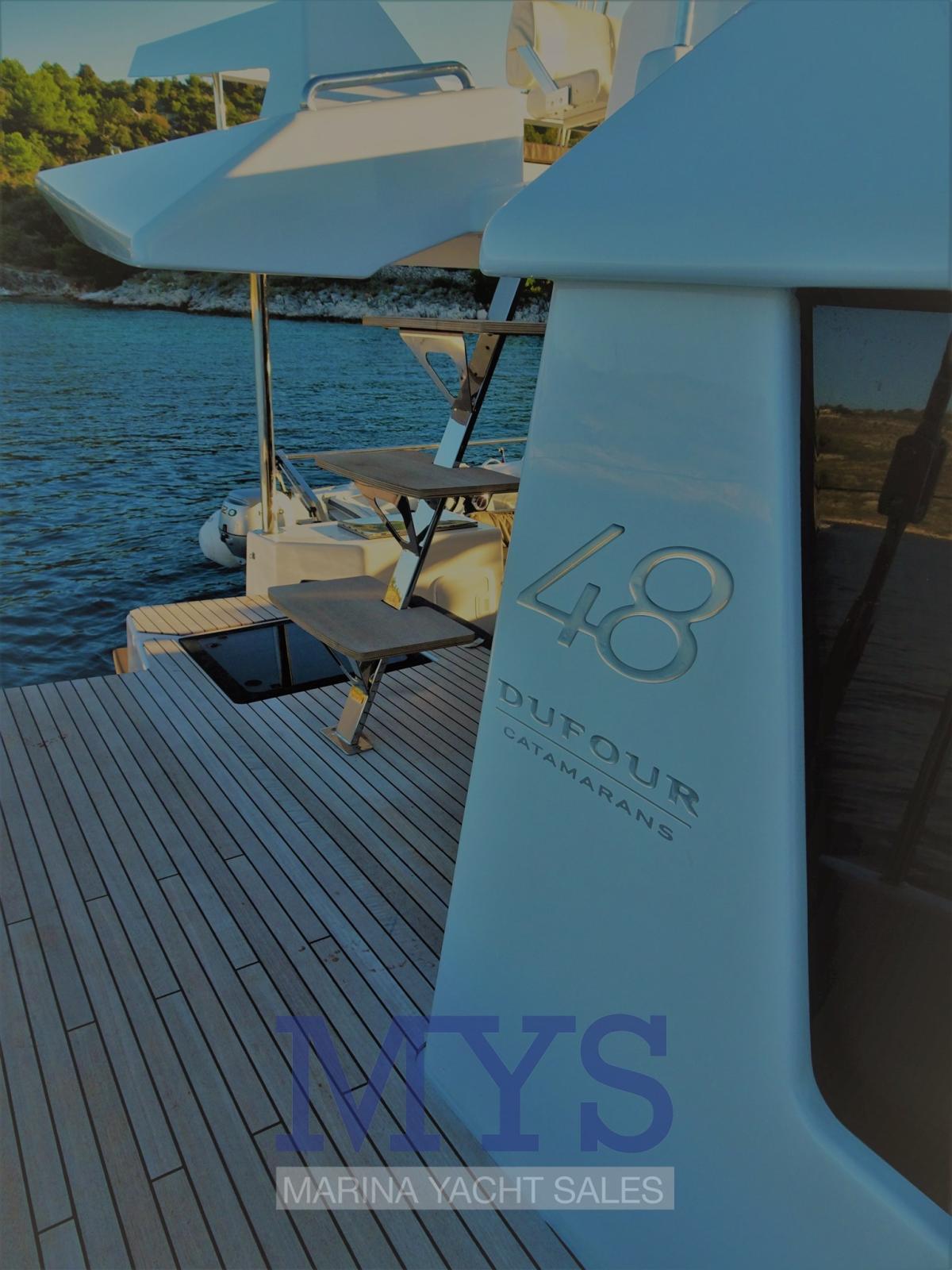 Le Dufour Catamarans 48 conserve les codes identitaires Dufour, notamment avec les lignes de la coque et de leurs inserts, les formes des hublots et le plan de pont libres de toute entrave.