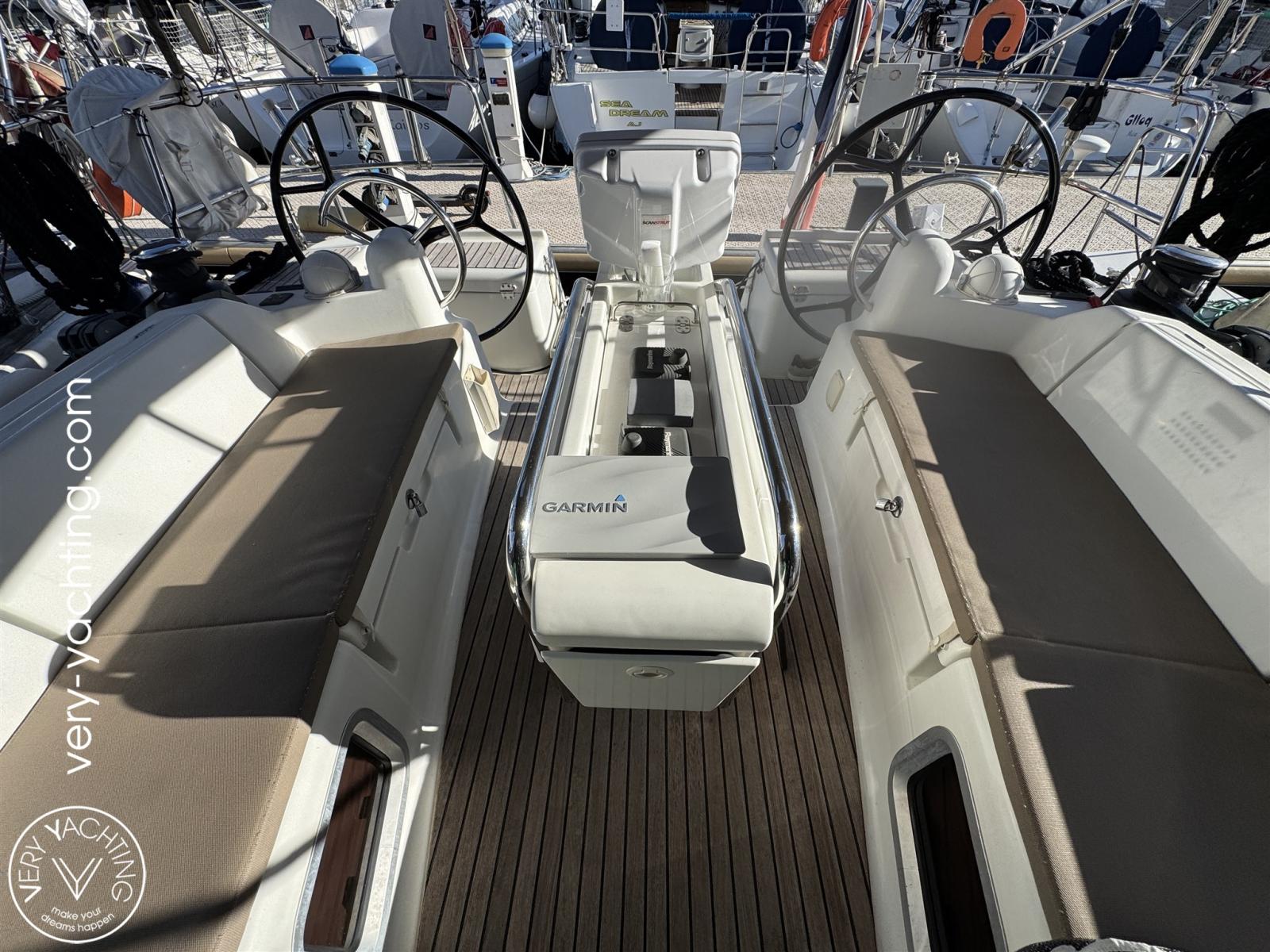 Propulseur d'étrave, pont et cockpit en teck, double barre à roue, winch électrique, panneau solaire sur bimini...
