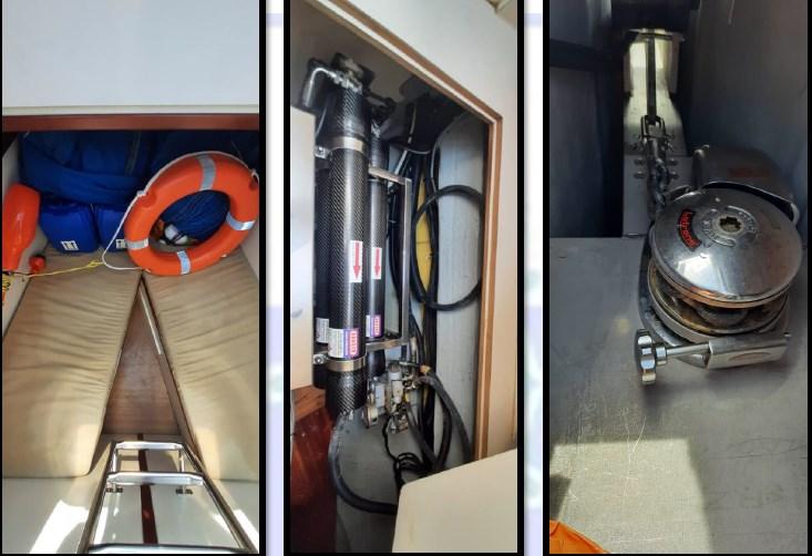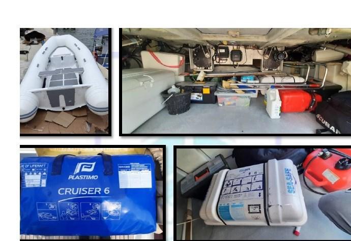 Baromètre, Jumelles, Cartes marines, Trousse à pharmacie, Equipement sécurité au delà des 50 miles, Gilets de sauvetage, Bouée fer à cheval et feu de retournement, 2 Radeau de survie.