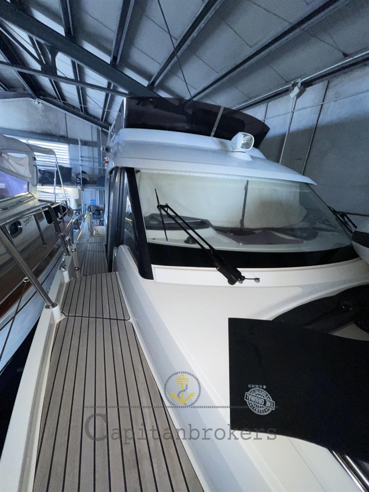 Bateau bien équipé avec terrasse sur le jardin arrière, teck dans le cockpit, passerelles latérales et étrave en teck, teck sur le flybridge, teck sur la plateforme, double écran tactile garmin dont 1 sur le flybridge, propulseur d’étrave.