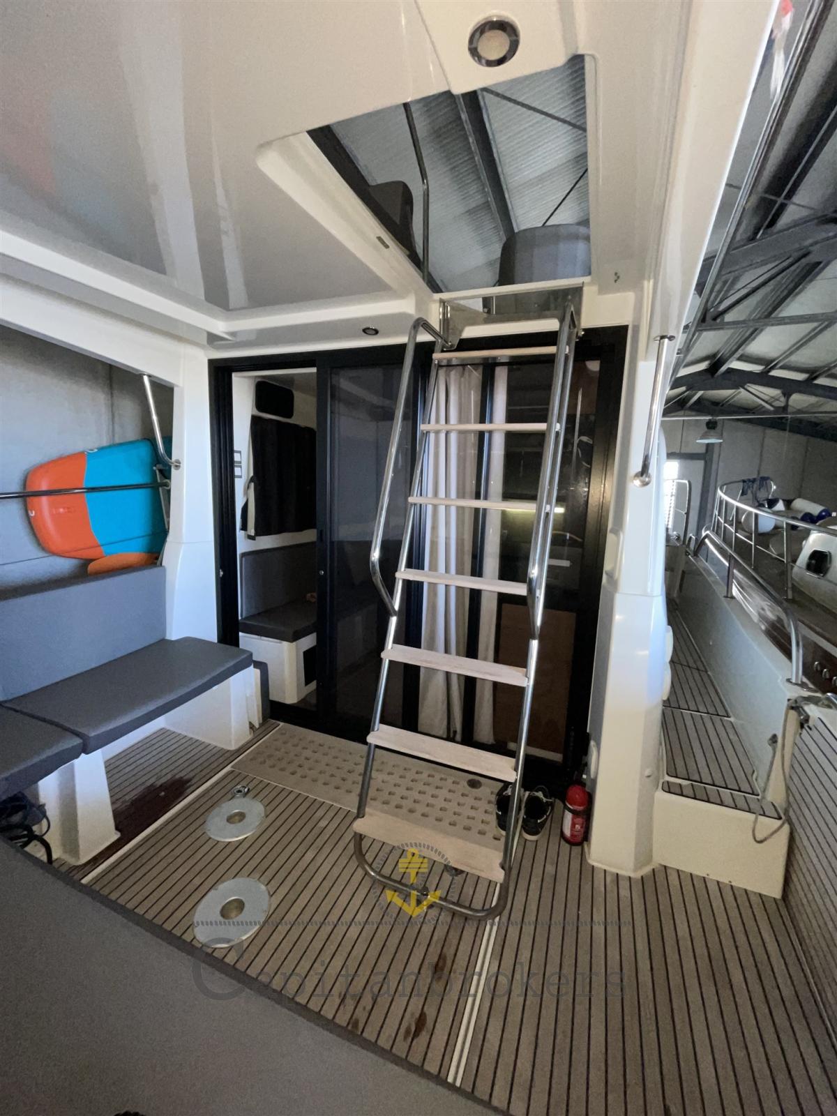 Alarme moteur, Alarme de pompe de cale, Eau sous pression, Passavant en teck, Douche de cockpit, Double barre à roue, Phare de poursuite, Flaps électriques, Indicateurs de flaps, Lavabo dans le cockpit, Éclairage de courtoisie, Spots sous-marins, Panneau solaire (sul fly), Plateforme arrière (in teak), Pompe de cale automatique, Pompe de cale manuelle, Porte latérale, Porte latérale, Cockpit en teck, Prise de quai, Connexion eau sous pression à quai, Guindeau électrique, Echelle de bain, table de cockpit, Annexe, Corne, Winch électrique avant.