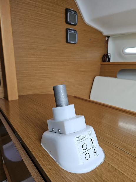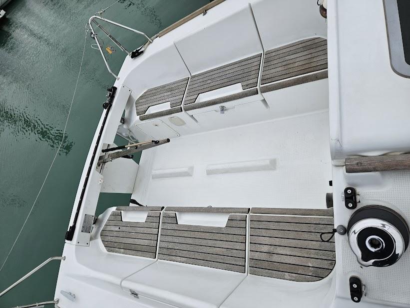 Par son niveau de confort et d’habitabilité, le First 25 acquiert une pleine dimension croisière. L’intégration de l’épontille à la cloison avant permet de disposer d’un très bel espace dans le carré, illuminé par une ébénisterie de teinte teck blond. Avec sa cabine avant double, ses nombreux rangements, un lavabo, des toilettes et deux couchages dans le carré, il offre une belle capacité d’accueil.