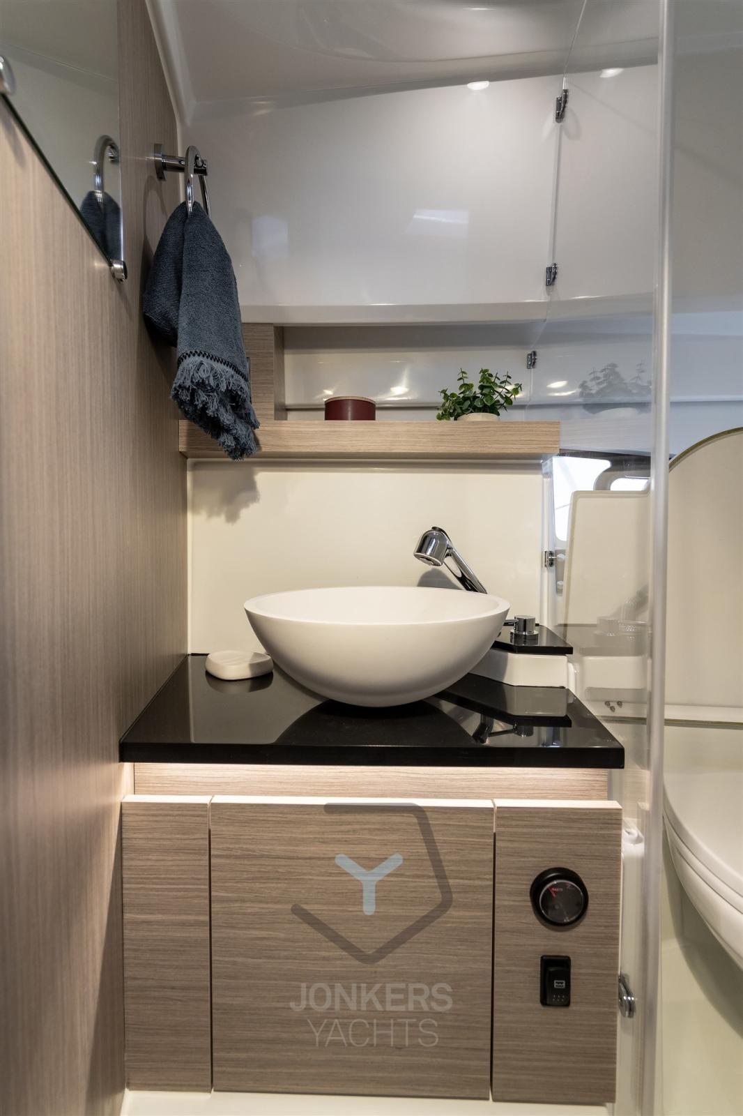 Le pont avant dispose d’un cockpit supplémentaire, parfait pour se détendre et prendre un verre. La chaise longue peut également être transformée en une généreuse terrasse. À la fin de la journée, vous pouvez préparer un délicieux repas grâce à la cuisine intégrée dans le poste d’appui en option, avec réfrigérateur et gril. Naviguez vers le coucher du soleil et passez la nuit à bord. Les deux cabines séparées avec lits doubles offrent tout le confort que vous désirez.