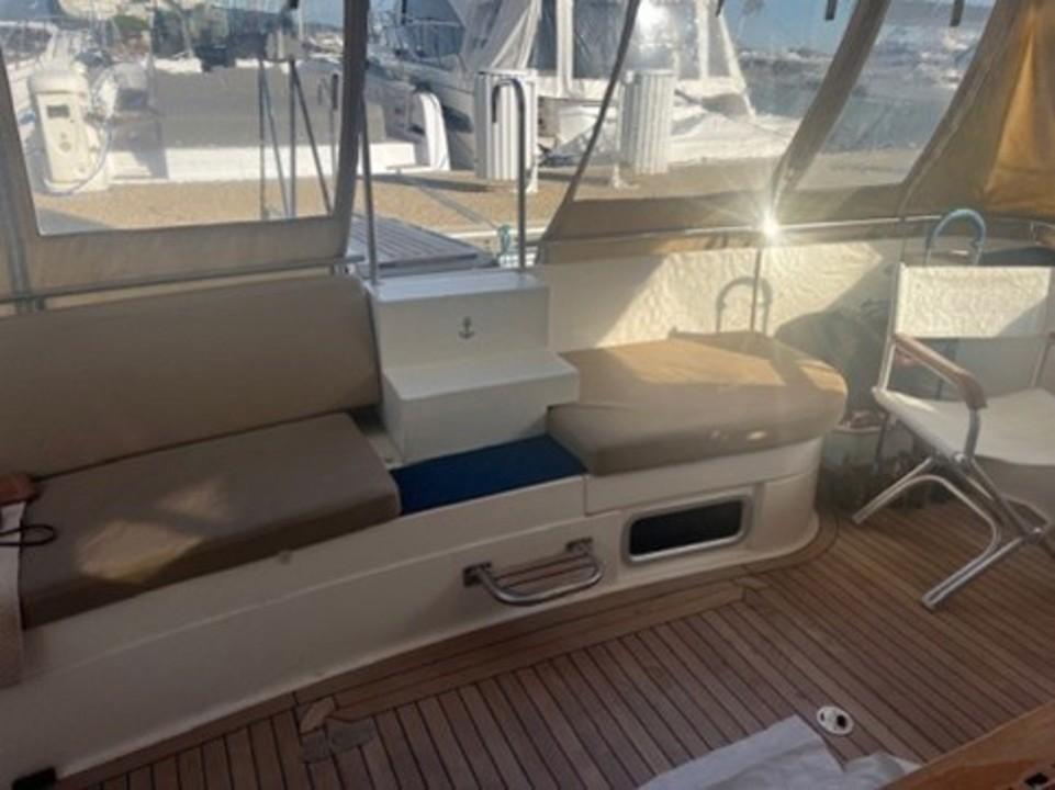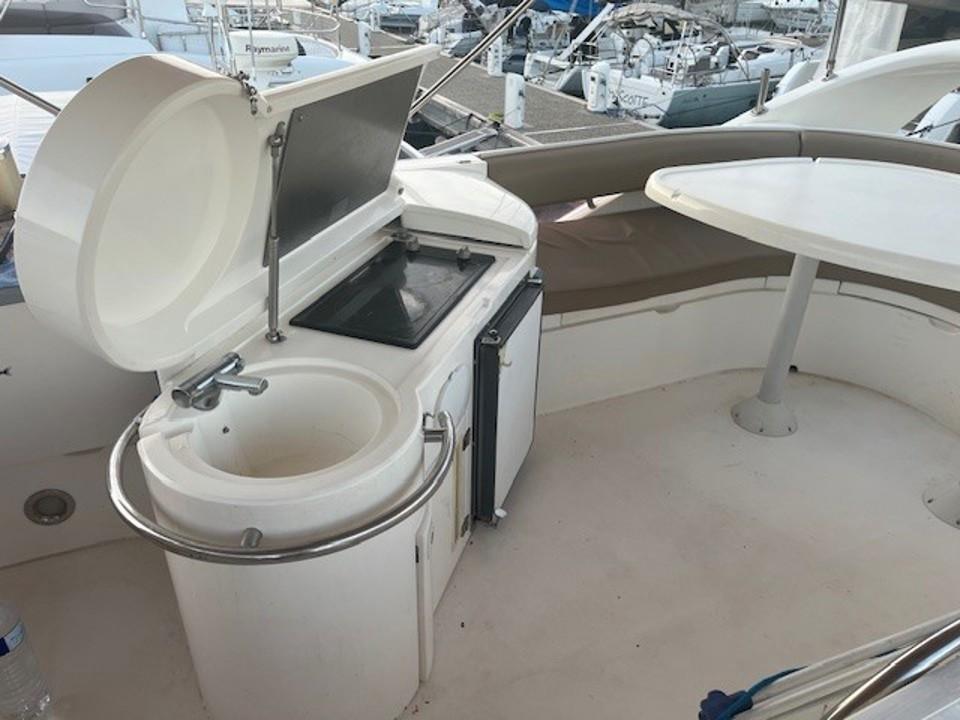 Le flybridge équipé d’un évier, avec réfrigérateur et barbecue, un grand bain de soleil convertible équipe ce Fly aussi, le bimini recouvre entièrement le pont de Fly (agréable pour le mouillage)