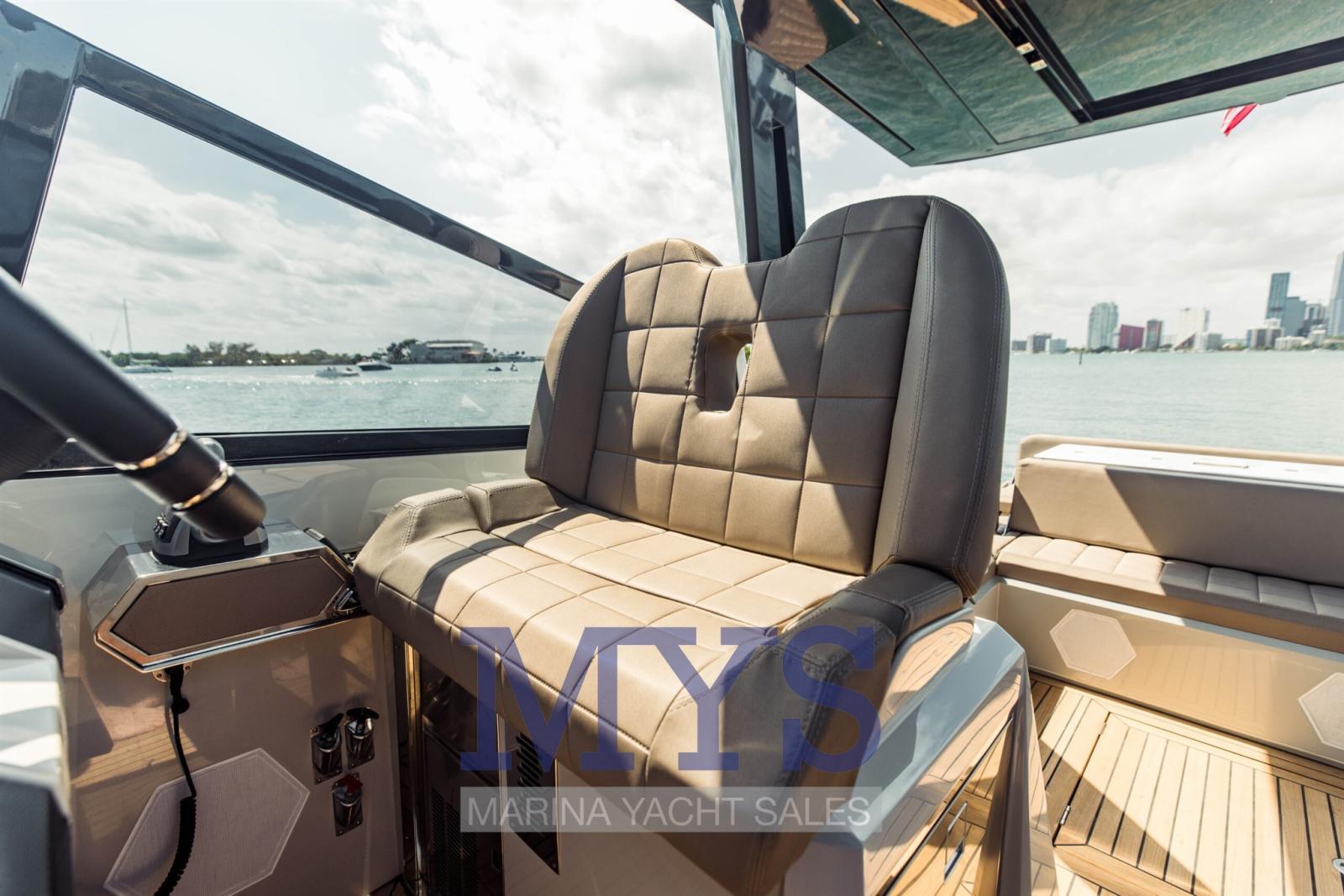 Toutes les commandes et tous les systèmes de navigation sont intégrés dans la console en teck aux lignes douces. Le gouvernail, le joystick Volvo Penta IPS et les deux écrans tactiles de 12 pouces promettent une expérience de conduite passionnante.