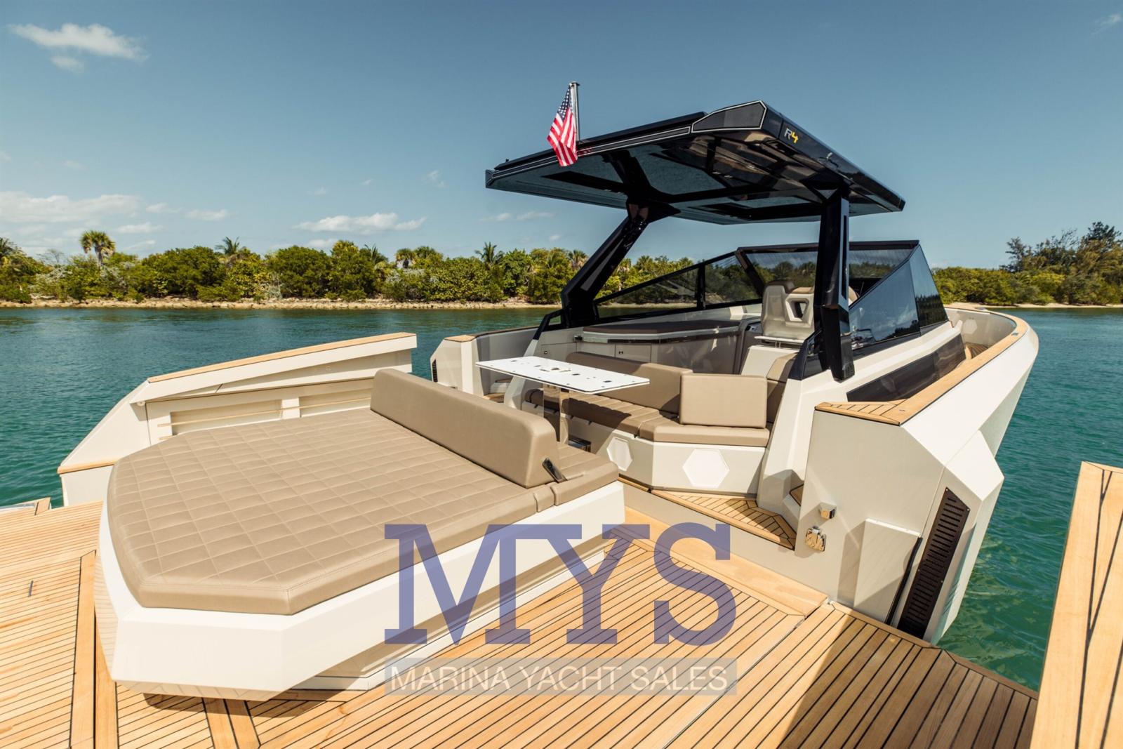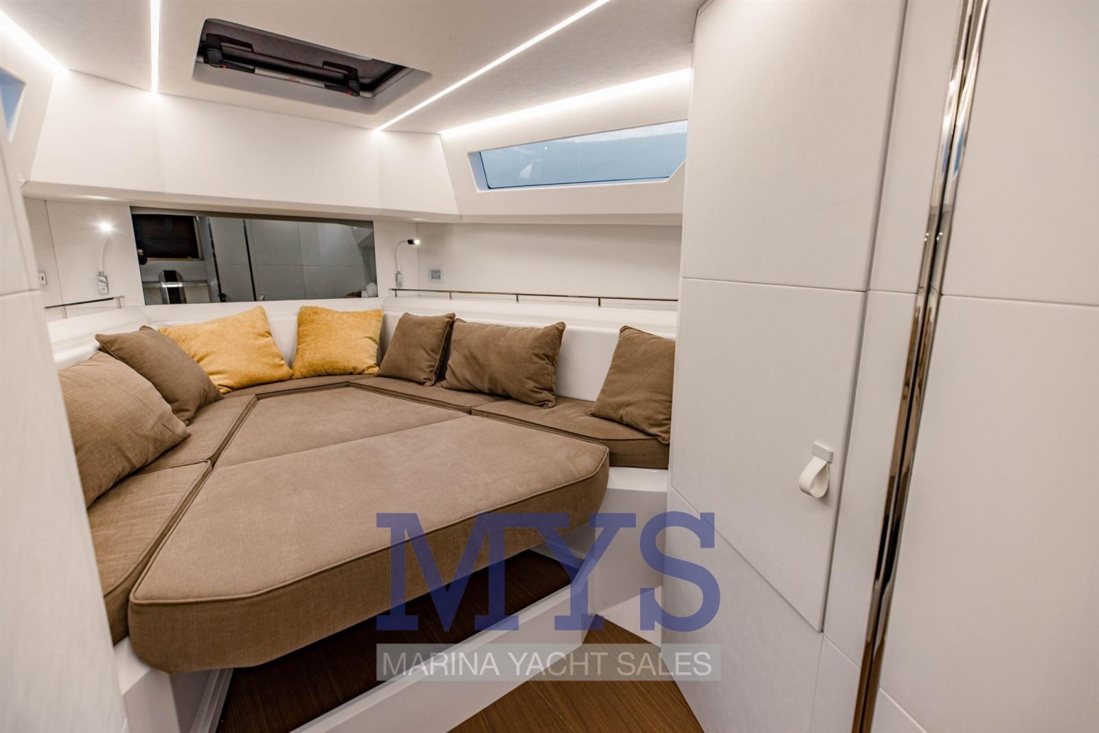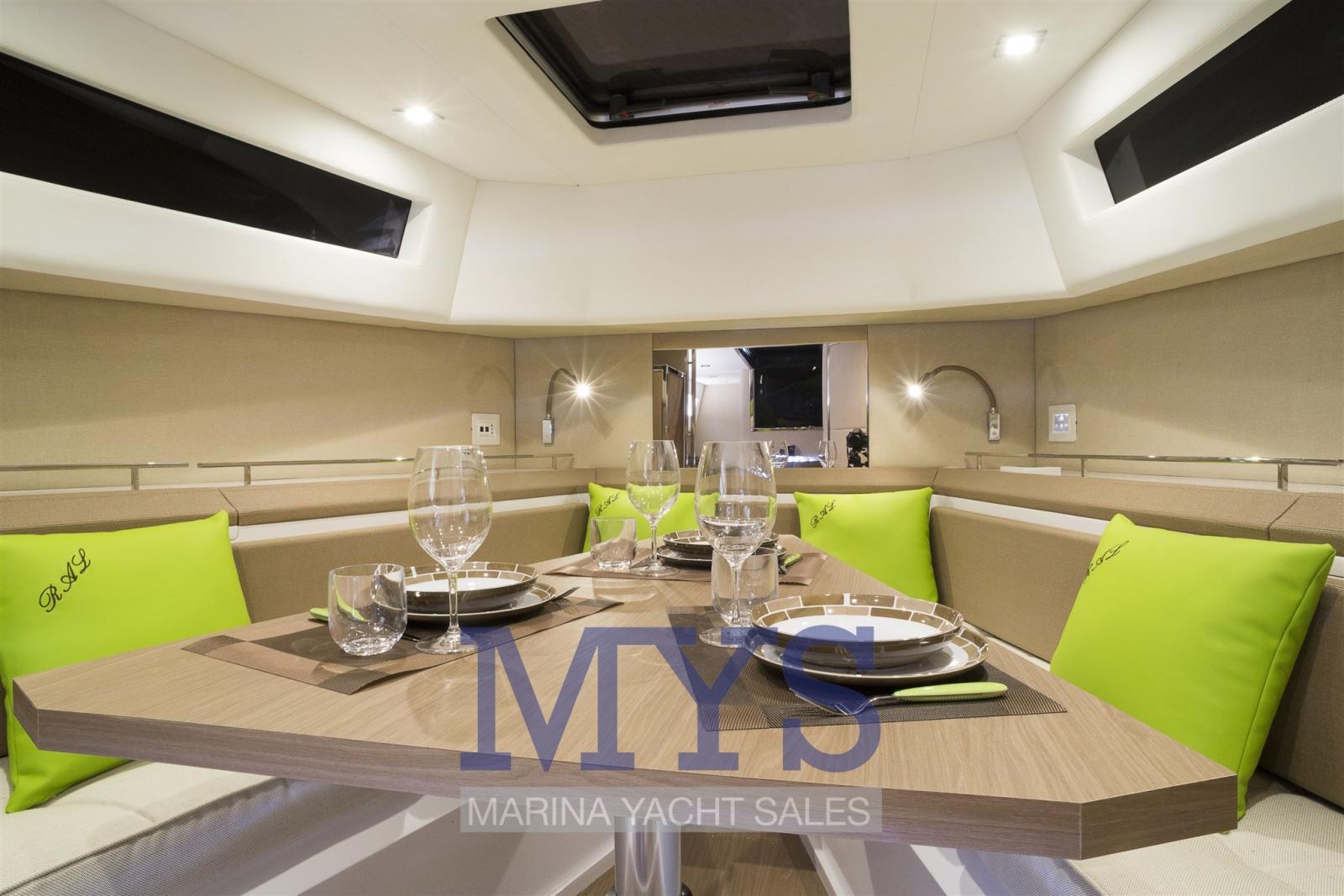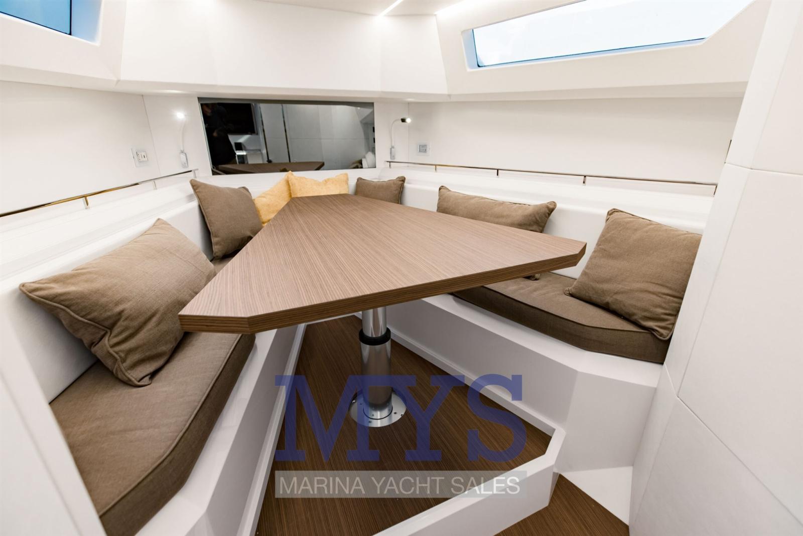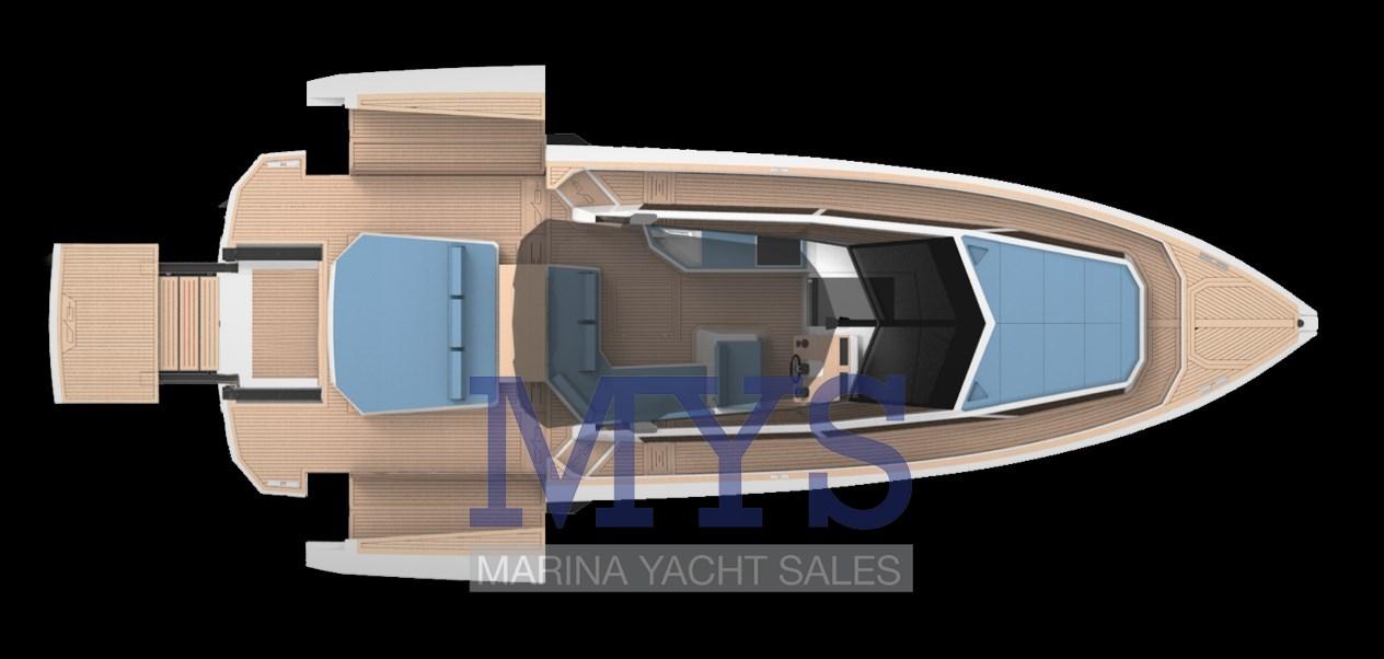 Alarme moteur, Ouverture du compartiment moteur électrique, Eau sous pression, Passavant en teck, Douche de cockpit, Flaps électriques, Lavabo dans le cockpit, Éclairage de courtoisie, Passerelle, Plateforme arrière, Pompe de cale automatique, Cockpit en teck, Prise de quai, Guindeau électrique, Echelle de bain, table de cockpit, Table pliante de salon.