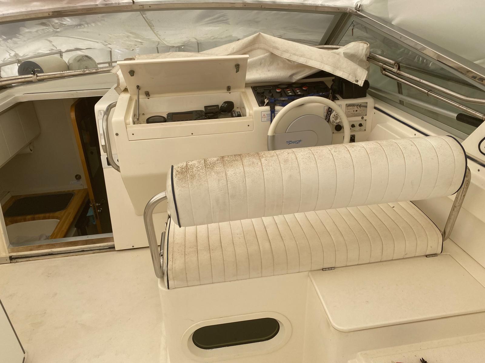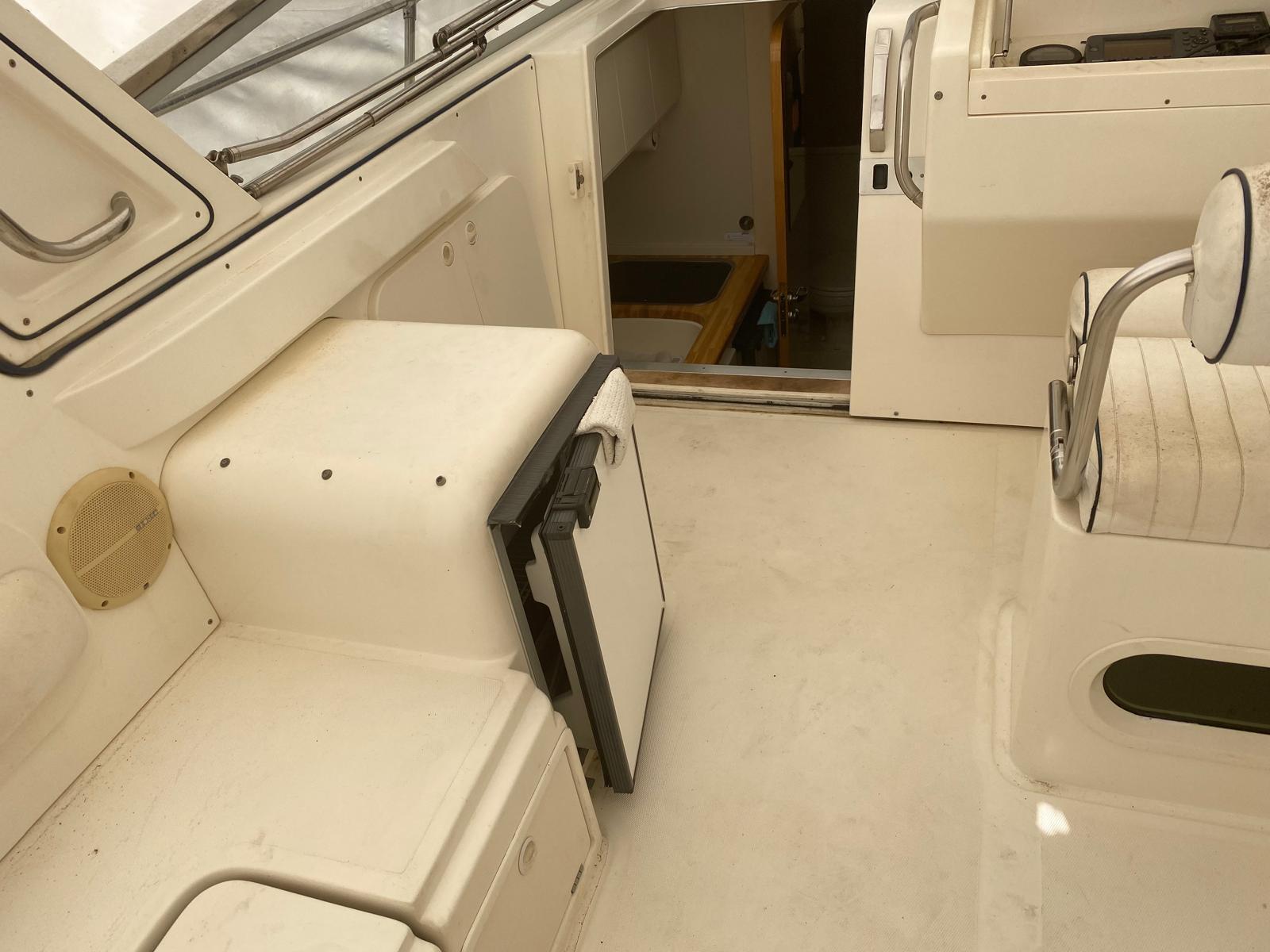 Le cockpit spacieux en U cache au sol une table escamotable motorisée par vérin hydraulique et pouvant se transformer en un immense bain de soleil. Un petit frigo de cockpit vous procurera des boissons fraiches !