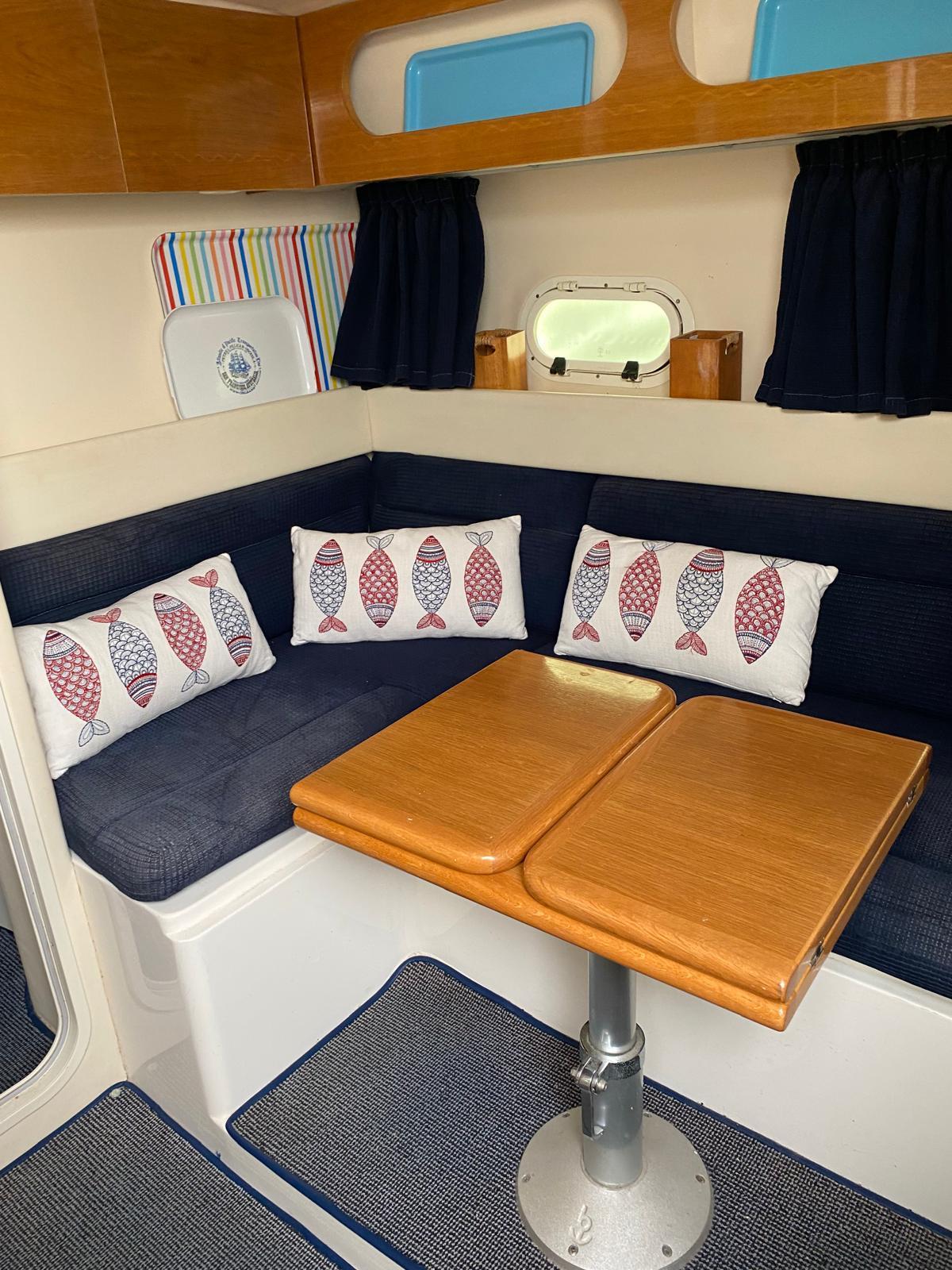 L’intérieur spacieux et lumineux vous accueillera avec sa grande cabine avant propriétaire, sa cabine arrière avec un couchage en 140 et dans le coin repas, la table modulable du carré se transforme en couchage deux personnes.