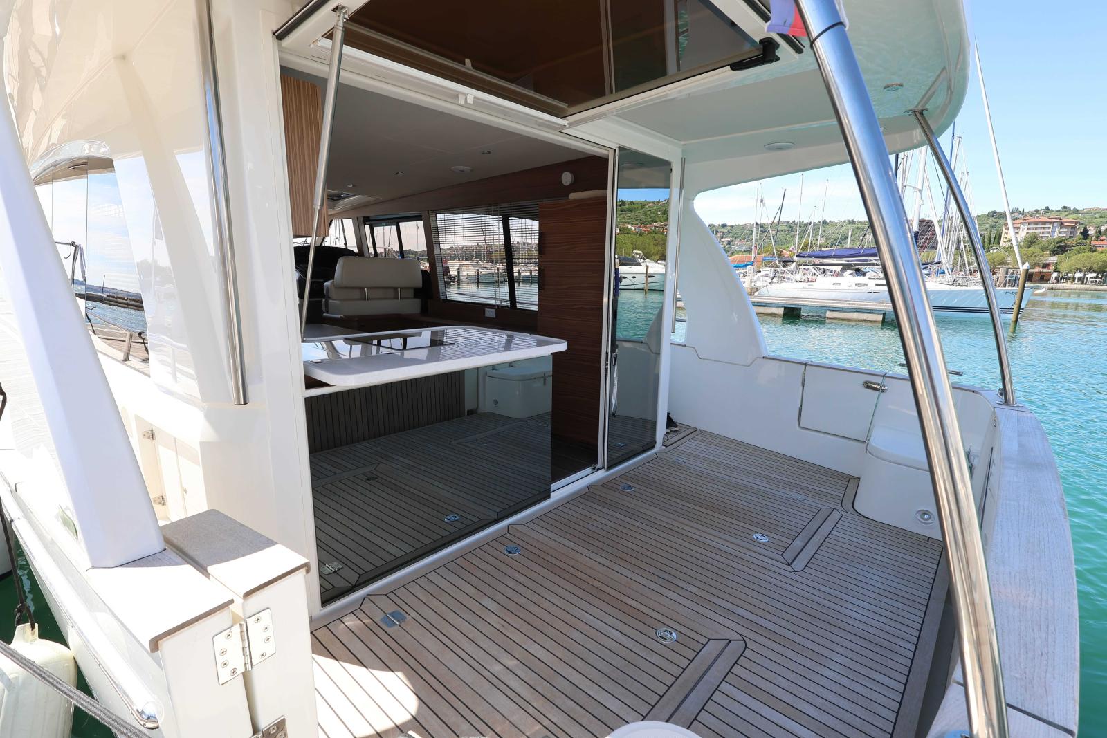 Cette unitée compte tout juste 80h de navigation, et est équipée de très nombreuses options : Climatisation reversible, chauffage Webasto, cockpit et pont en teck, pack confort et pack divertissement (TV cabines et carré, système audio Fusion...), AIS emetteur / récepteur ...