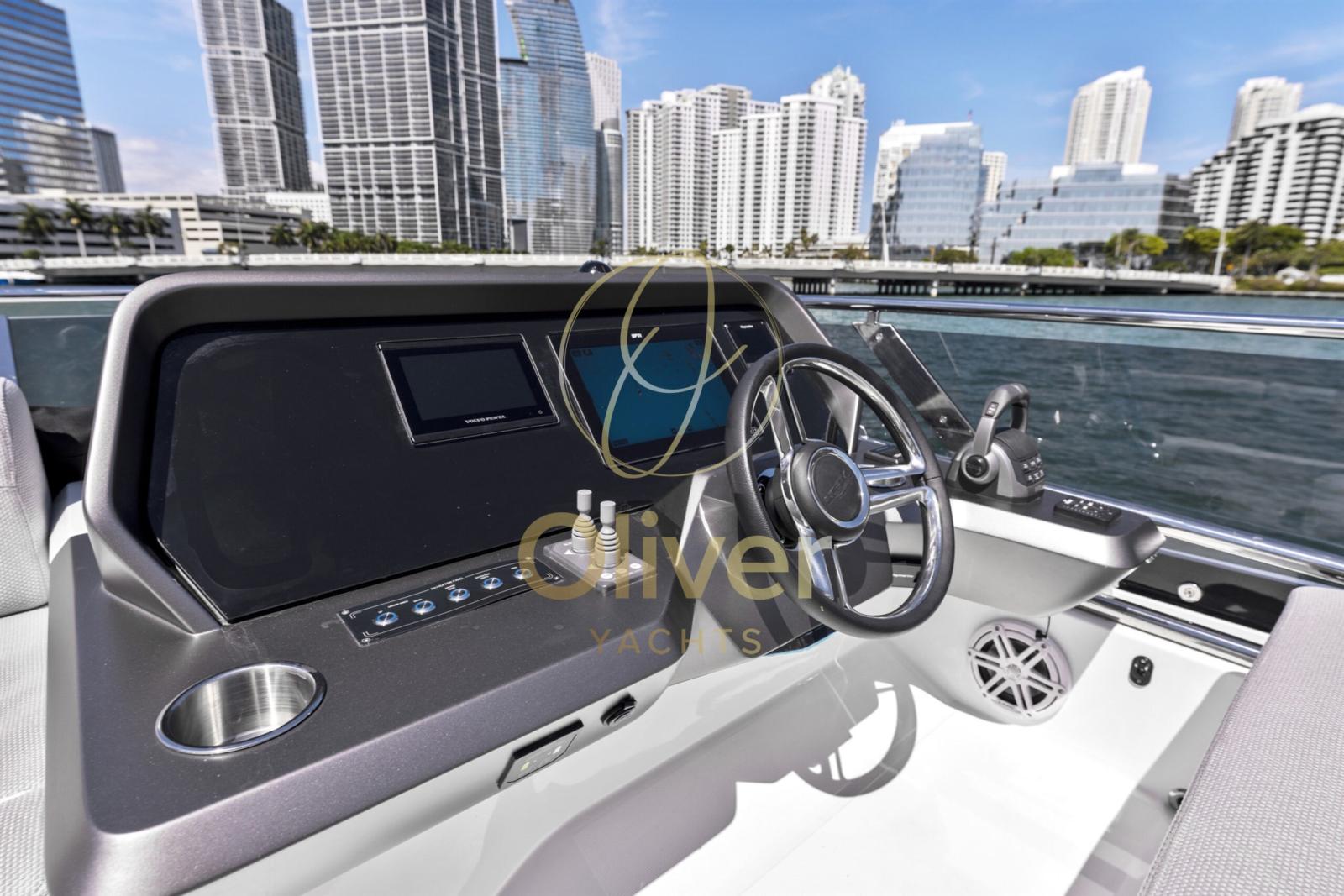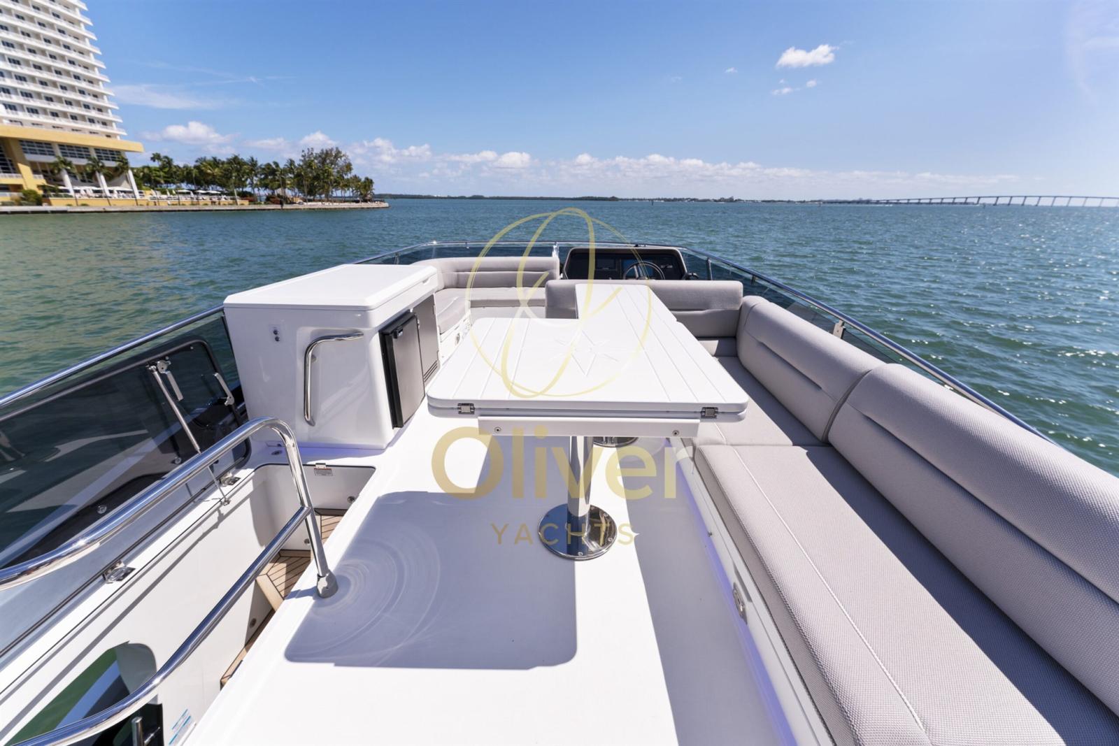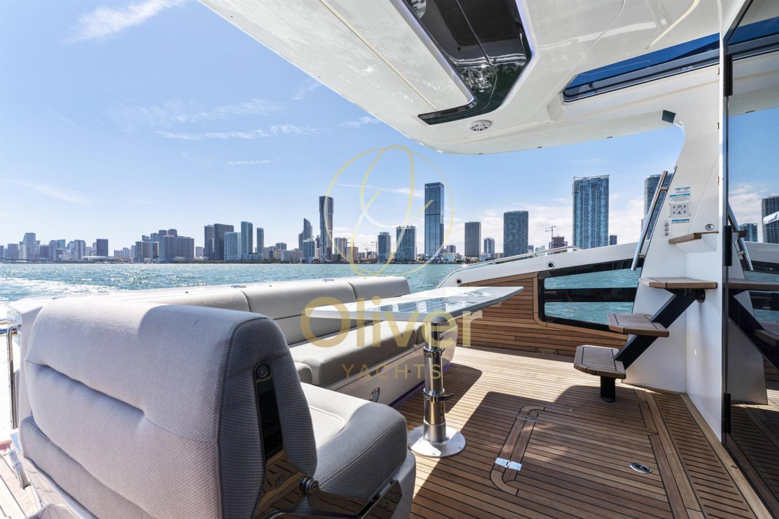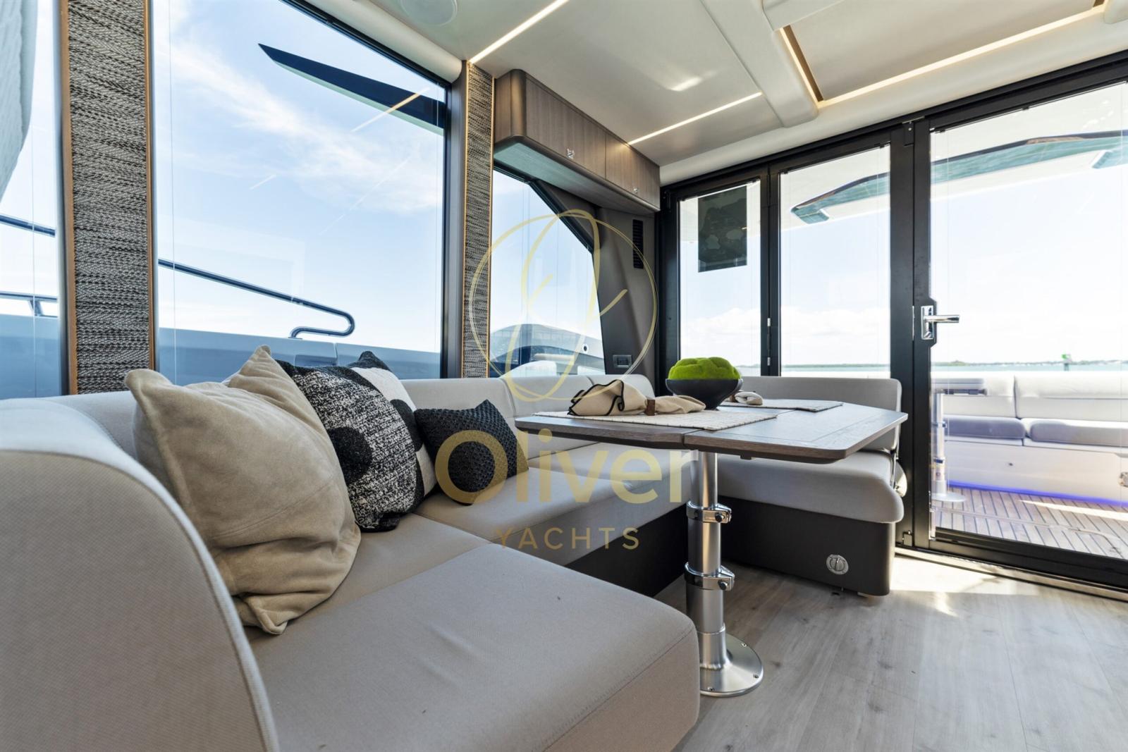 Le pont supérieur dispose d’un poste de pilotage avec un canapé à bâbord pour un compagnon, avec la zone de repos principale déplacée vers l’arrière. Le canapé en forme de L s’enroule autour de la table allongée et peut accueillir confortablement six personnes. Un bar humide vous permettra de vous rafraîchir et de garder les choses bien rangées. Le pont principal abrite deux zones de loisirs distinctes, la proue étant facilement accessible depuis les portes coulissantes de tribord à côté de la barre. Les clients peuvent choisir de soutenir le bimini pliable et le siège orienté vers l’avant pour une protection supplémentaire contre les éléments.