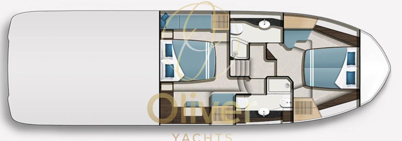 Les aménagements ci-dessous peuvent accueillir quatre passagers avec style, car le milieu principal et le VIP à l’avant offrent un volume et un espace de rangement importants. Pour les groupes plus importants, une disposition à trois cabines avec lits superposés est disponible. Les deux salles de bains ci-dessous ont une pomme de douche et une douche à hauteur debout.