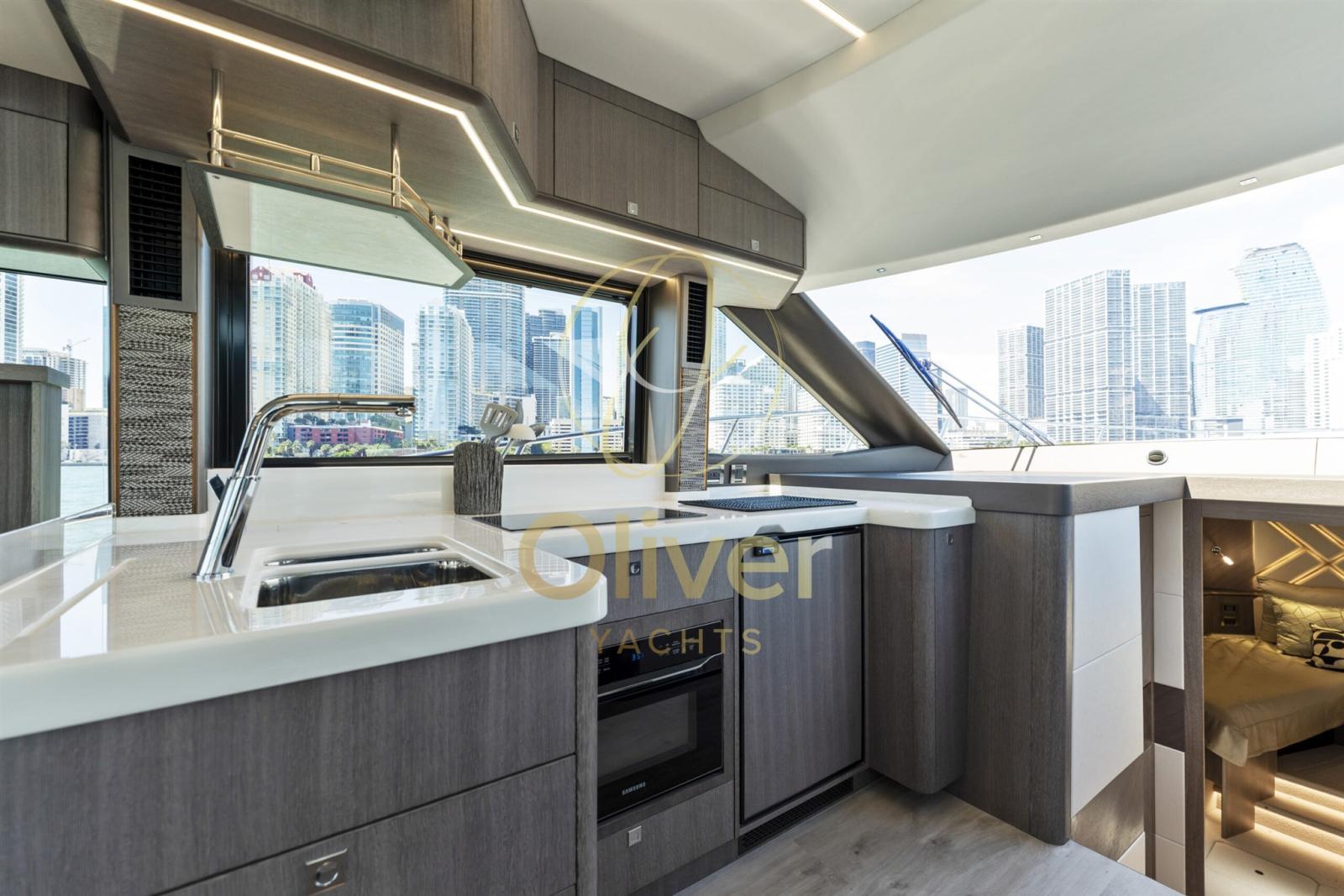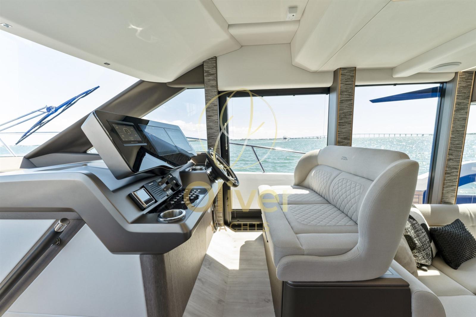 À l’intérieur, il y a une disposition classique avec la zone de couchage en retrait, séparée du cockpit uniquement par des portes coulissantes en verre. La cuisine et la timonerie sont déplacées vers l’avant, les cabines étant situées sur le pont inférieur.