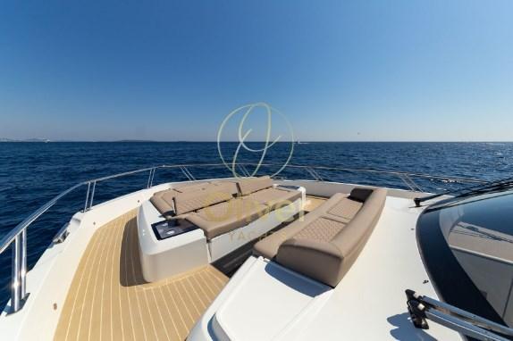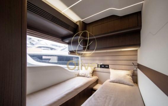 Le pont principal dispose du mode Plage préféré de tous, qui augmente considérablement la surface utilisable du cockpit et l’aide à se fondre parfaitement dans le salon et même à servir des rafraîchissements aux bars de bâbord et de tribord. La zone de la proue est divisée entre le solarium et un banc avec un dossier adéquat, utile si vous souhaitez profiter d’une navigation passionnante à l’avant. Une grande plate-forme hydraulique aide à soulever les jouets nautiques et permet un accès facile à l’eau et à la cabine double de l’équipage située à l’arrière.