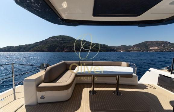 L’extérieur est mis en valeur par l’abondance d’espace sur les deux ponts et une pléthore de fenêtres qui promettent des intérieurs bien éclairés. Sur le pont supérieur, les clients trouveront deux zones de repos et de restauration en forme de U, opposées - combinez-les pour une expérience culinaire en plein air parfaite ! À l’avant, trouvez un coin salon et le poste de pilotage supérieur avec le bar et le grill reculés. La grande zone en porte-à-faux est équipée d’un espace ininterrompu pour les loisirs et les activités et peut être occupée par deux chaises longues autoportantes. Cette approche flexible de la distribution de l’espace vous permet de vous reposer pendant la journée et de divertir les invités le soir.
