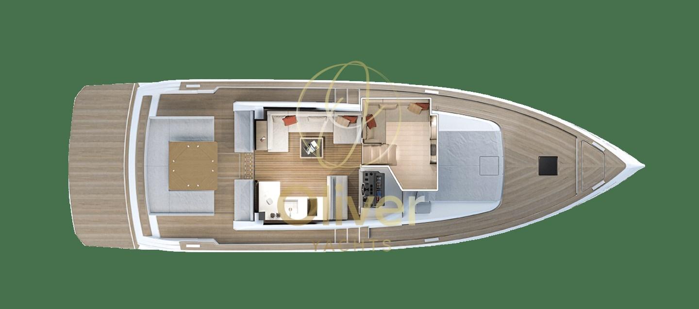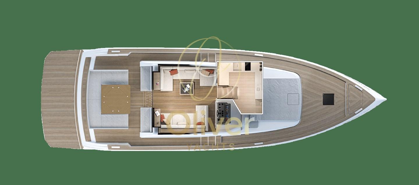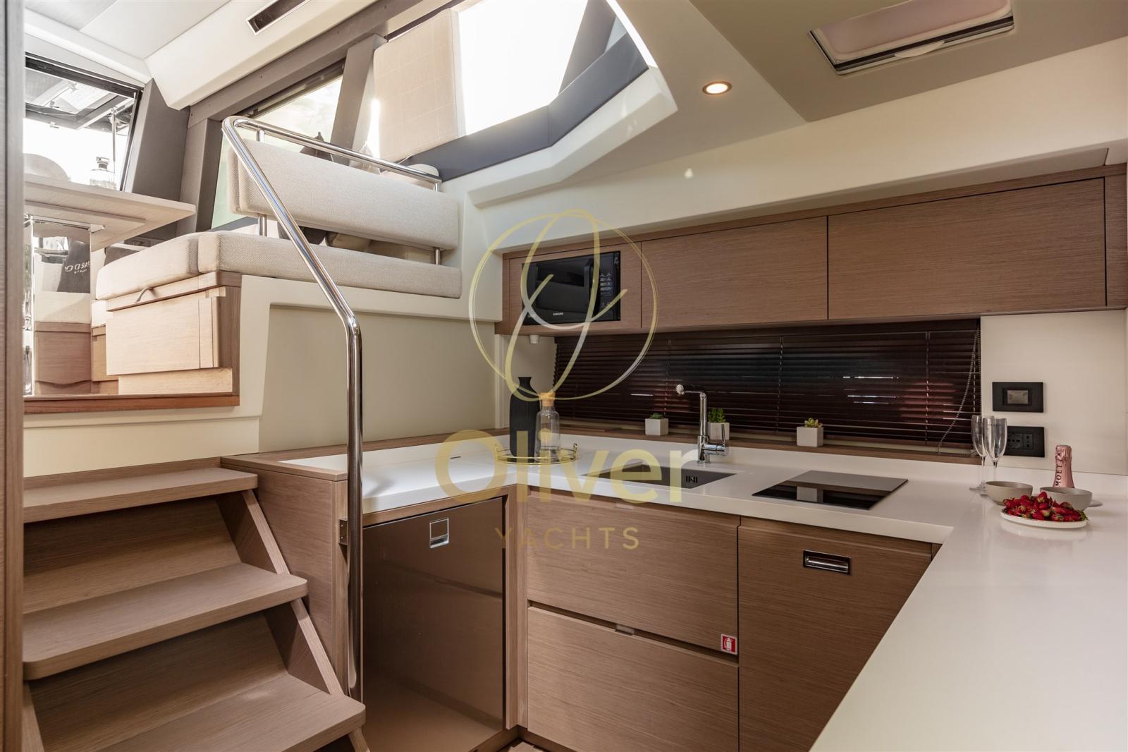 DISPOSITION DE LA CUISINE - Dans cette disposition, la cuisine est positionnée sur le pont inférieur, tandis que le pont principal abrite un immense salon qui communique directement avec le cockpit extérieur.
