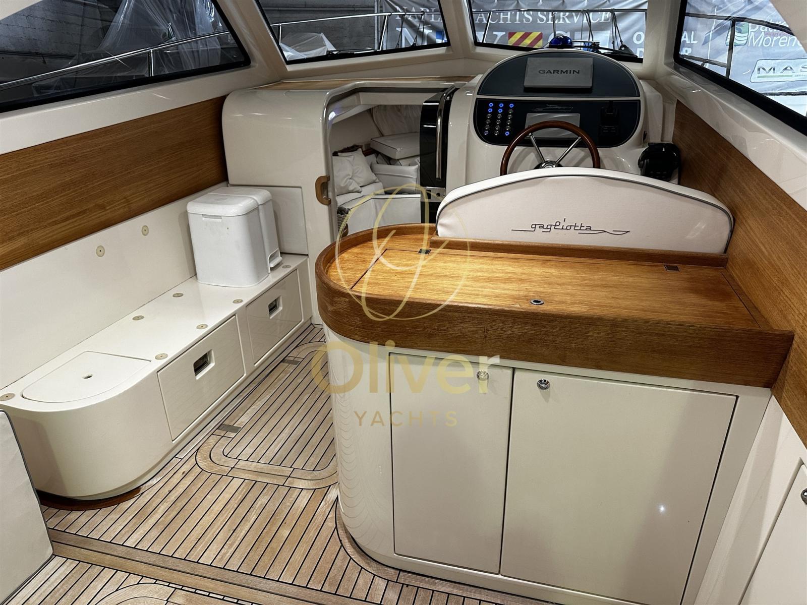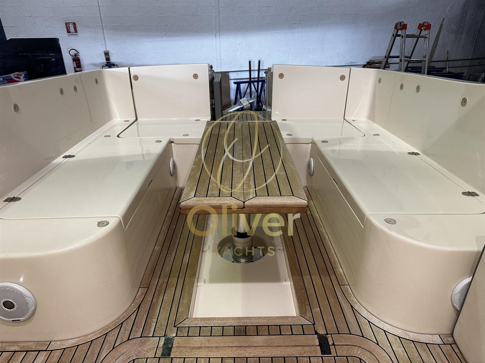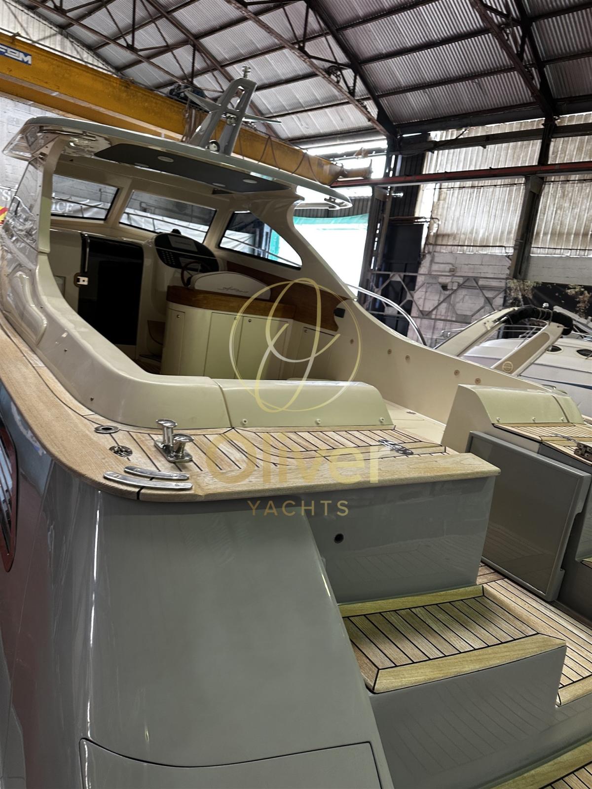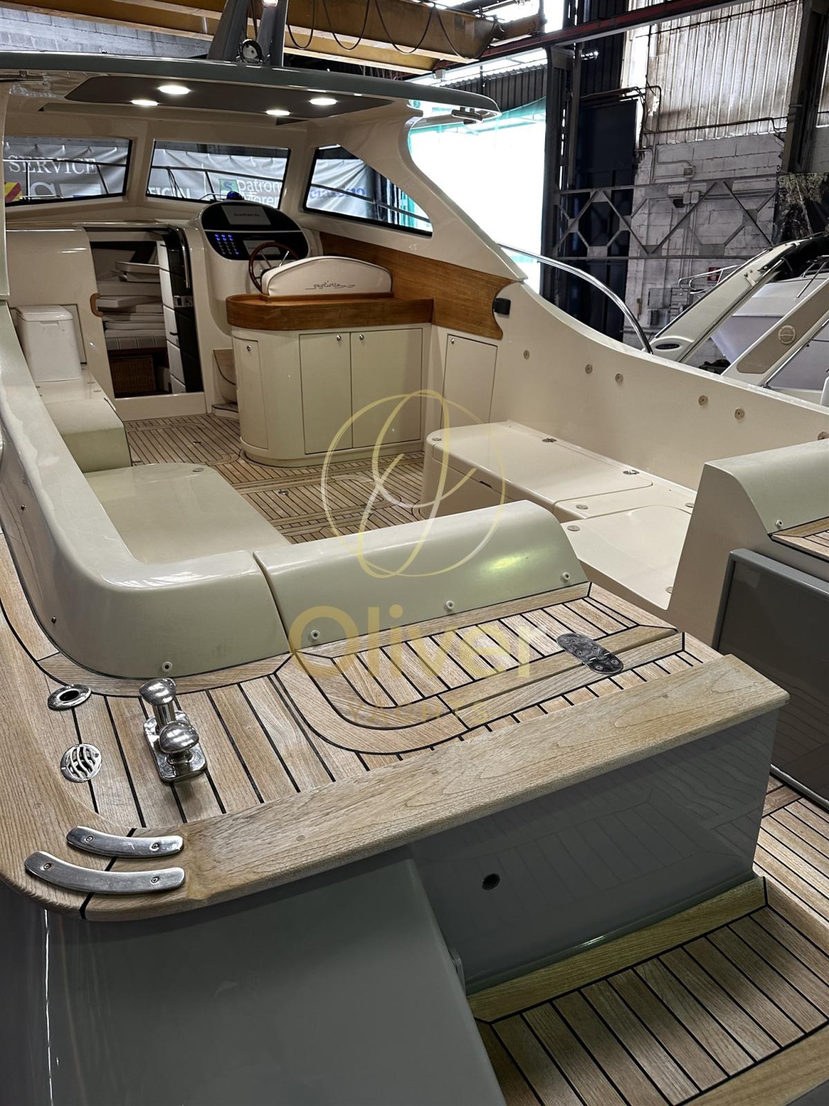 Alarme moteur, Alarme de pompe de cale, Ouverture du compartiment moteur électrique (Sala macchine poppa), Eau sous pression, Passavant en teck (fino a ponte di prua), Douche de cockpit, Flaps hydrauliques, Hard top, Extincteur(s) fixe(s), Indicateurs de flaps, Lavabo dans le cockpit, Éclairage de courtoisie, Passerelle (Besenzoni bianca a scomparsa), Pompe de cale automatique, Cockpit en teck (Pozzetto completo), Prise de quai, Onduleur, Guindeau électrique, table de cockpit (Elettrico pozzetto di poppa).