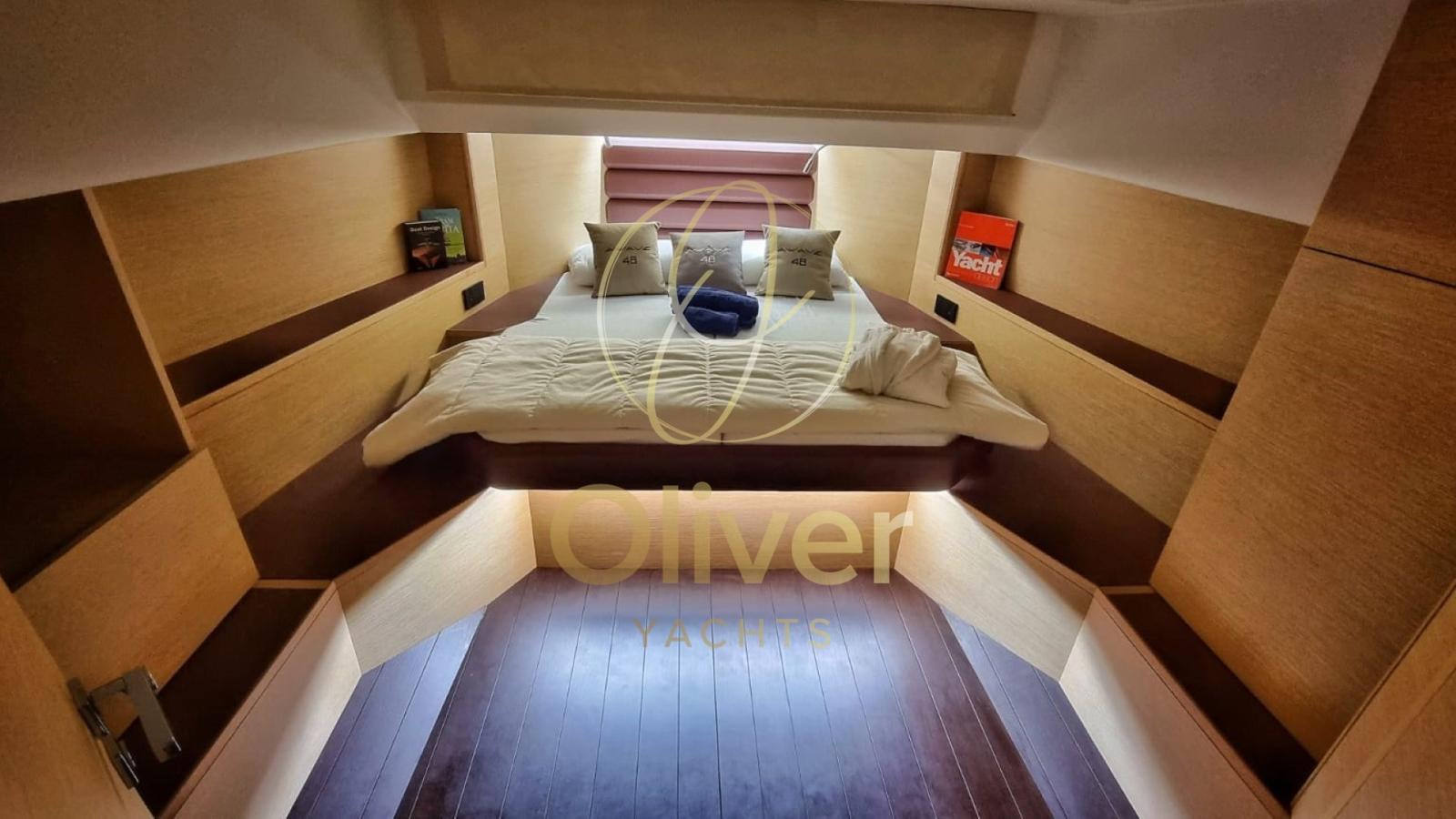 L’intérieur de l’AWAVE 48 a été conçu pour offrir un maximum de confort et d’habitabilité, avec une hauteur intérieure de plus de deux mètres qui garantit une atmosphère aérée et accueillante. Le design est soigné dans les moindres détails, avec une combinaison raffinée de chêne mariné pour les surfaces verticales et de wengé foncé pour les plans horizontaux, donnant une touche de chaleur et d’élégance aux pièces.