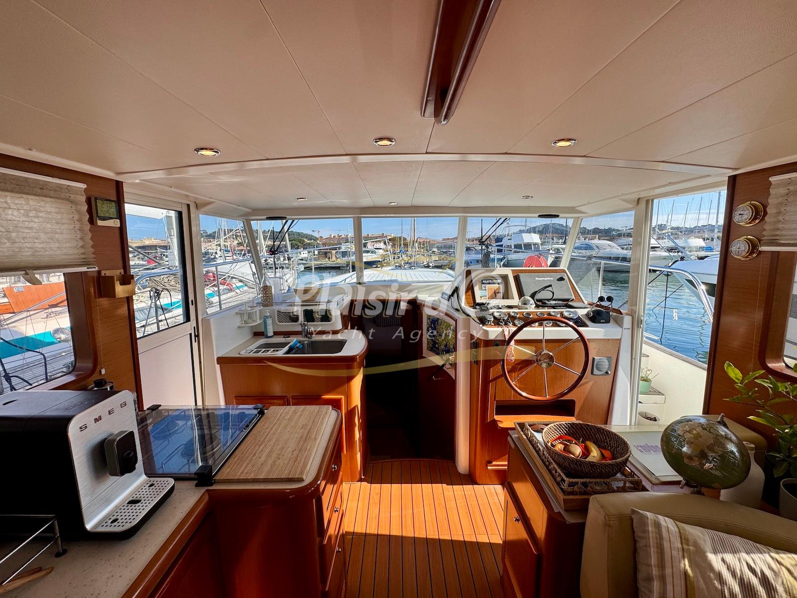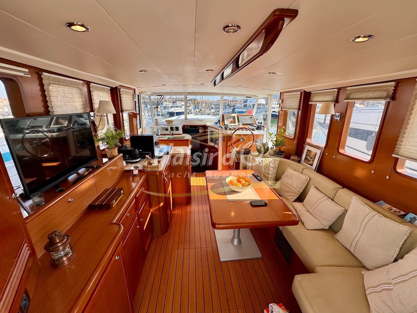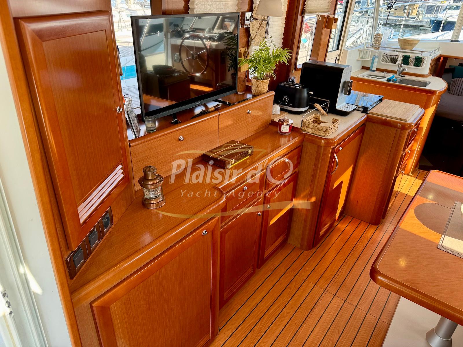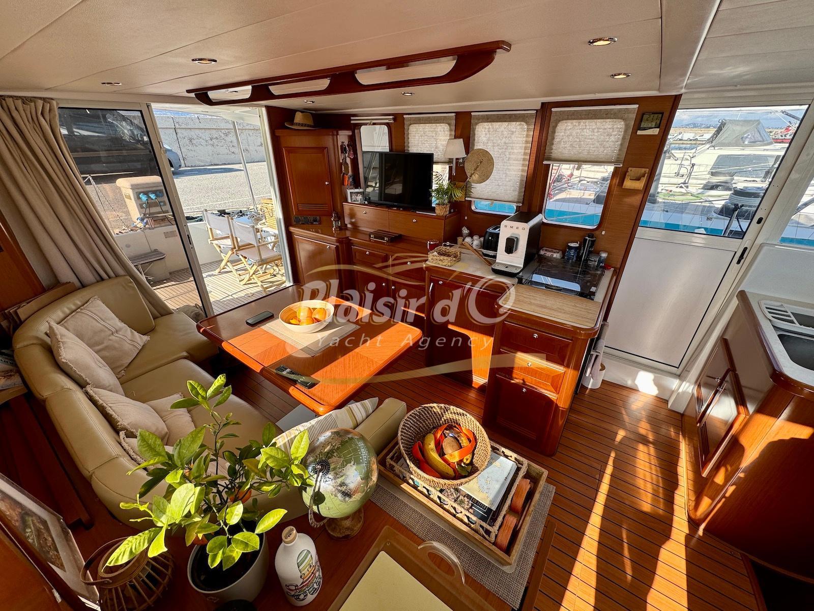 FULL OPTIONS : Climatisation réversible, générateur, passerelle hydraulique, pilote automatique, cockpit teck, GPS/sondeur Raymarine, propulseur d’étrave, VHF, TV, 2 réfrigérateurs, plateforme de bain allongée.