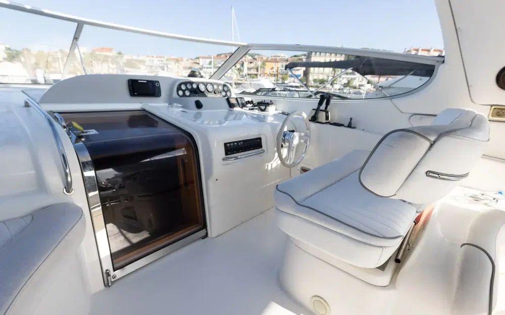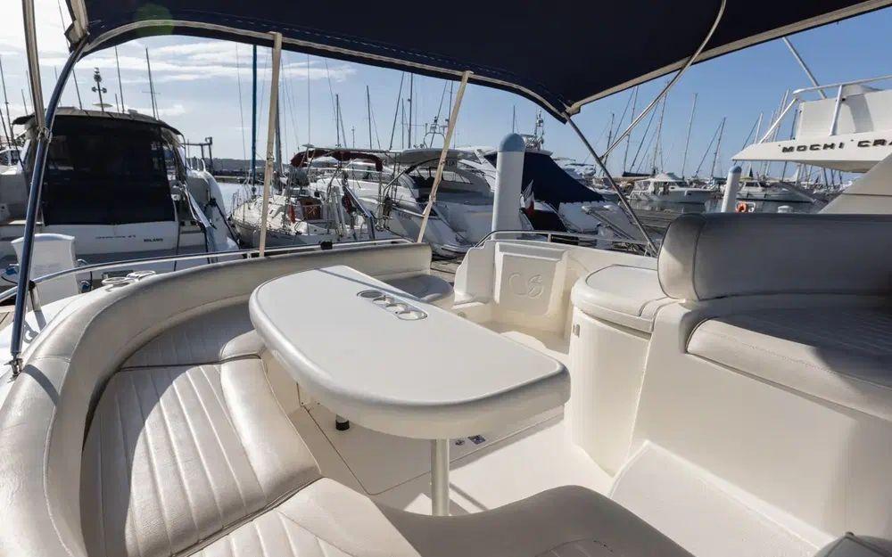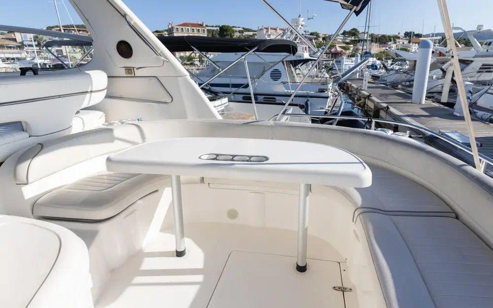 Esthétiquement cette unité présente quelques éclats de gelcoat et points de faïençage à divers endroits mais ce ne sont globalement que des défauts mineurs. Les selleries du carré intérieur ont été refaites et sont dans un état neuf. Les selleries extérieures sont en moins bon état.