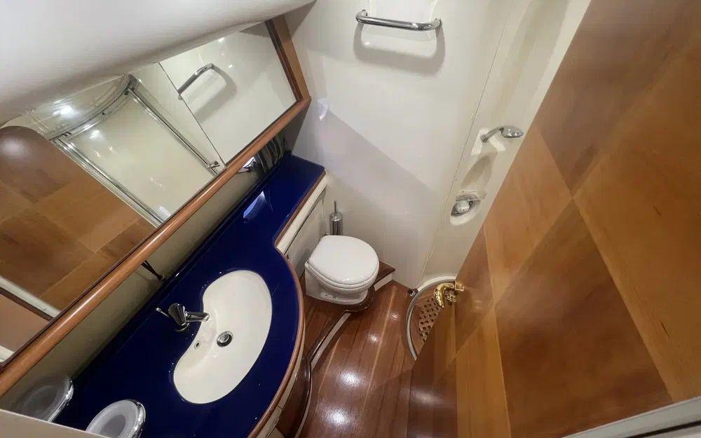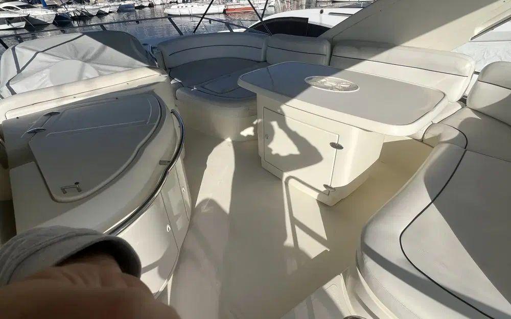 Dès l'arrivée à la poupe du bateau, nous observons clairement que le bateau est suivie avec attention. Le gelcoat est bien brillant et bien blanc sur l'ensemble du bateau. Lorsqu'on monte à bord les 5 m de largeur en imposent. La descente dans le cockpit depuis la passerelle hydraulique se fait avec une facilité déconcertante. Nous constatons d'emblée que toutes les superstructures sont dans un état proche de la sortie d'usine. Le teck présente quelques irrégularités en lien avec son âge qui restent mineures. Tous les équipements sont en ordre de marche.