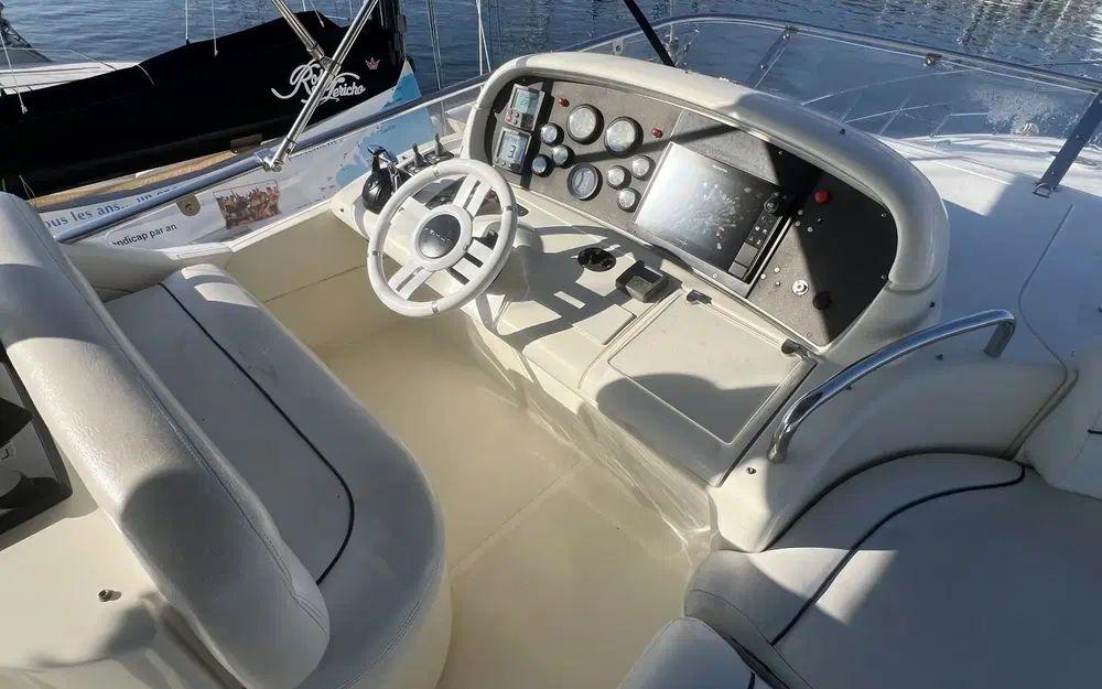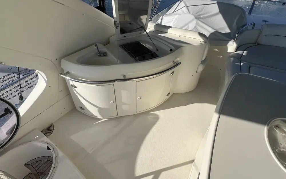 Au fly, tout est pensé pour passer des moments conviviaux. Un grand bain de soleil arrière, un grand carré avec une méridienne et un barbecue et un réfrigérateur et un évier. Le poste de commande à bâbord en position avancée est idéalement placé, a un encombrement réduit et permet une vue à 360° du bateau. Le pont accueille un grand bain de soleil et ici encore tout est en excellent état. Nous n'observons pas d'irrégularités. Les encadrements de fenêtres sont en très bon état et aucun point d'infiltration n'a été constaté.