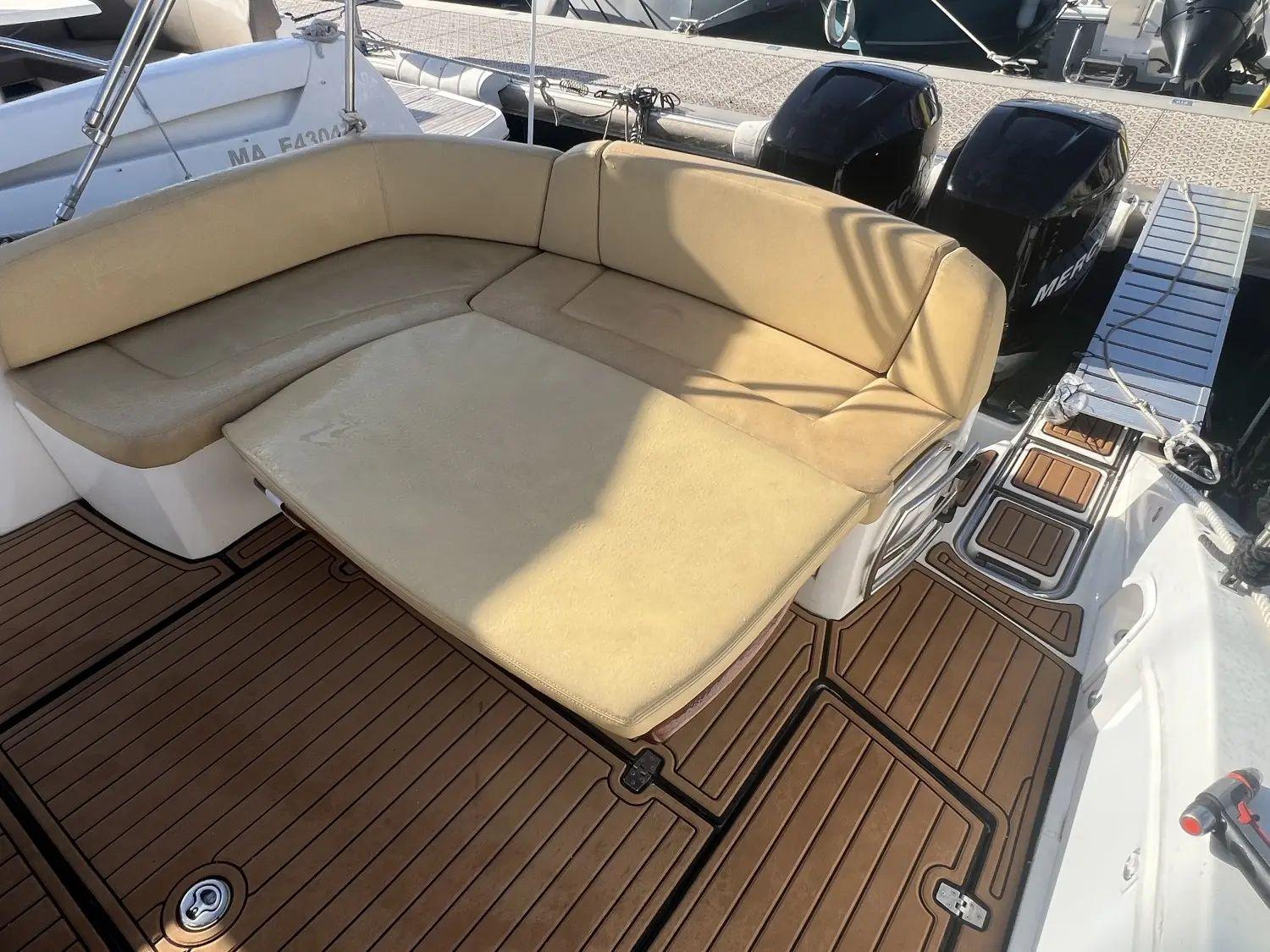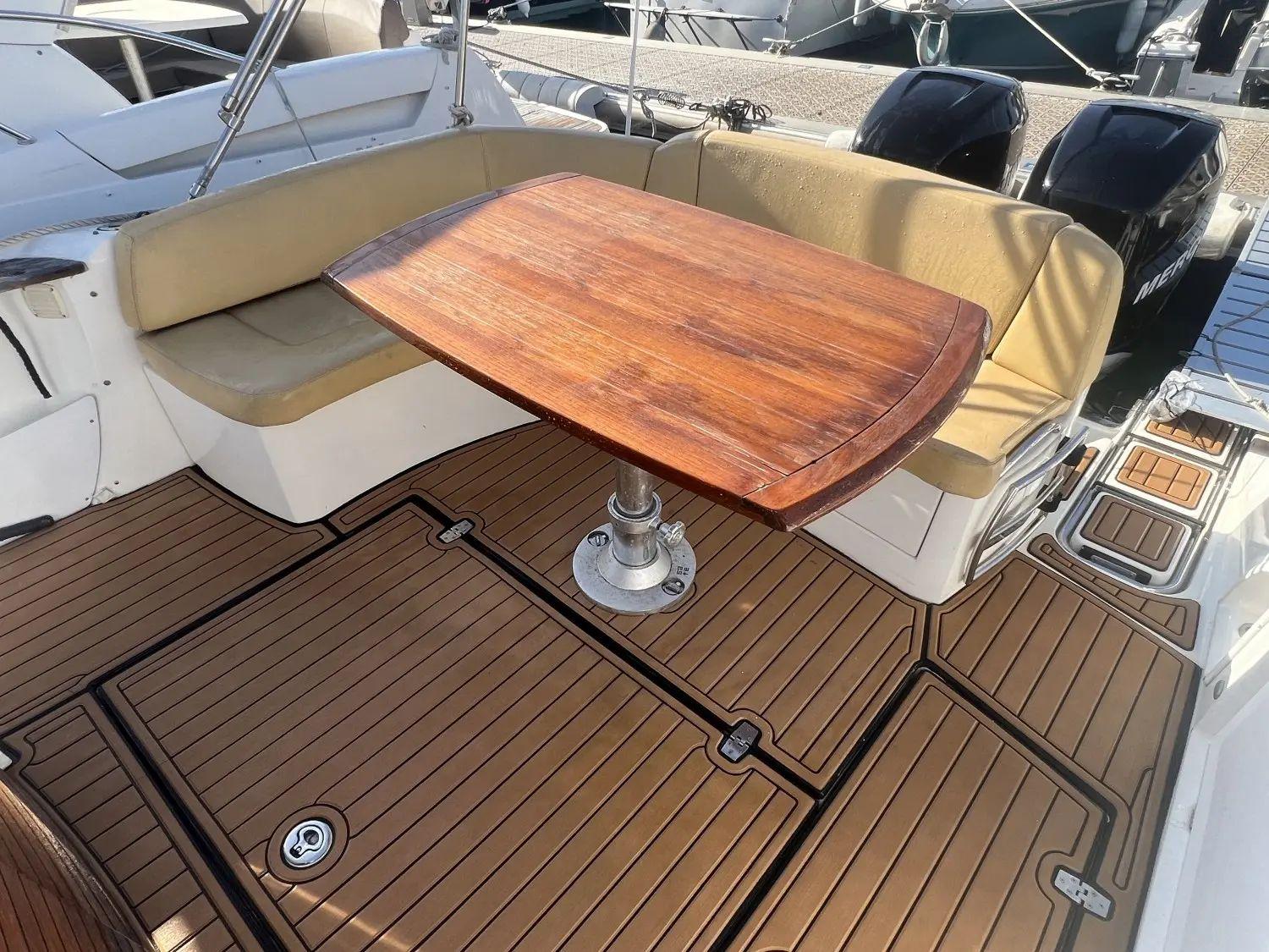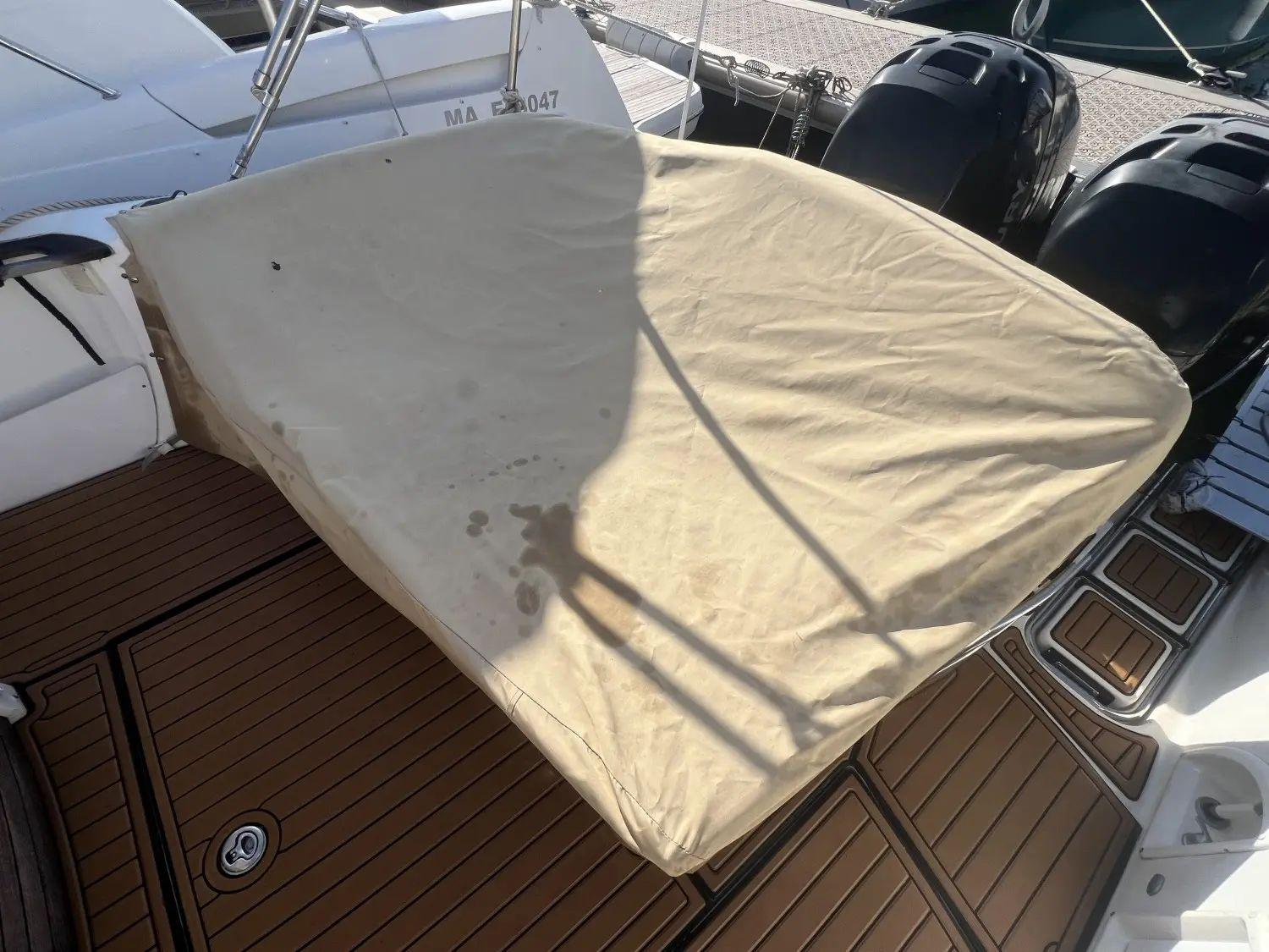 Le plancher en flexiteek a été réalisée en début de saison 2024. La réalisation est de bonne facture. Les selleries sont toutes d'origines à l'exception du dossier du bain de soleil avant. L'état de présentation de ces dernières est correct. Les tauds de console, de cockpit et le bimini sont en état d'usage.