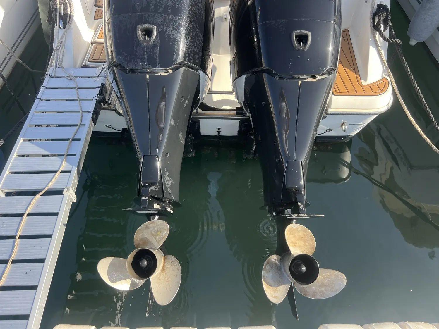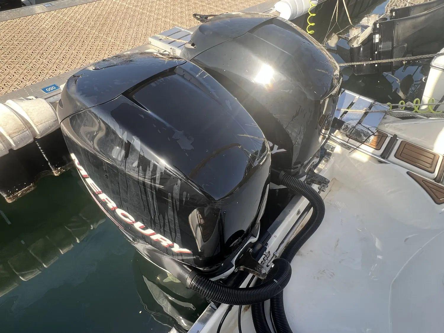 Les deux moteurs Mercury de 225cv démarrent dés la première sollicitation sans aucune fumée ou bruit anormal. Les capots moteurs ont été récemment repeints. Les moteurs sont équipés d'hélices en inox 3 pâles avec écrou antivol suite à une mauvaise expérience. Pas de remarque particulière à faire apparaître sur ce point.