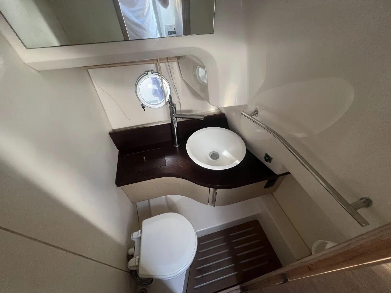 Cette unité a été peu sollicité par ses propriétaires actuels qui détiennent le bateau depuis 2012 dans la partie nuit et salle de bain. Les selleries sont en bon état et les vaigrages sont en place. La partie cuisine présentent les points de vieillissement communs aux Key Largo 28 avec les parties boisées qui réagissent mal aux différentes projections d'eau de l'évier. Les planchers sont également un peu marqués par le temps dans la partie centrale et sur les marche de la descente vers la cabine.