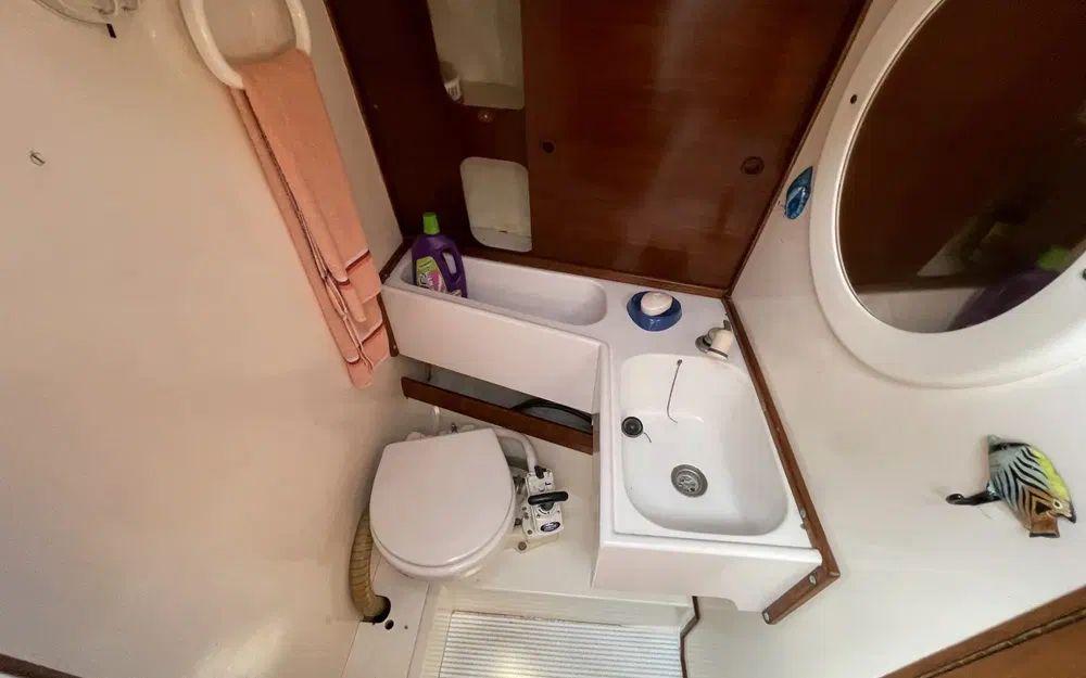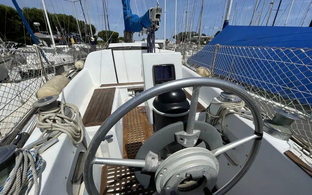 cet unité nous offre des passavants large et un pont flush deck. niveau voile : 2 génois, 2 grand-voiles, voile de Cap, foc, tourmentin, Foc