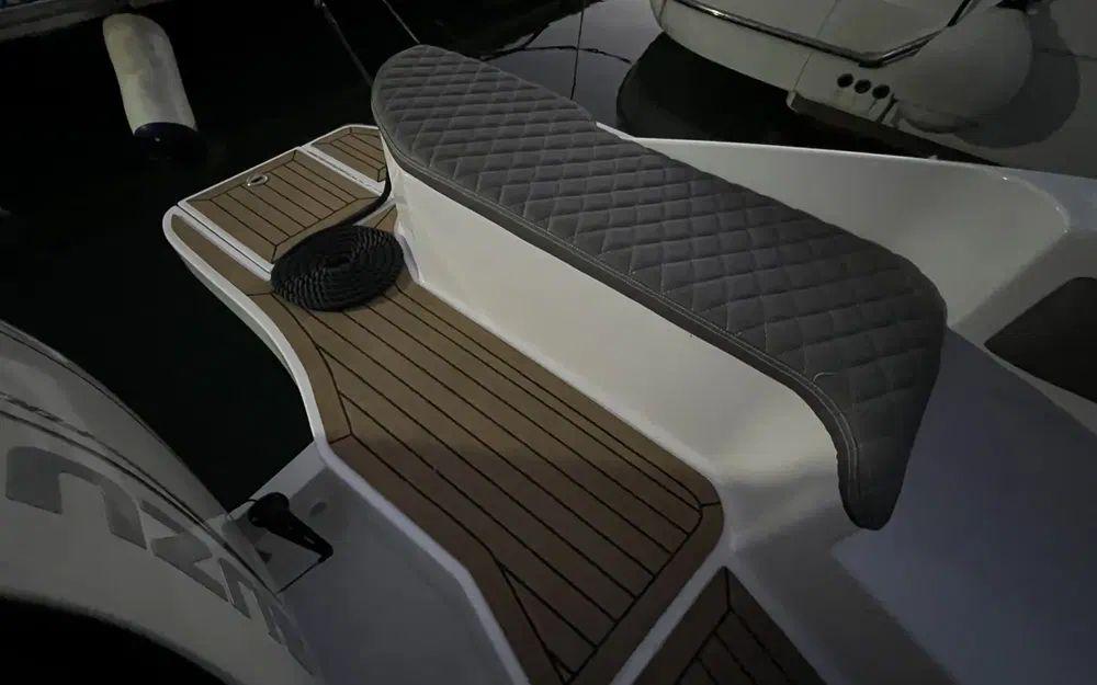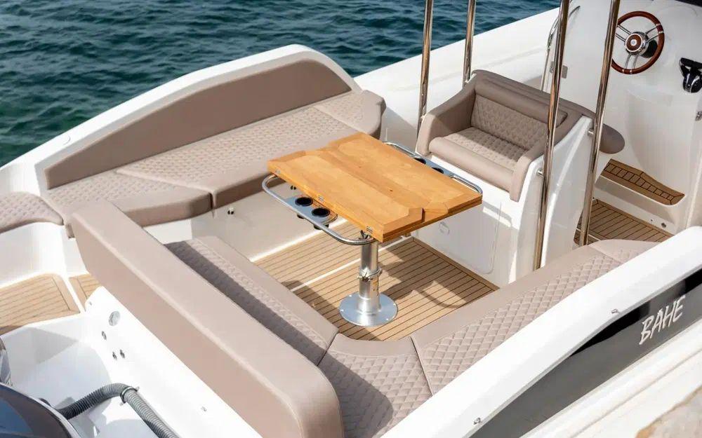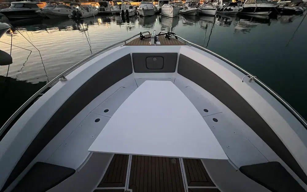 Le Espadon 1000 est très attrayant et remarquablement bien aménagé. Il offre un imposant salon en U à l'arrière ainsi qu'à l'avant transformable en grand bain de soleil. Le parti pris du T-top fixe sur cette unité renforce le sentiment de sécurité à bord et permet également d'intégrer aussi bien des rangements que de l'électronique.