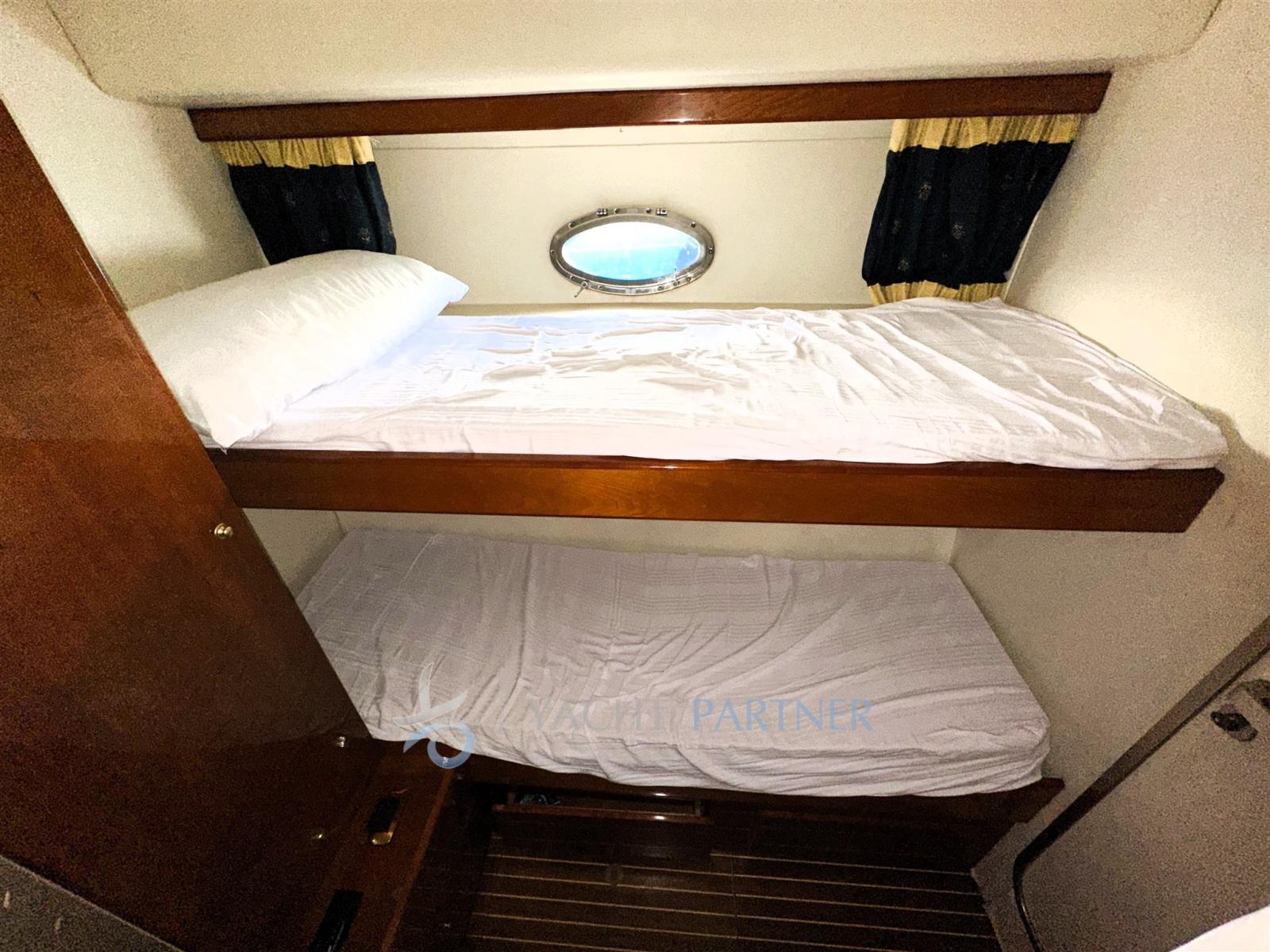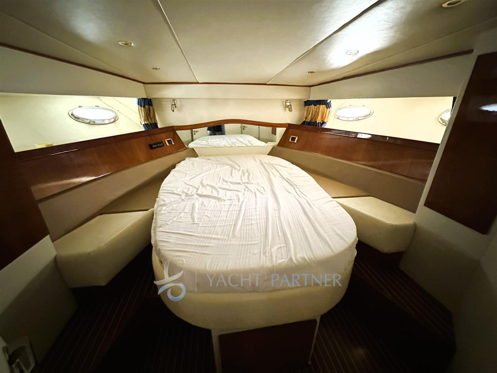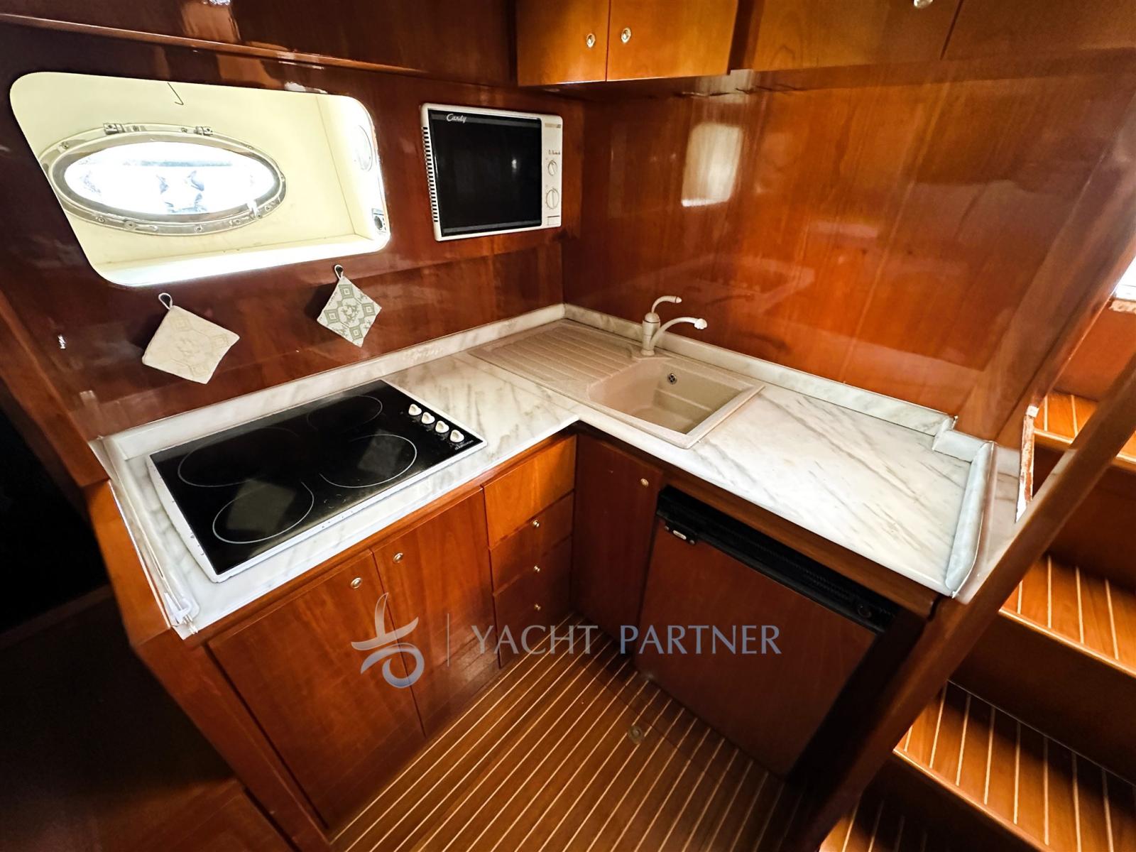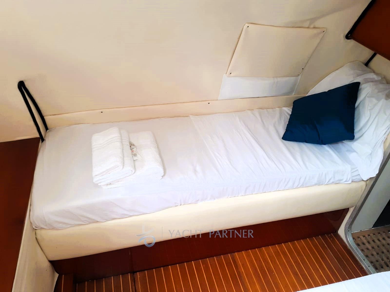 Grand cockpit habitable avec table, bain de soleil et espace détente ; Intérieurs lumineux avec salon central, cuisine équipée et finitions en bois clair ; 2 cabines doubles + cabine équipage avec WC ; 2 salles de bain complètes, douche intérieure et extérieure ; Cuisine complète : four, réfrigérateurs intérieur/extérieur, micro-ondes, plaques électriques ; Toite, coussins complets d’étrave et de poupe, passerelle hydraulique