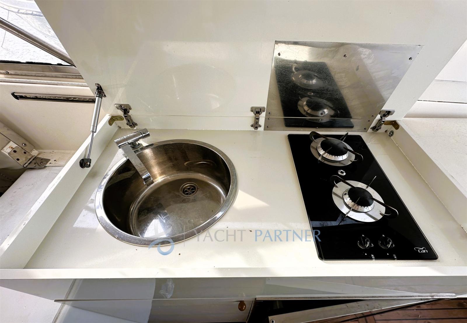 Eau sous pression, Douche de cockpit, Flaps hydrauliques, Passerelle, Plateforme arrière, Pompe de cale automatique, Pompe de cale manuelle, Porte latérale, Prise de quai, Guindeau électrique, table de cockpit, Table pliante de salon.