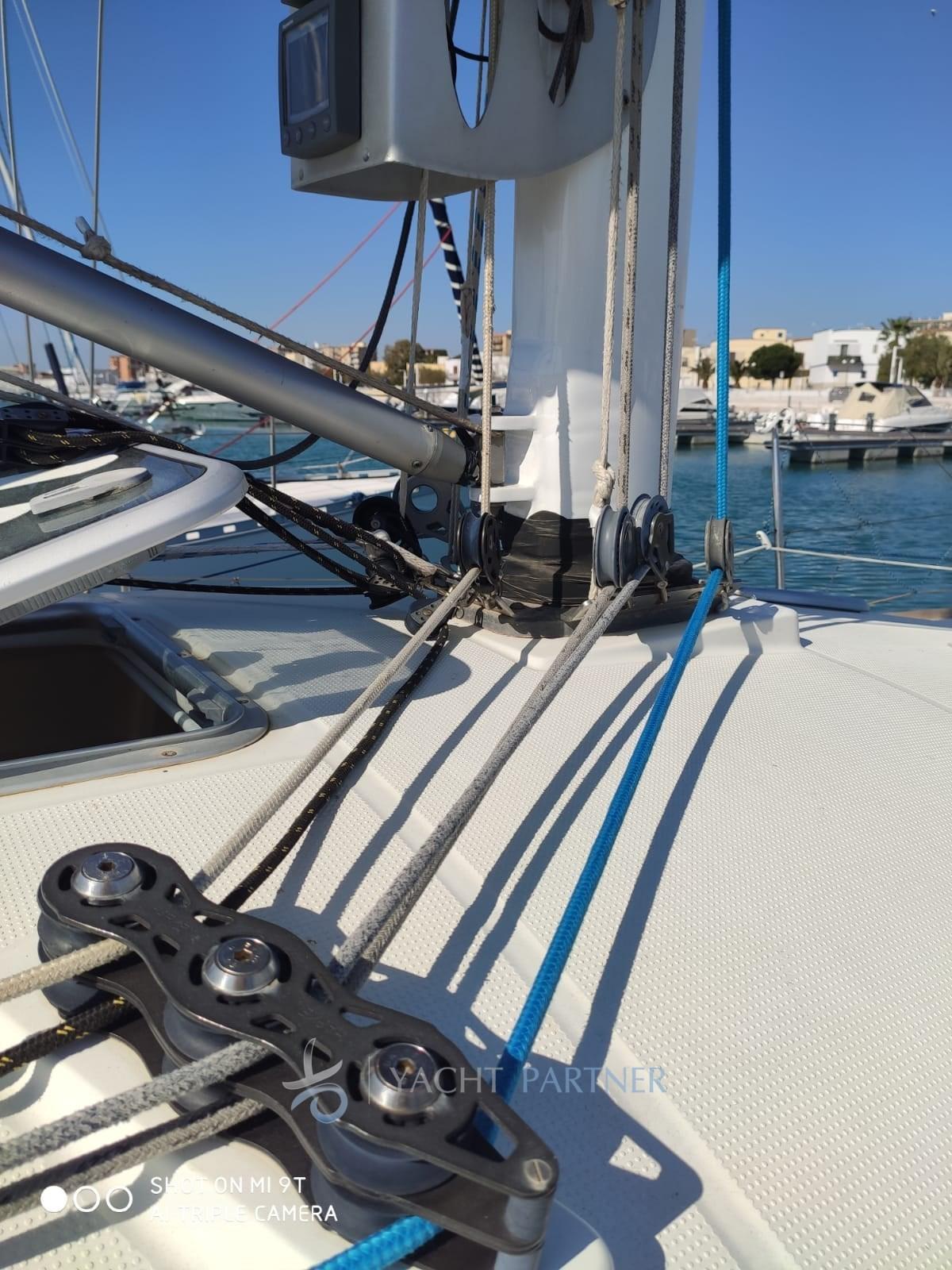 Alarme moteur, Eau sous pression, Radeau de sauvetage (10pp), 2 Batteries, Douche de cockpit, Moteur d'annexe, Pompe de cale manuelle, Cockpit en teck, Prise de quai, Connexion eau sous pression à quai, Répétiteur électronique, Guindeau électrique, Gréement Rod (rifatto nel 2018), Echelle de bain, Chaise support HB, Annexe, 4 Winch, Windex.