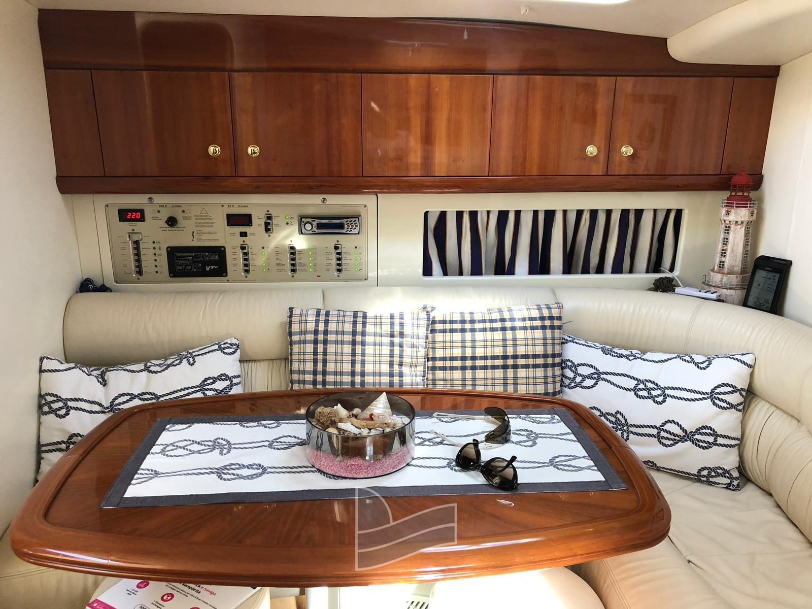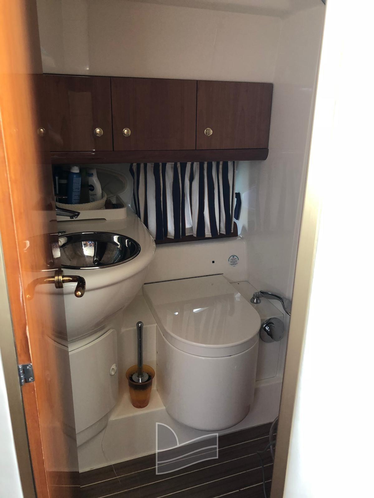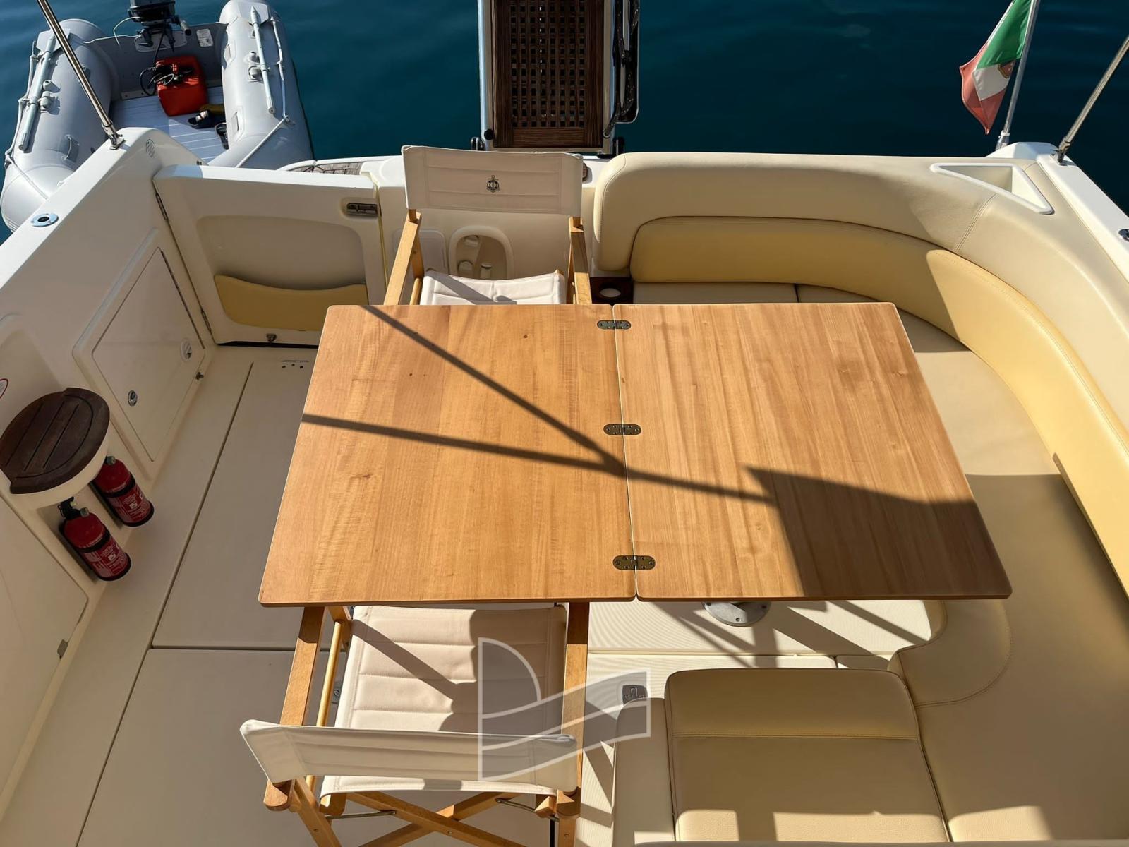 Eau sous pression, Couleur spéciale (Blue Navy), Douche de cockpit, 2 Flaps électriques, Extincteur(s) fixe(s), Lavabo dans le cockpit, Passerelle (Idraulica), Plateforme arrière (di poppa rivestita in teak), Porte latérale, Prise de quai, Connexion eau sous pression à quai, Rollbar, Guindeau électrique, Echelle de bain, table de cockpit (in teak), Corne.