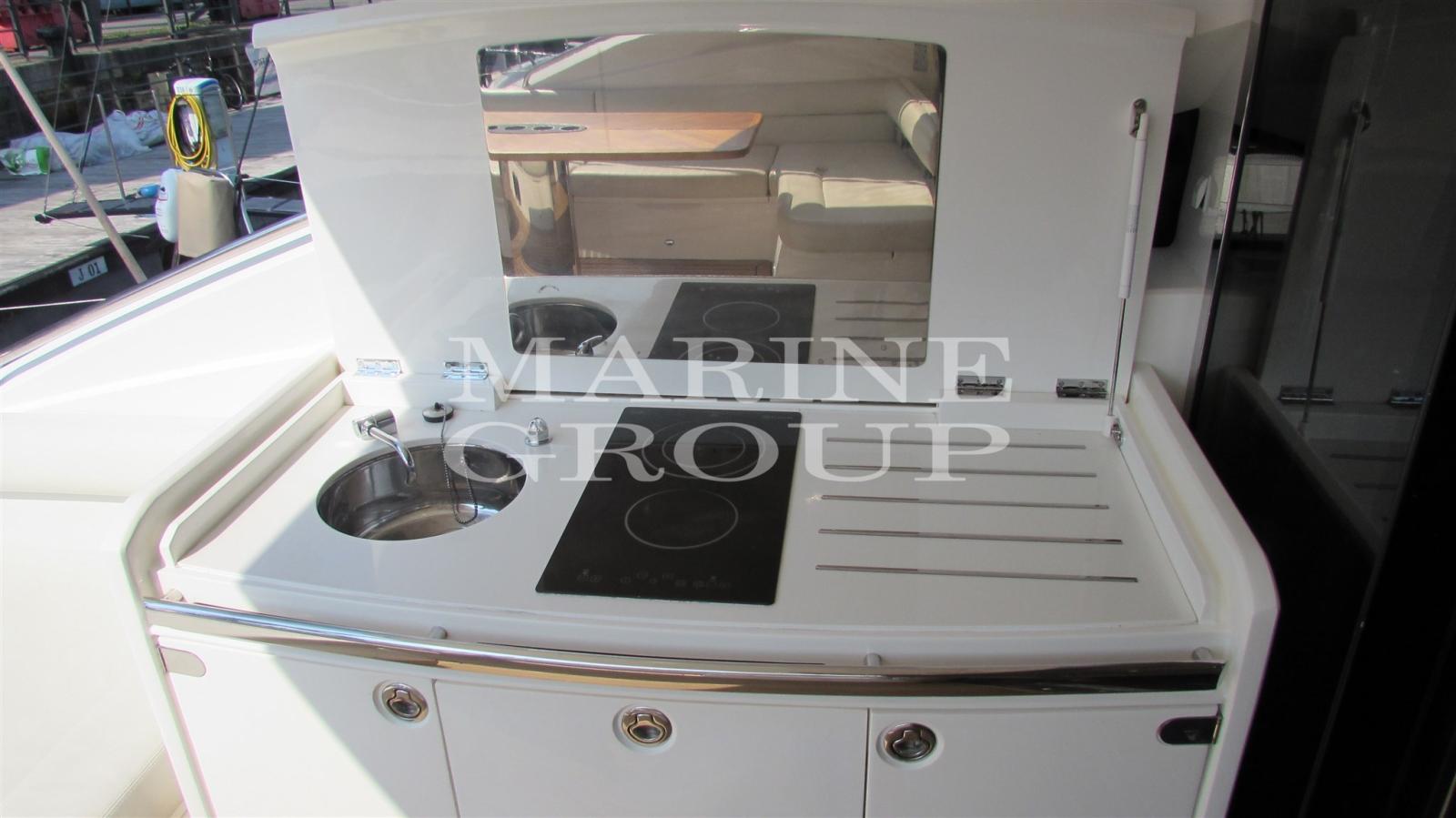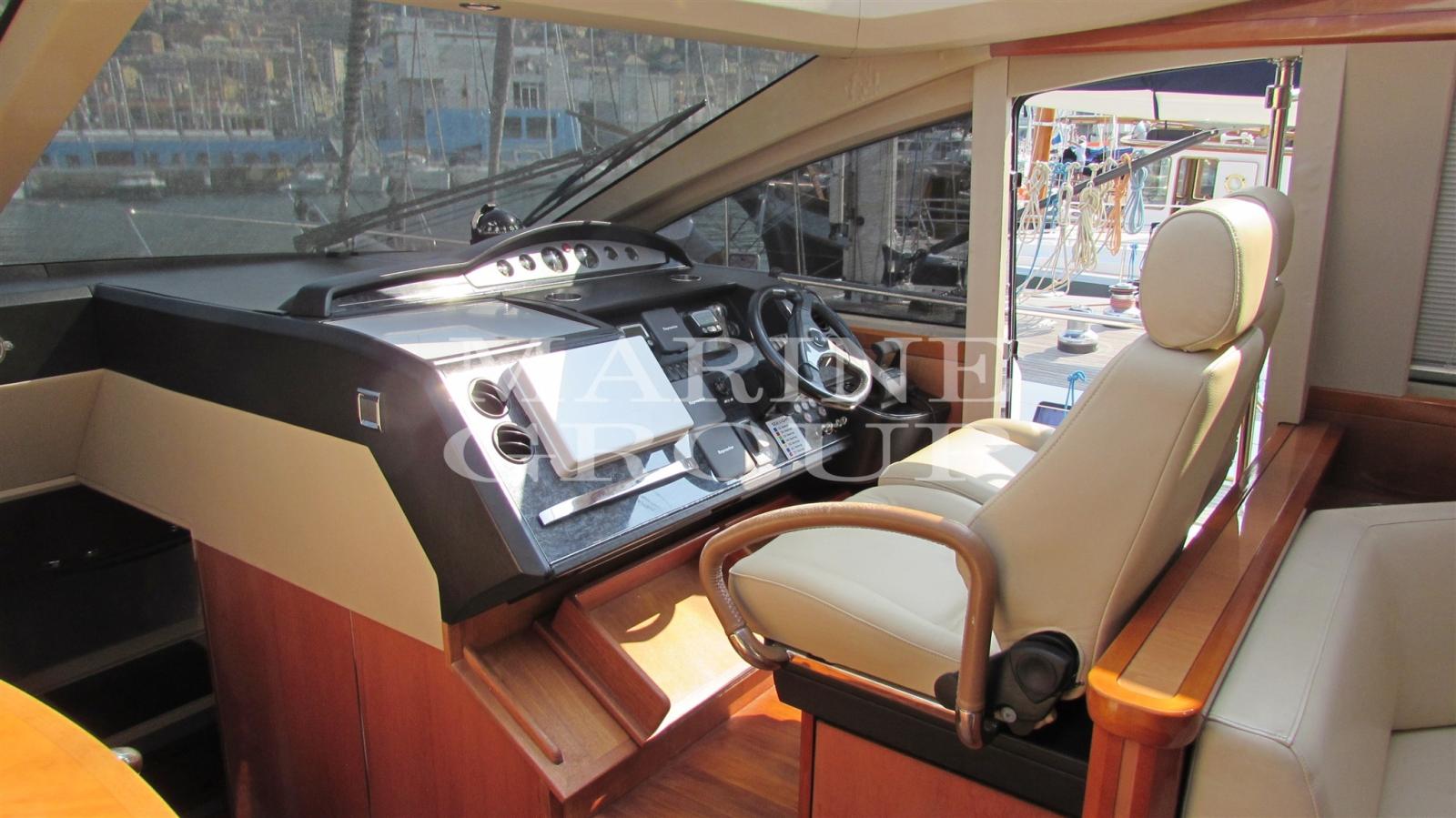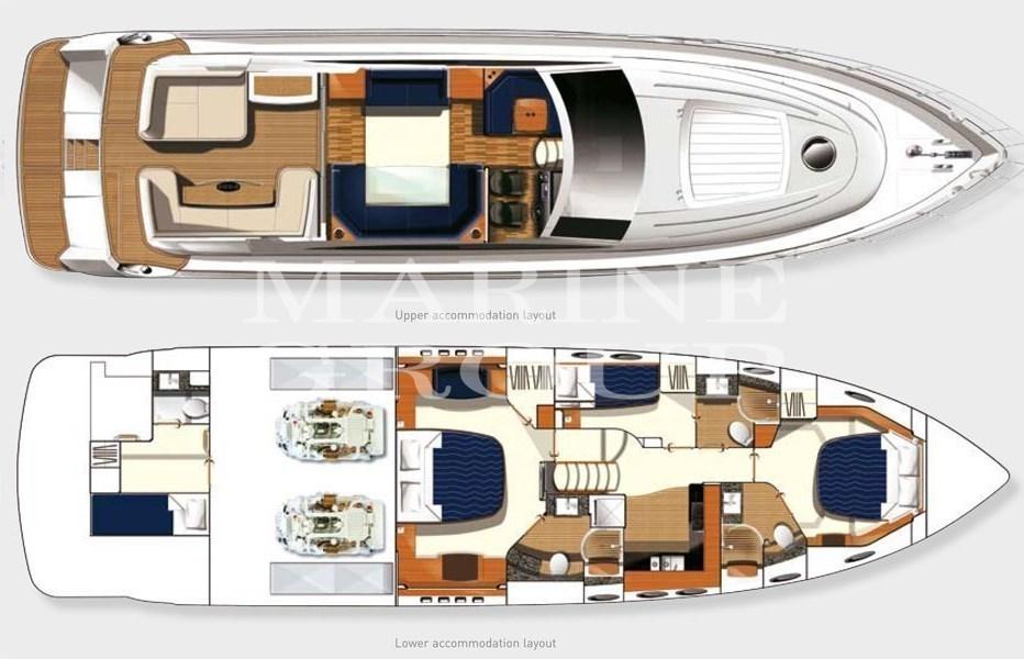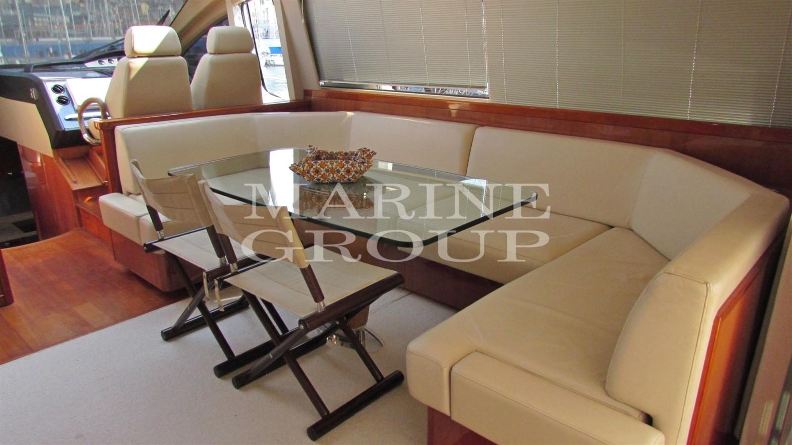 Grand cockpit avec solarium et table avec sièges et portes coulissantes - Salon intérieur avec TV escamotable - Cuisine équipée - Cabine principale au milieu du navire avec salle de bain attenante - Cabine VIP à l’avant avec lit double et salle de bain attenante - Cabine invité avec lits superposés et salle de bain attenante - Cabine équipage avec salle de bain arrière