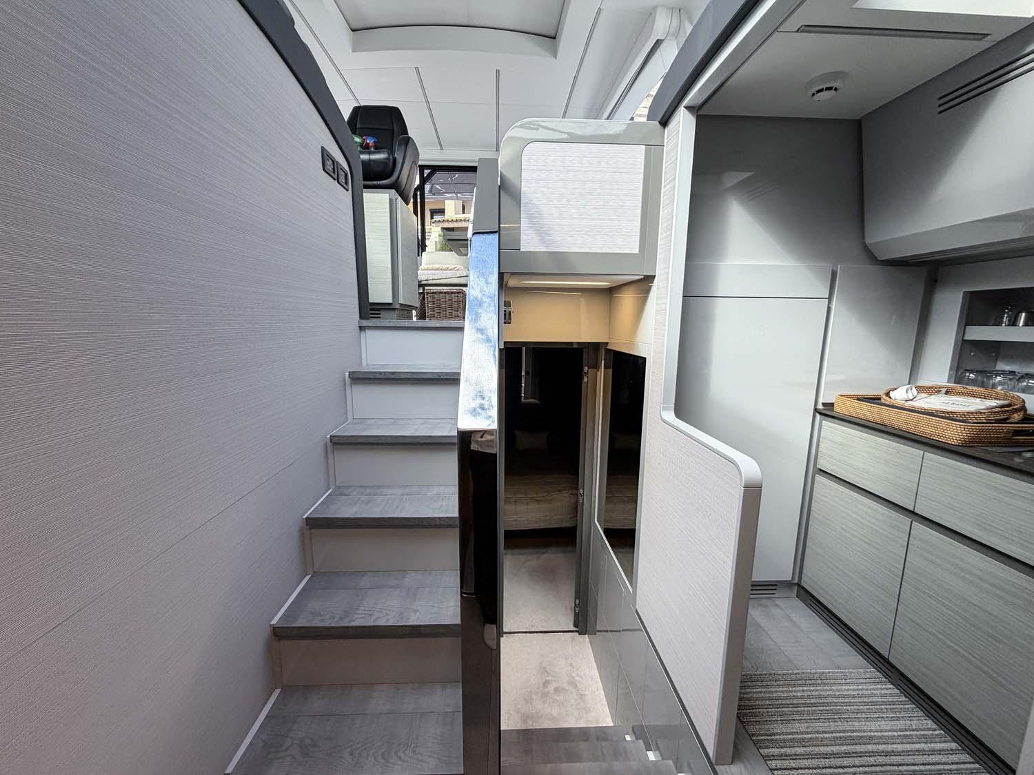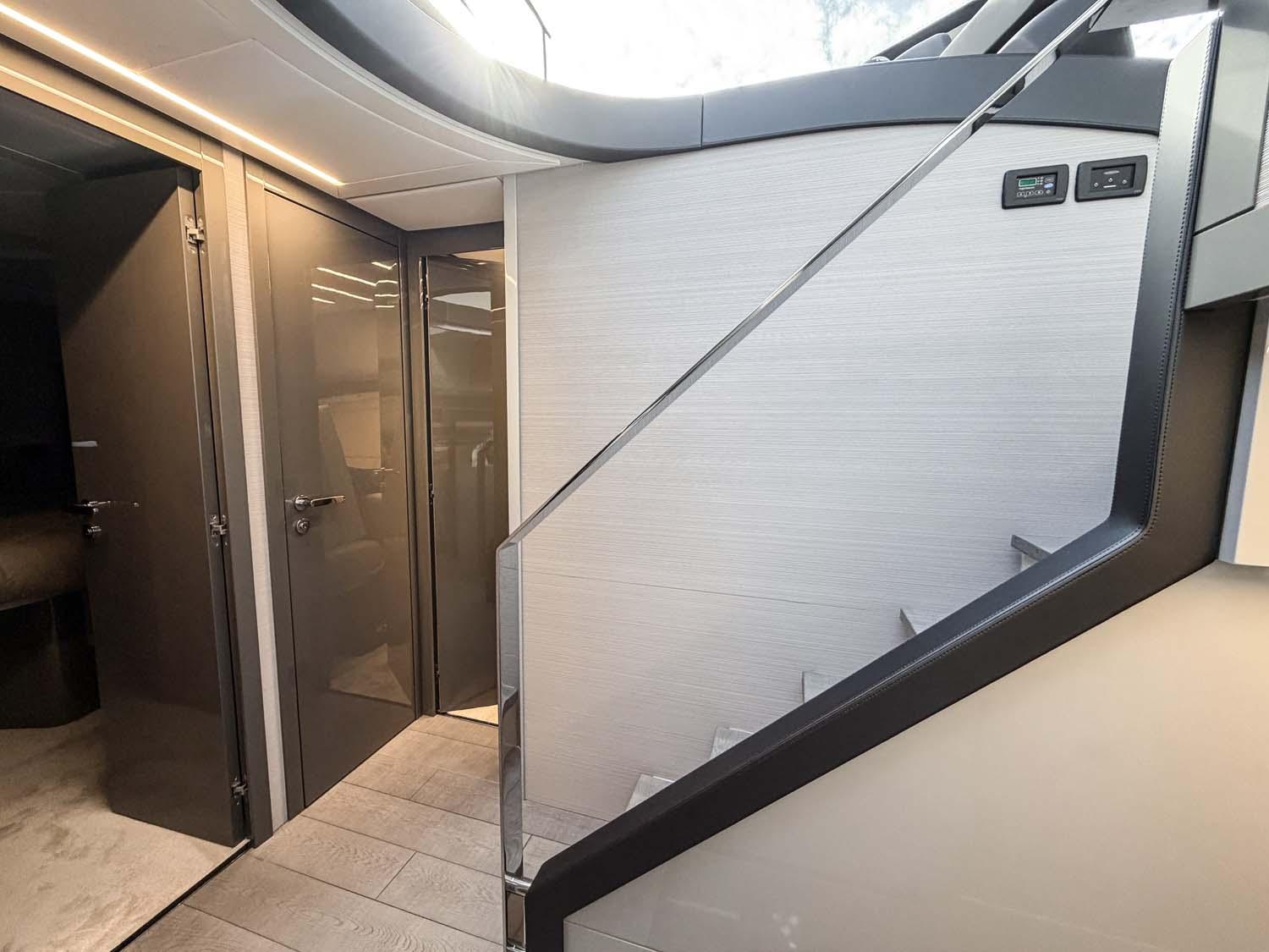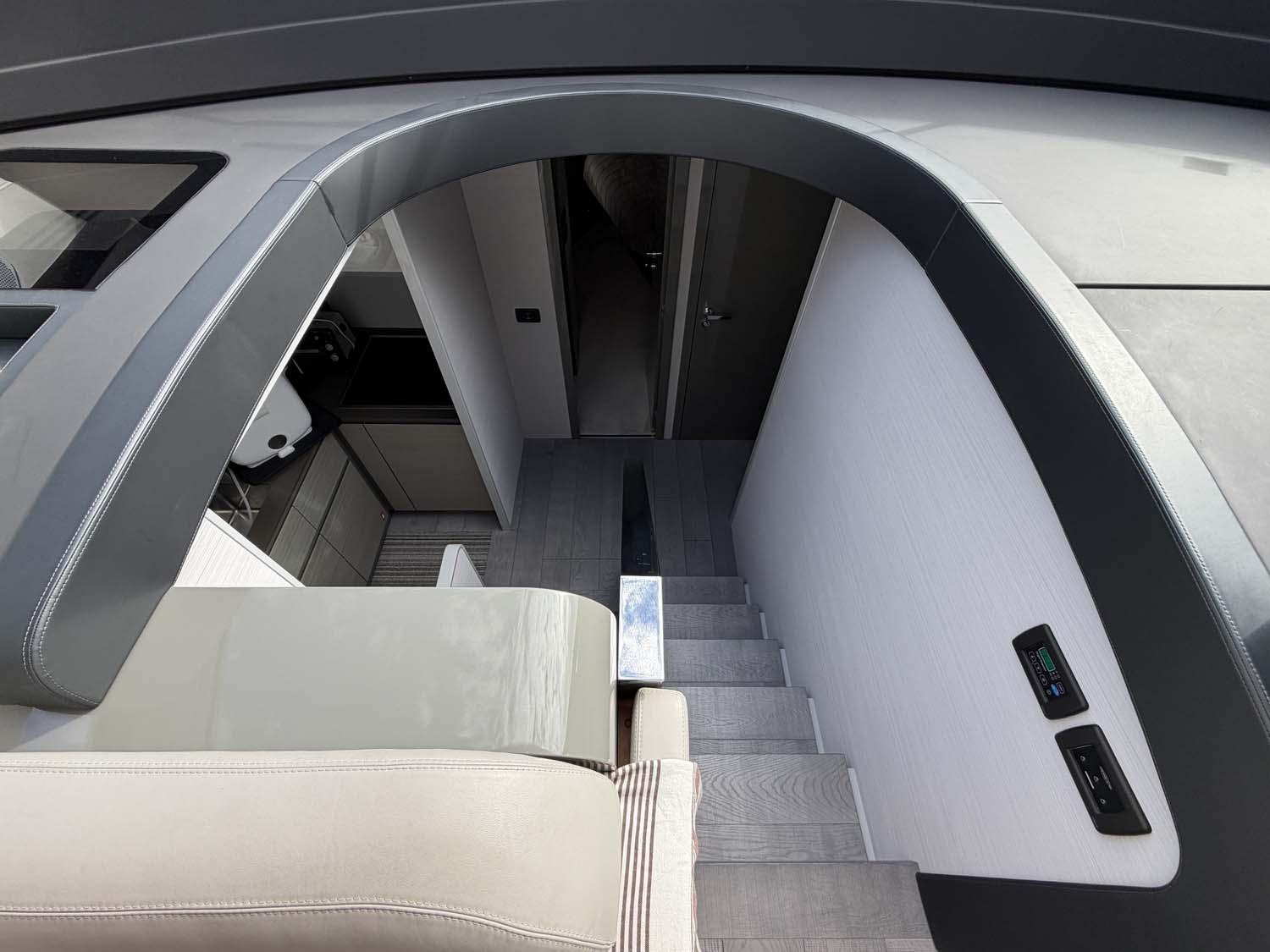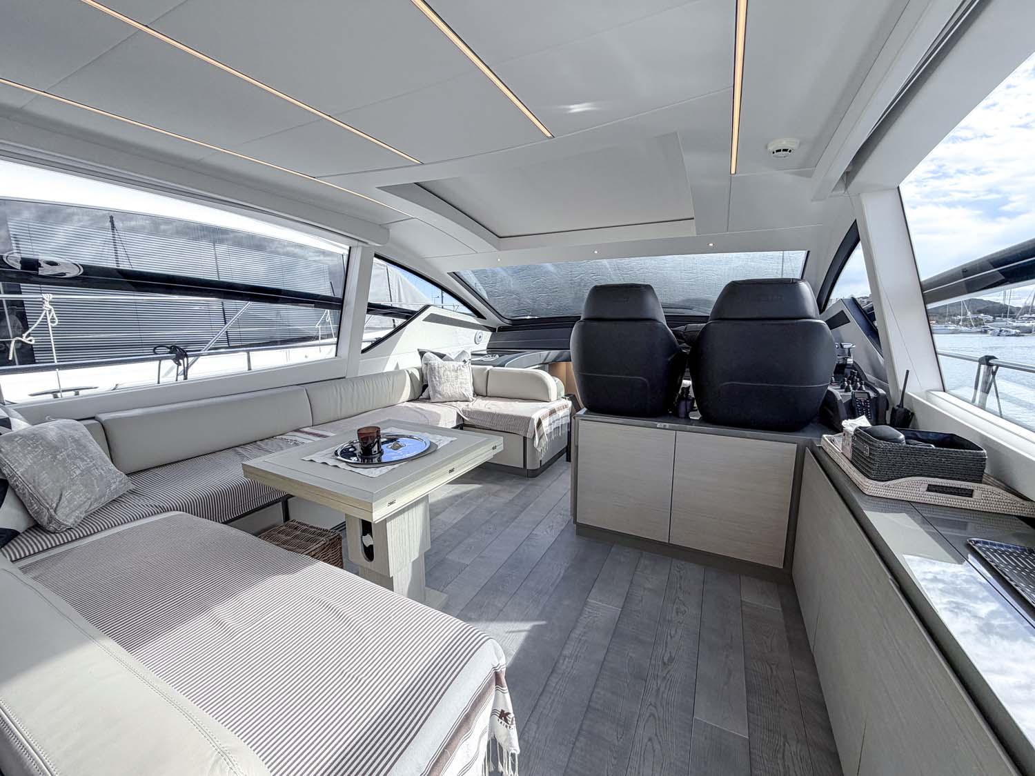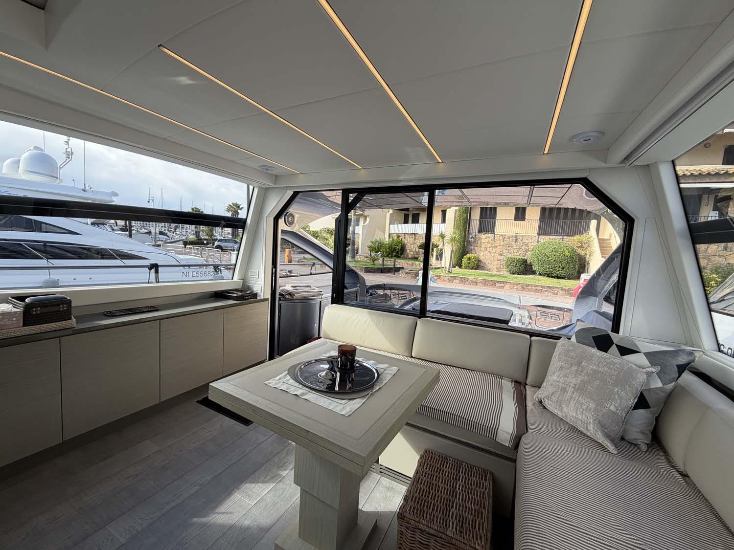 À l’arrière, le cockpit est pensé comme un véritable espace de vie à ciel ouvert : un large bain de soleil et un coin repas ombragé.Grâce à la grande baie vitrée coulissante, l’espace intérieur se prolonge naturellement vers l’extérieur, pour une circulation fluide et une expérience à bord aussi agréable qu’immersive.