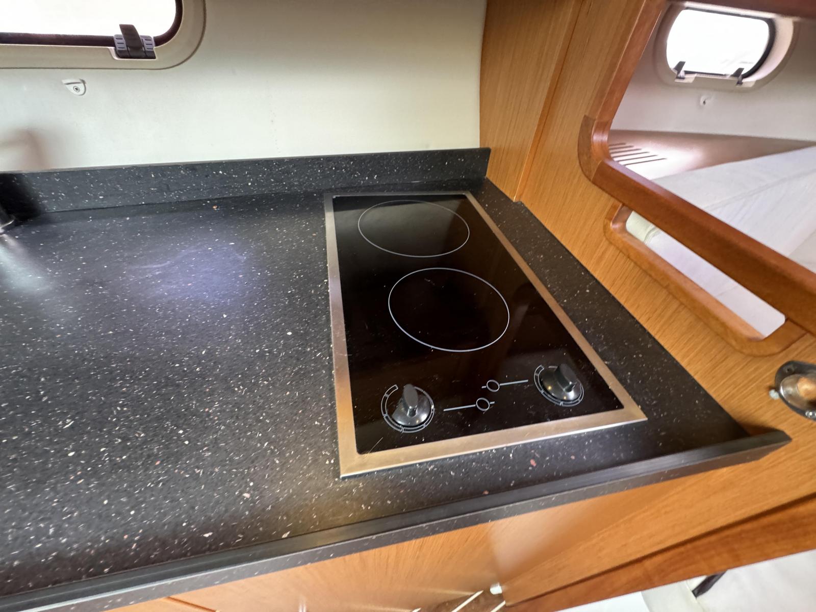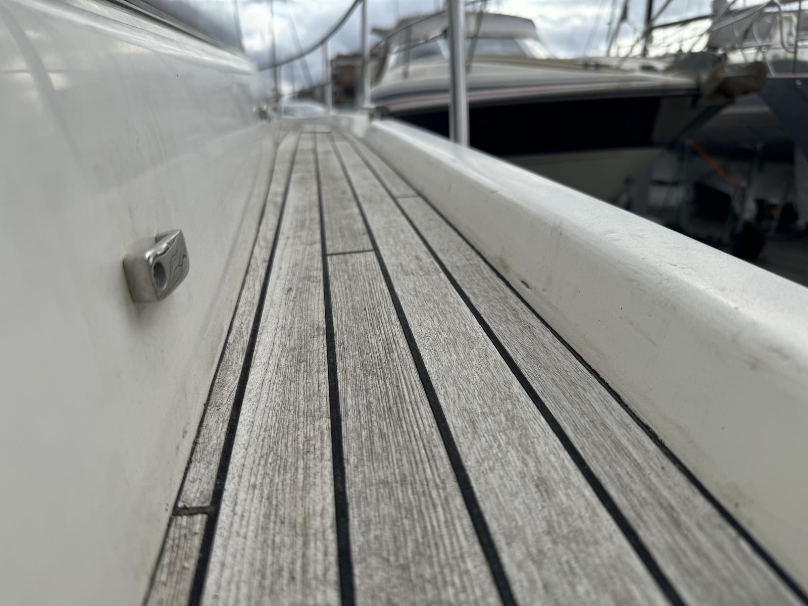 Ce modèle du chantier allemand, montre un aménagement remarquablement agencé pour une coque de 9 m. Avec son espace couchage à l’avant et sa cabine arrière, sa cuisine et sa salle de bain, vous pourrez profiter de belles escales en mer en tout confort. Il dispose d’une plateforme de bain allongée en teck, de deux bains de soleil : l’un à l’arrière convertible en carré extérieur et le classique pont avant, le tout est teck.